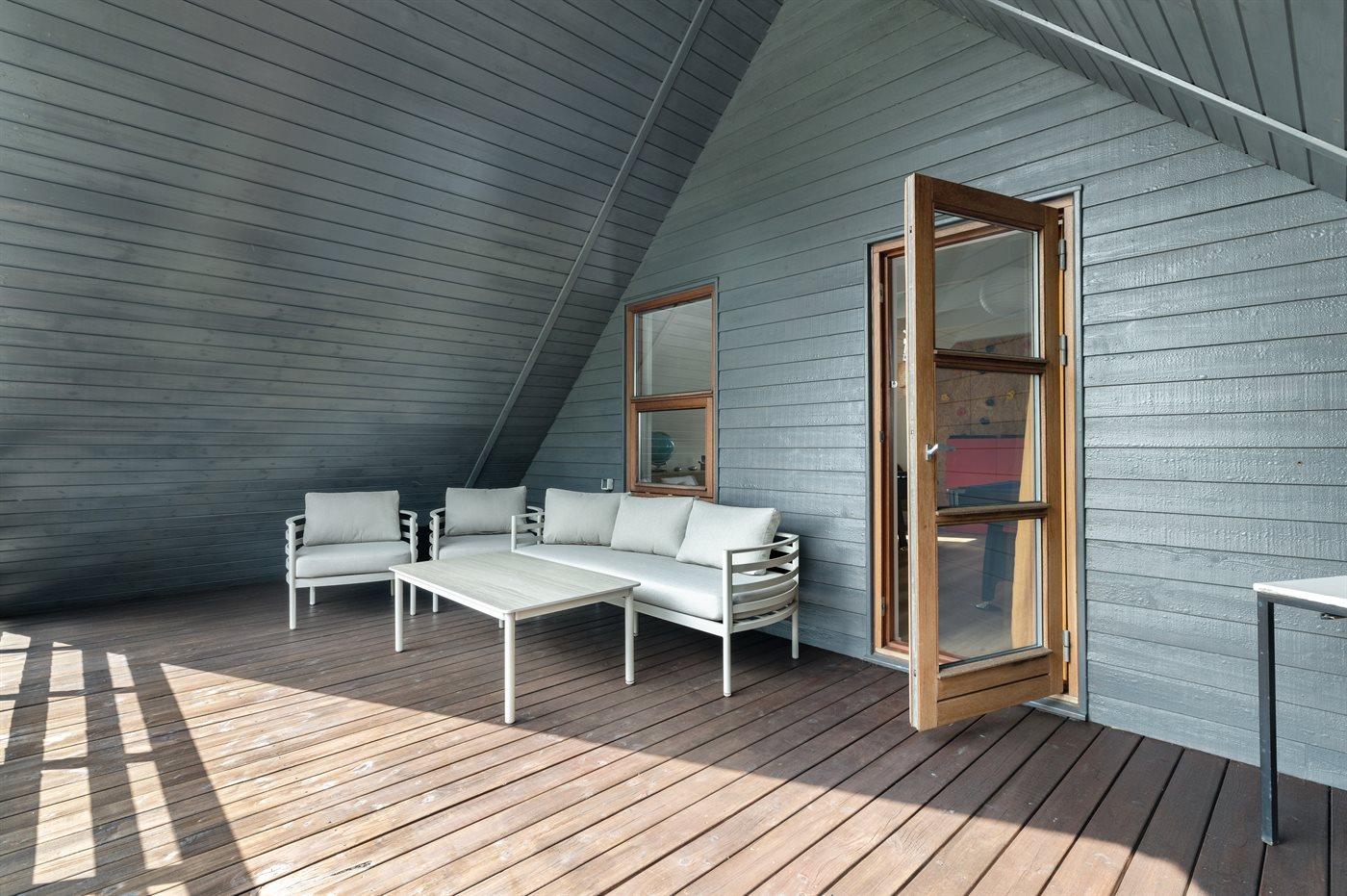 Dejligt stort og nydeligt sommerhus med plads til hele familien både ude og inde. Huset er godt indrettet på de to plan og har på 1. salen aktivitetsrum med flere aktiviteter, herunder klatrevæg. Fra aktivitetsrummet er der udgang til en dejlig altan med udendørs loungeområde.