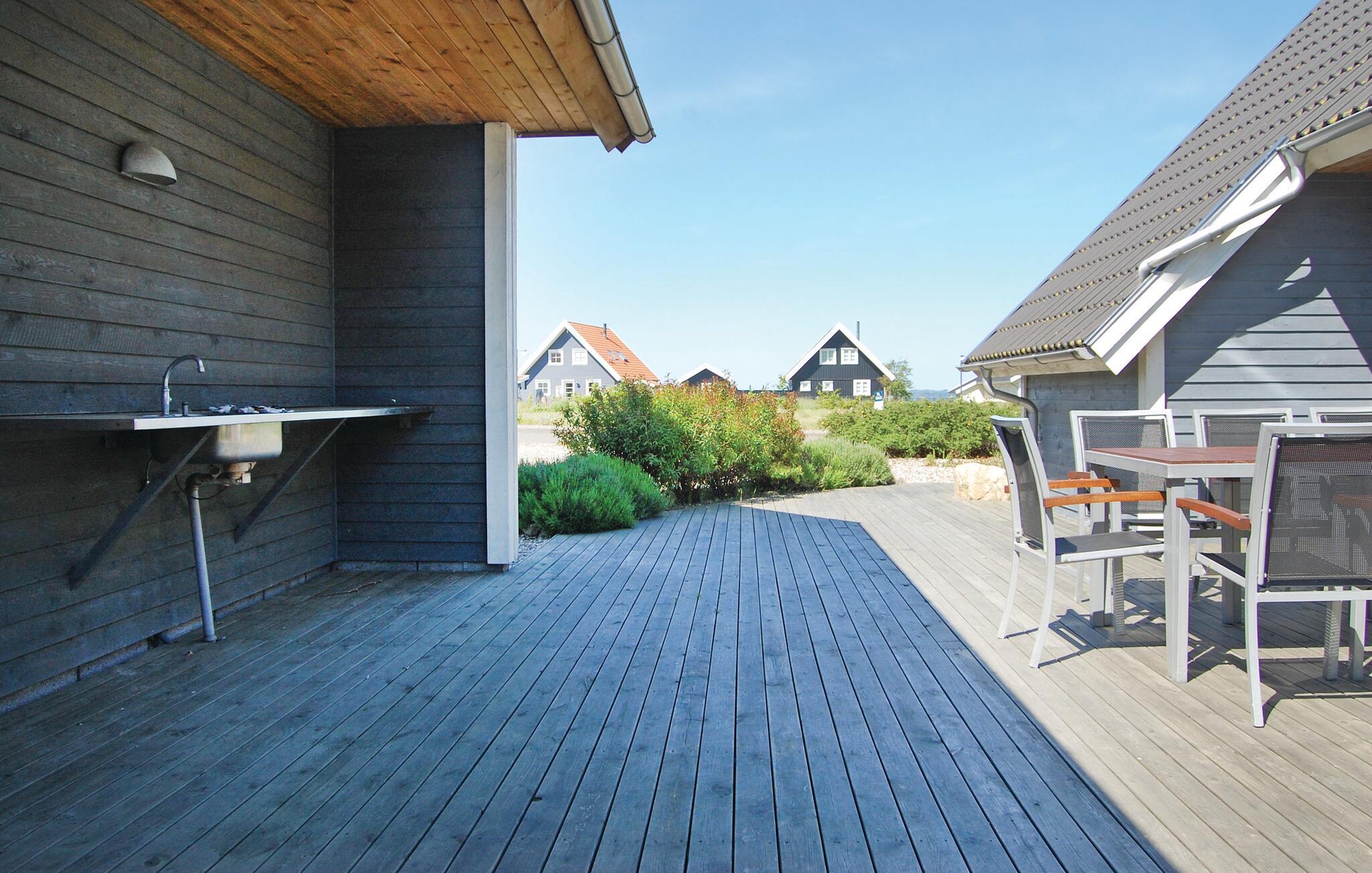 Dette dejlige og rummelige feriehus er opført i træ og ligger med udsigt ud over vandet.
