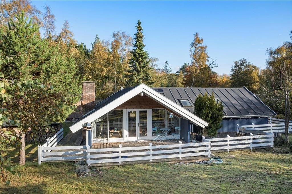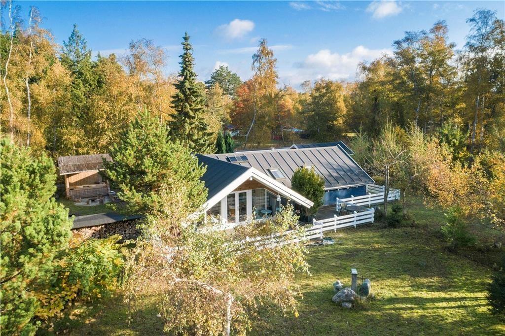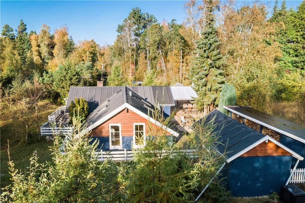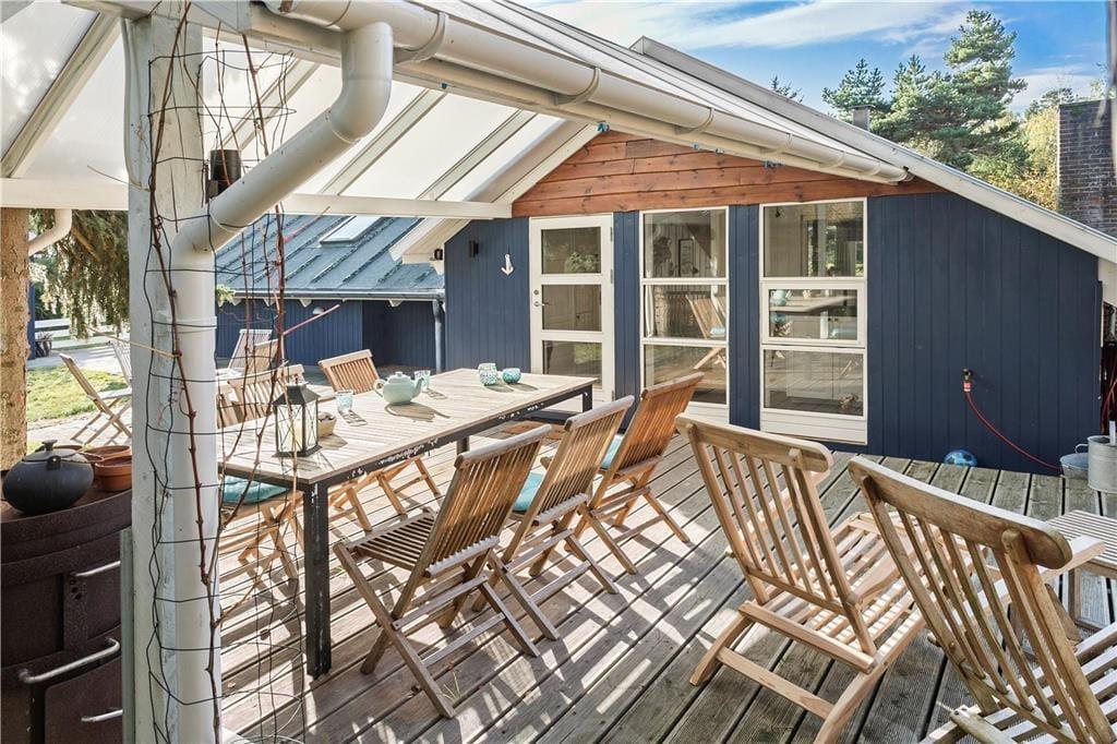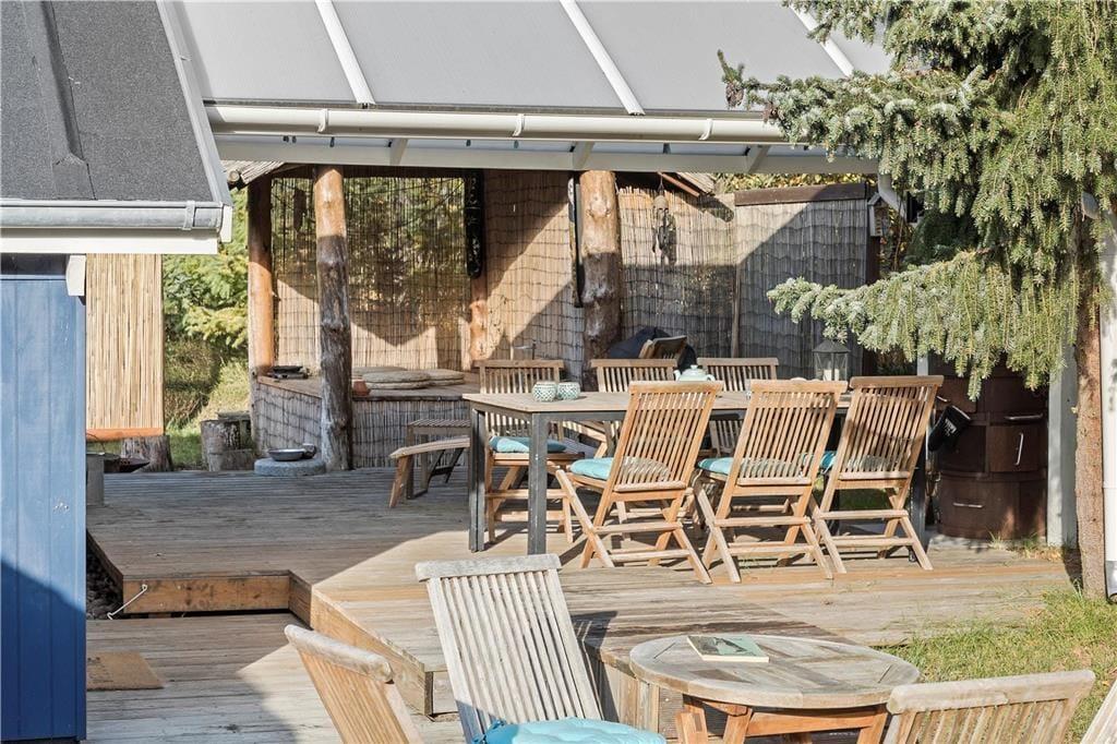 Fritidshuset ligger på en 1900 m2 stor grund som er delvist en naturgrund. Rundt om hele fritidshuset er der anlagt terrasse, den store terrasse som ligger bag huset er delvist overdækket og her er det helt ideelt at holde hyggelige stunder med familie eller venner.