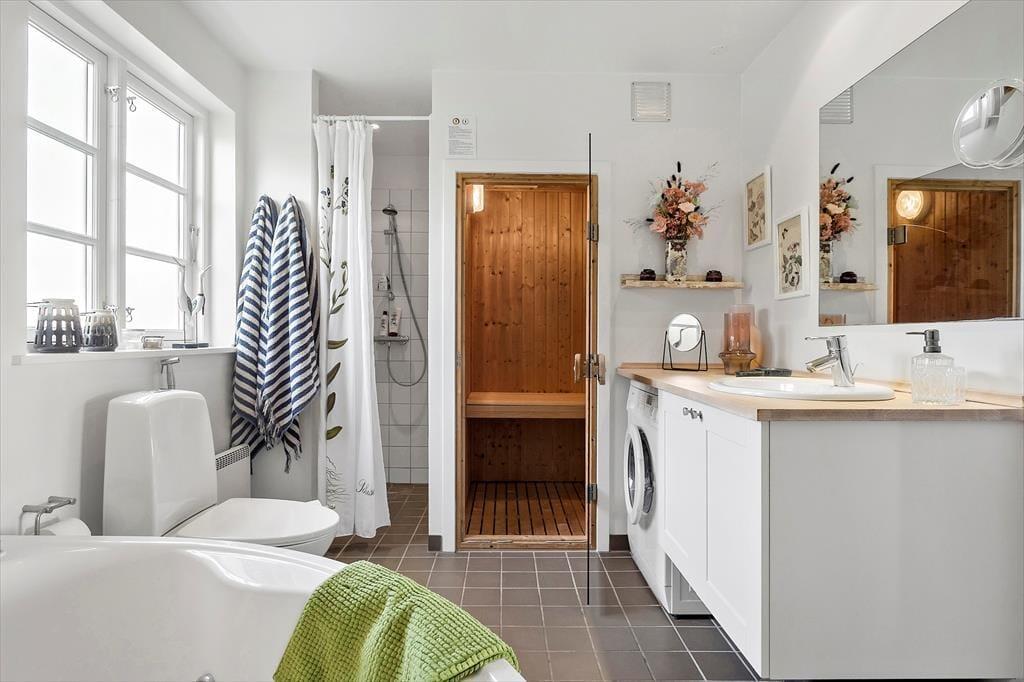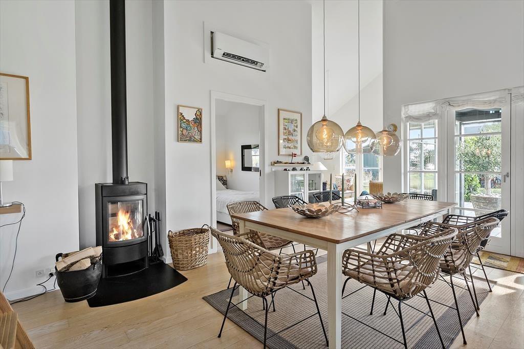 Sommerhuset indeholder en entre, med indgang til sommerhuset skønne køkken-alrum. Her er der spiseområde og sofaområde, samt udgang til sommerhuset skønne terrasse. I spisestuen er en hyggelig brændeovn, samt opgang til husets hems. Derudover har huset et stort badeværelse med wc, bruser, spabad, sauna og vaskemaskine. Dernæst har huset 3 gode soverum, med dobbeltseng i to af soveværelserne og 2 enkeltmandssenge i det sidste soveværelse.