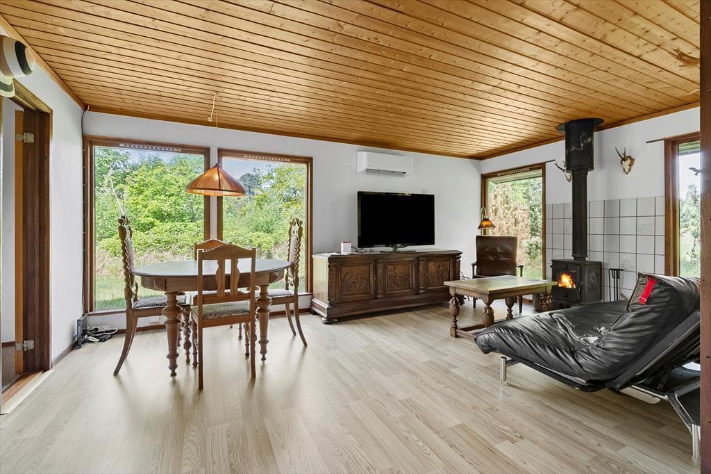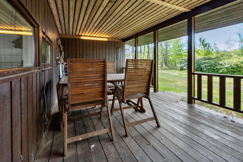 Sommerhuset er beliggende på en 1523 kvm stor grund med masser af plads til udendørs aktiviteter på græsplænen. Til huset er en terrasse der er overdækket, på terrassen er der havemøbler og grill. I haven er der et vildmarksbad og udendørs sauna, hvor hyggelige timer kan nydes.