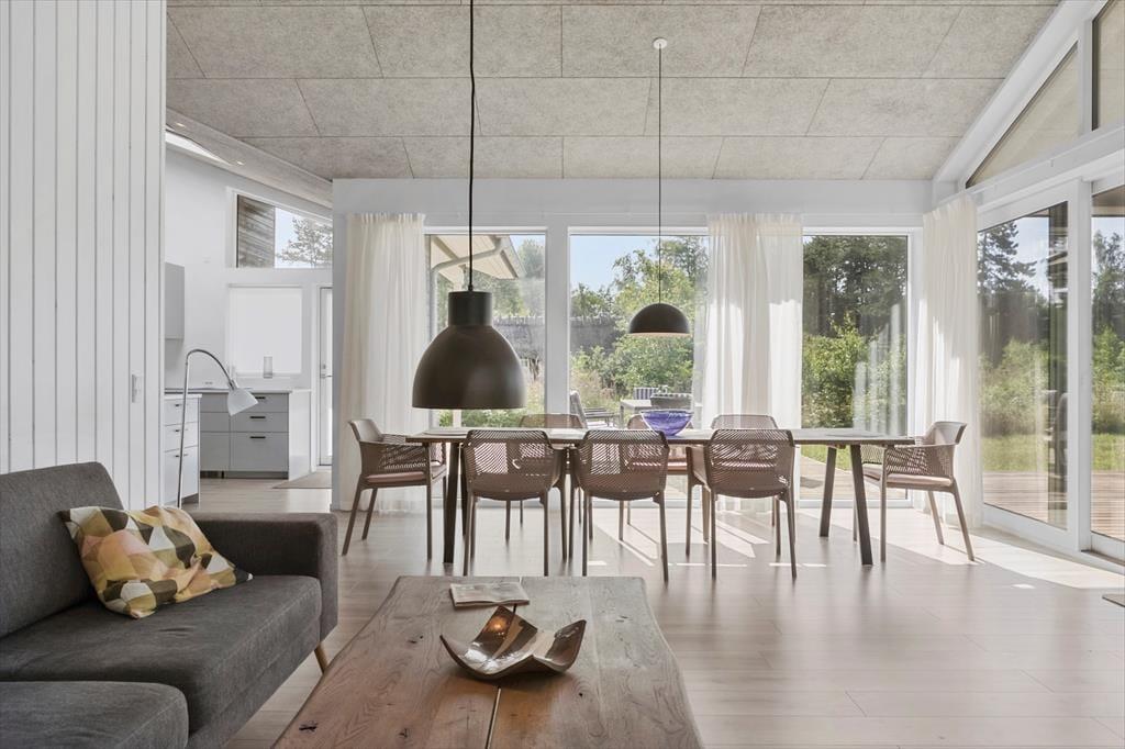 Husets hjerte er det store, åbne køkken-alrum med spiseafdeling i direkte forbindelse med det stilrene køkken. Stuen er hyggeligt indrettet med sofaområde, brændeovn og direkte udgang til den solrige, delvist overdækkede terrasse.