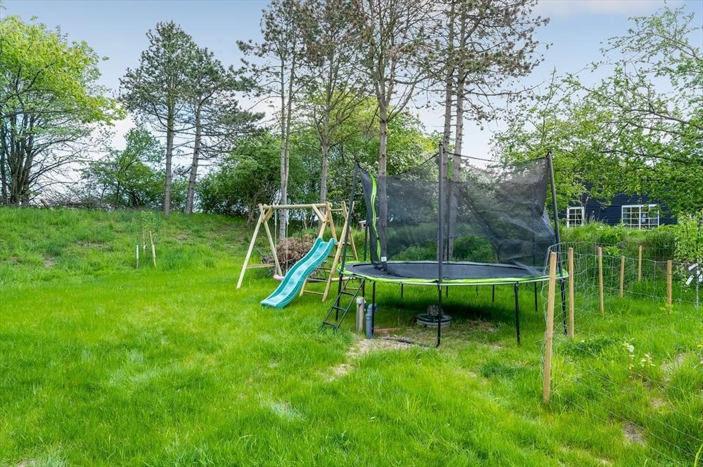 Udover en skøn træterrasse til at nyde solen, byder haven også på både legetårn og trampolin til de mindste eller barnlige sjæle.