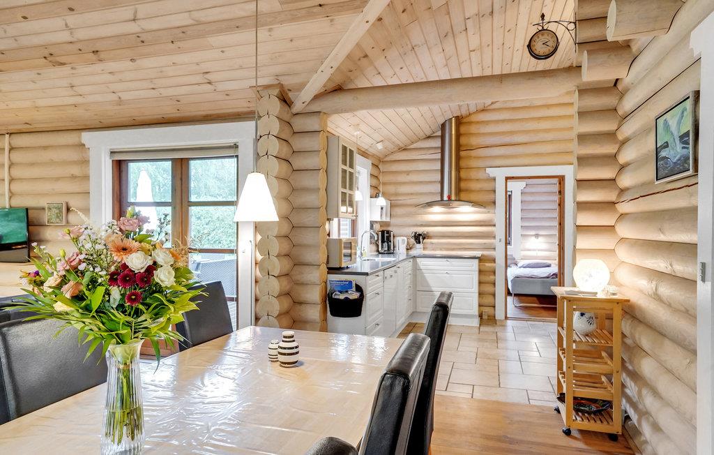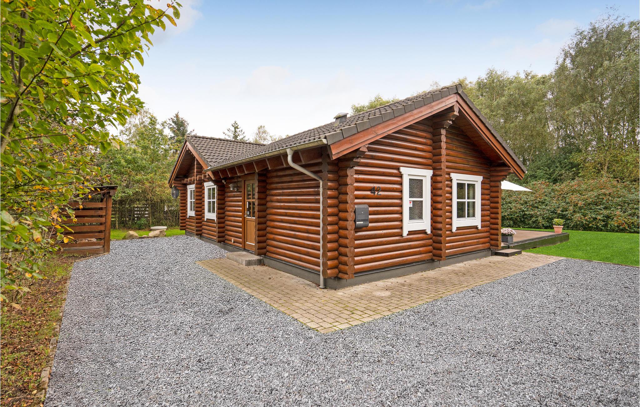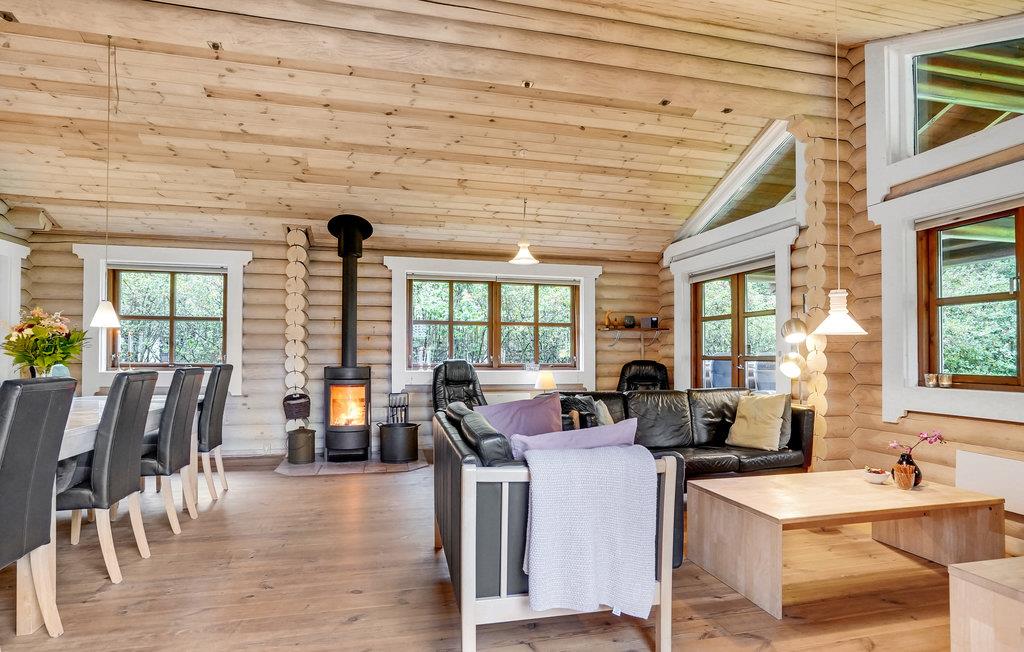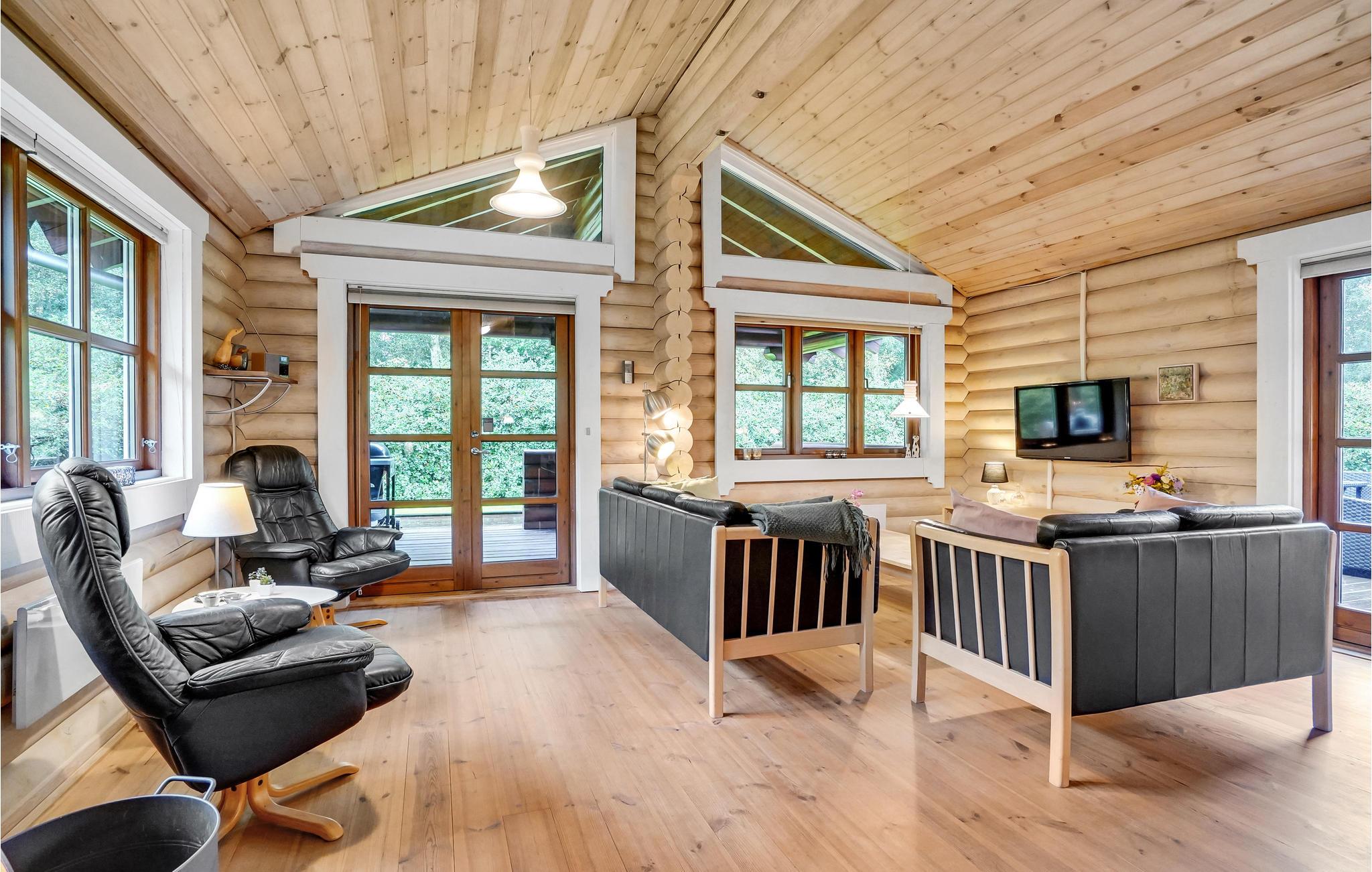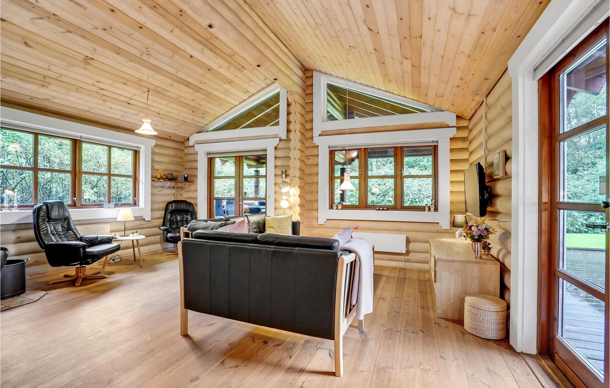 Dette flotte og spændende bjælkehus ligger på en naturgrund med bevoksning. Fra en mindre entré med klinkegulv går I direkte ind i det hvide elementkøkken, der er velfungerende og utroligt veludstyret. Stuen har synlige bjælker og loft til kip, hvilket får den til at virke særligt rummelig. Den er indrettet med en dejlig spiseplads og et komfortabelt sofaarrangement. Møbler og billeder fremhæver husets hyggelige atmosfære. Fra stuen er der udgang til terrassen, der er omgivet af bjælker i samme stil som husets.