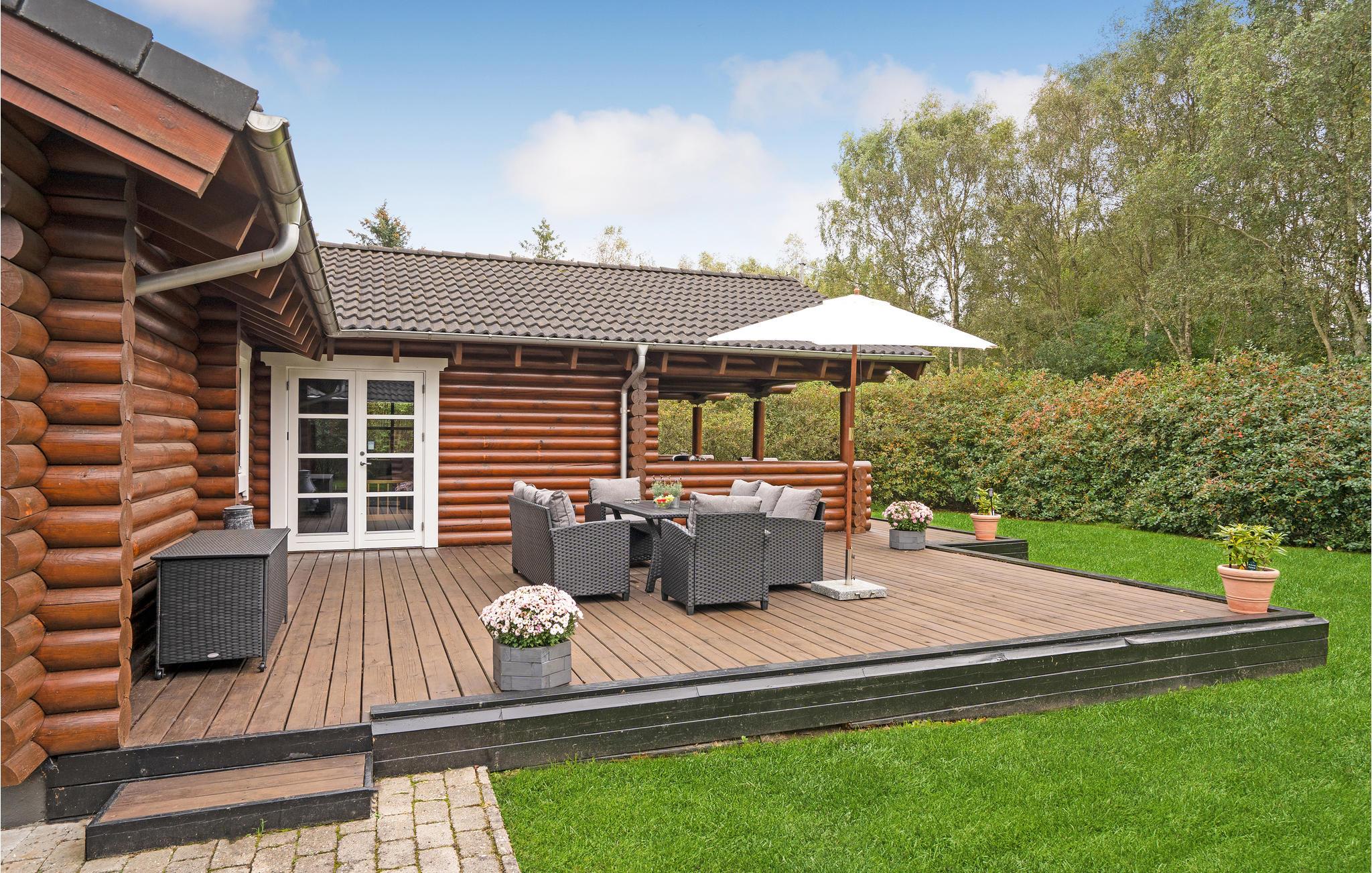 Hyggeligt bjælkehus i Farsø med spabad, terrasse og opladning til elbil på naturgrund.