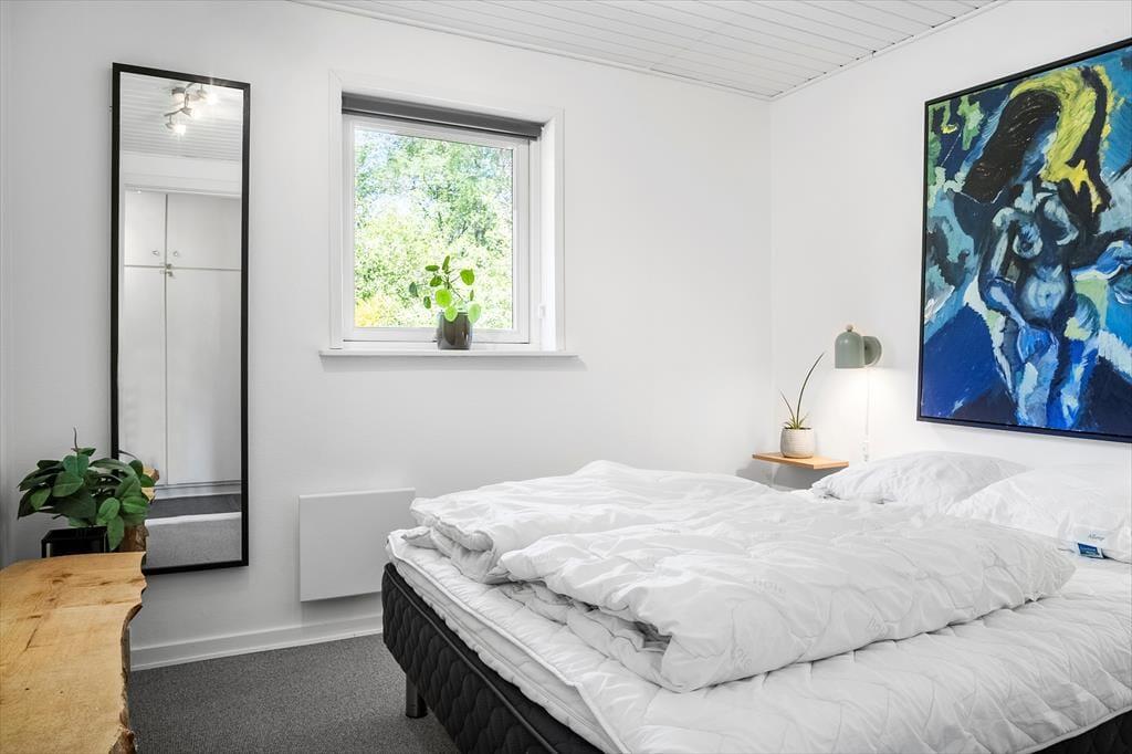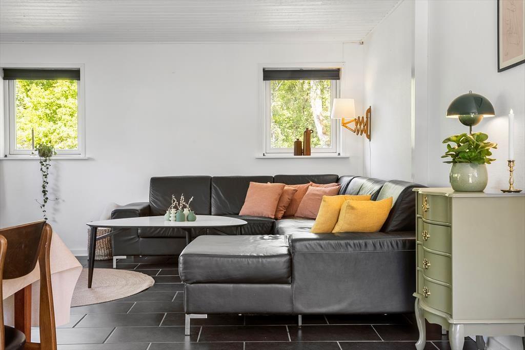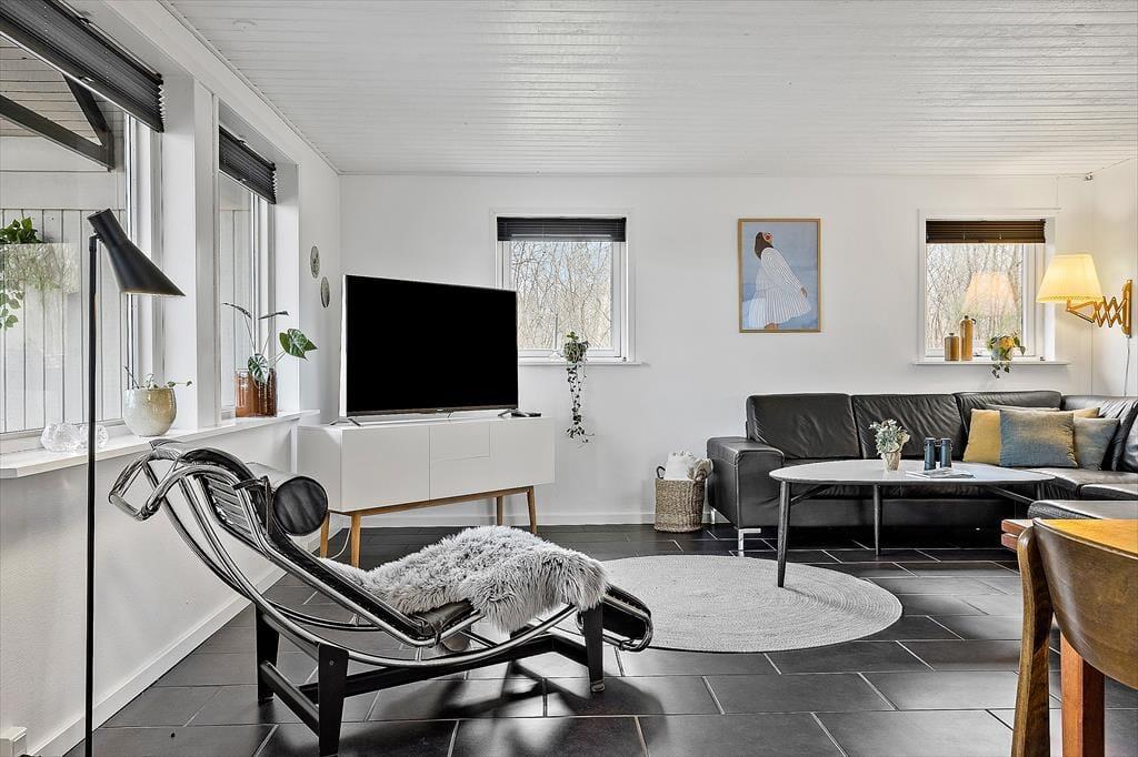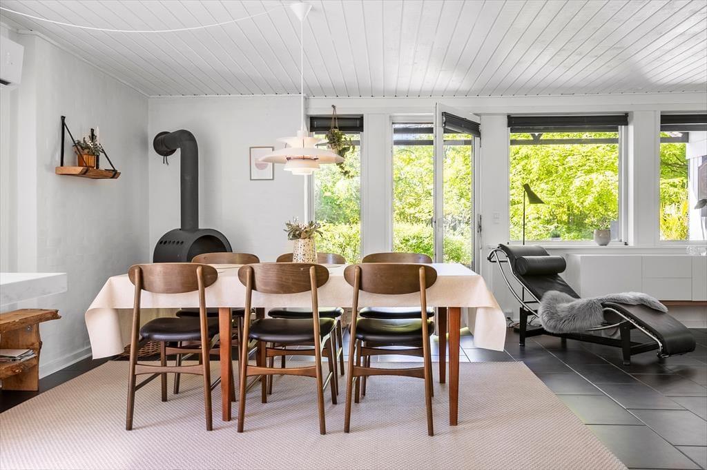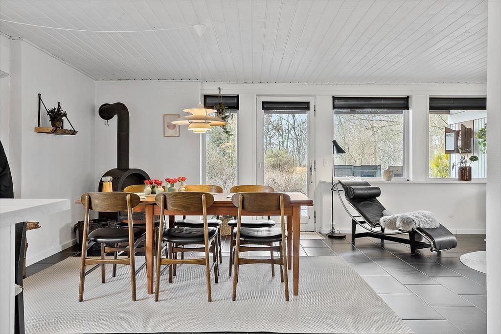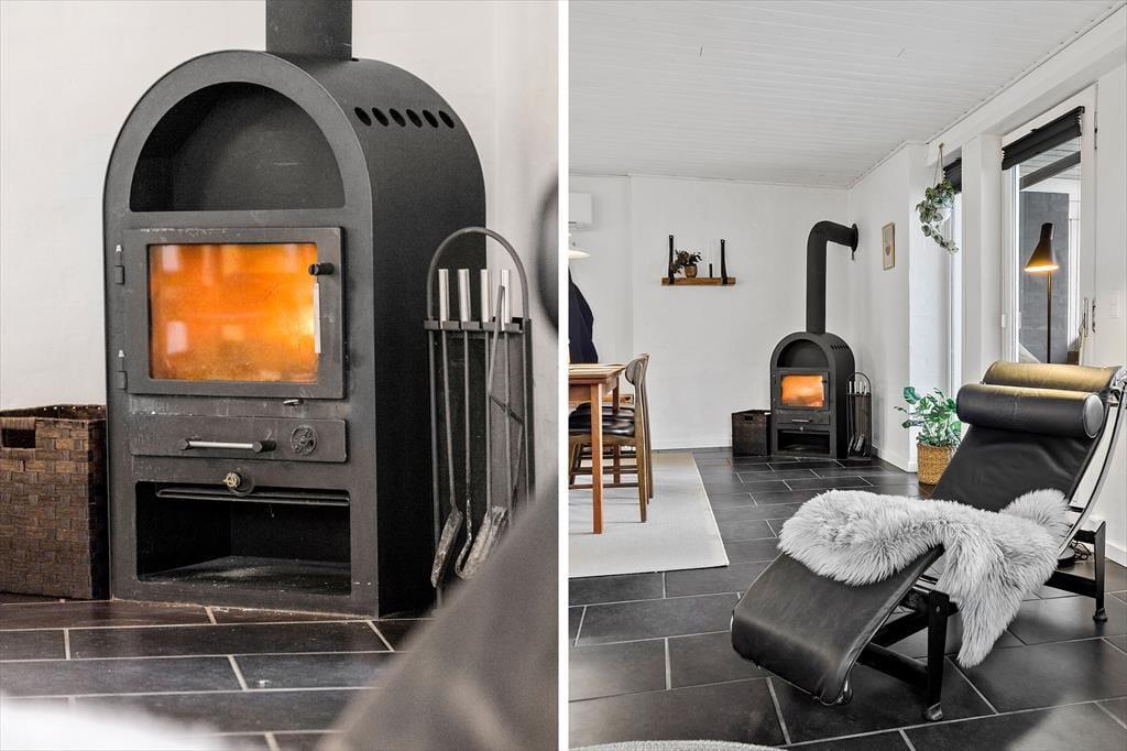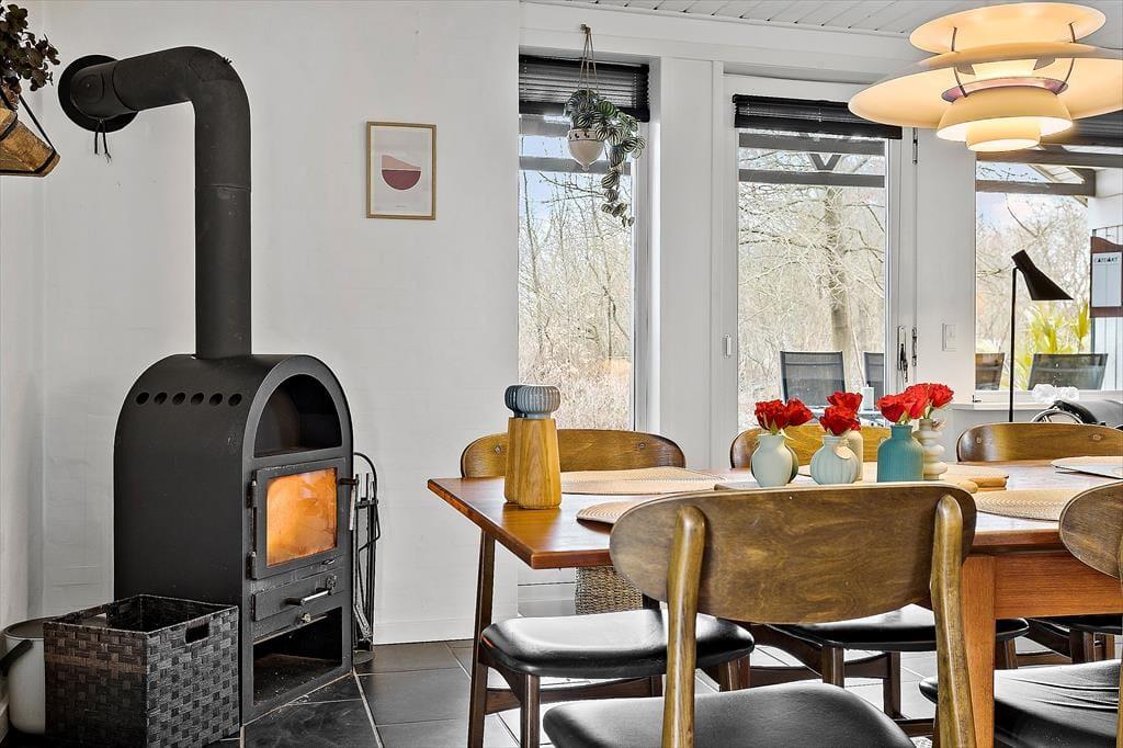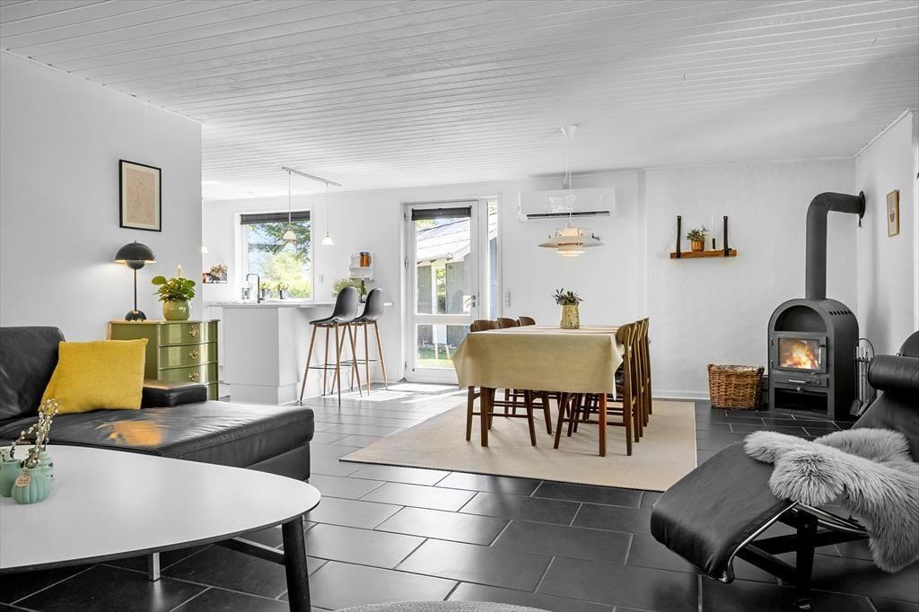 Indenfor mødes du af en hyggelig og afslappet stemning. Den åbne opholdsstue forener køkken, spiseområde og sofaafdeling, så her kan familien samles om alt fra madlavning til aftenhygge. Brændeovnen skaber en lun atmosfære på de køligere dage, og de store vinduer lader dagslyset strømme ind i rummet. Huset har flere soveværelser, så der er plads til både familie og venner, og badet er funktionelt og velindrettet.