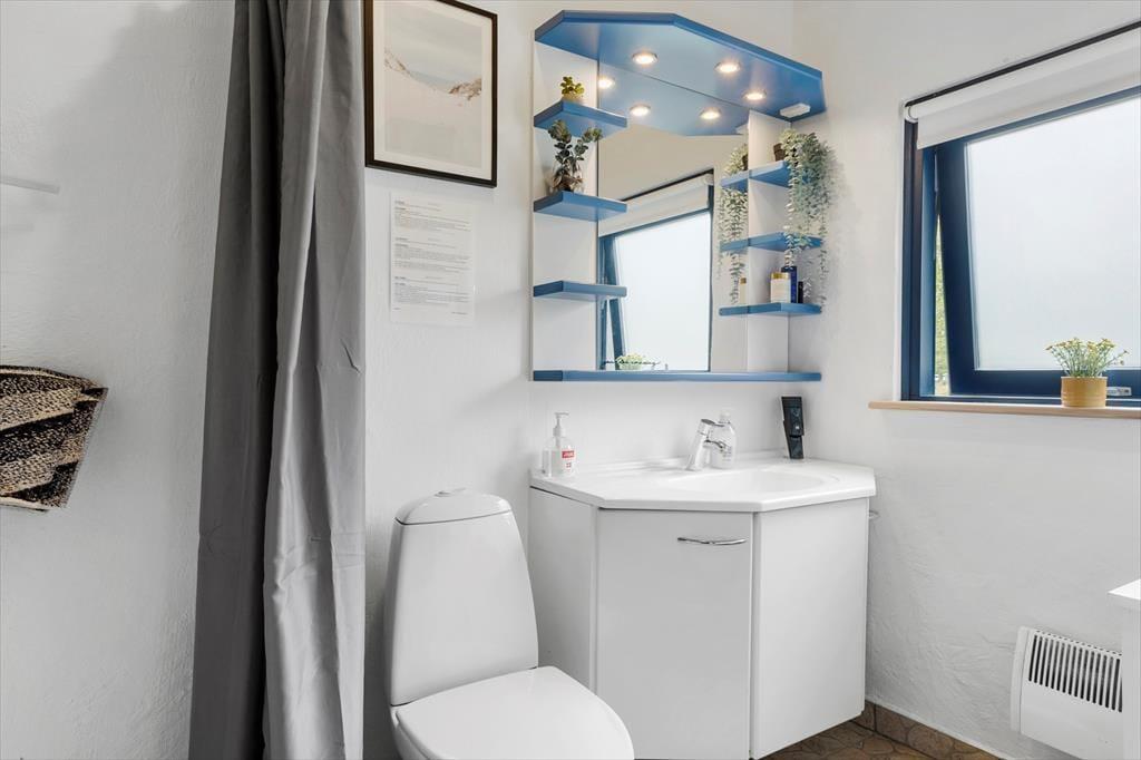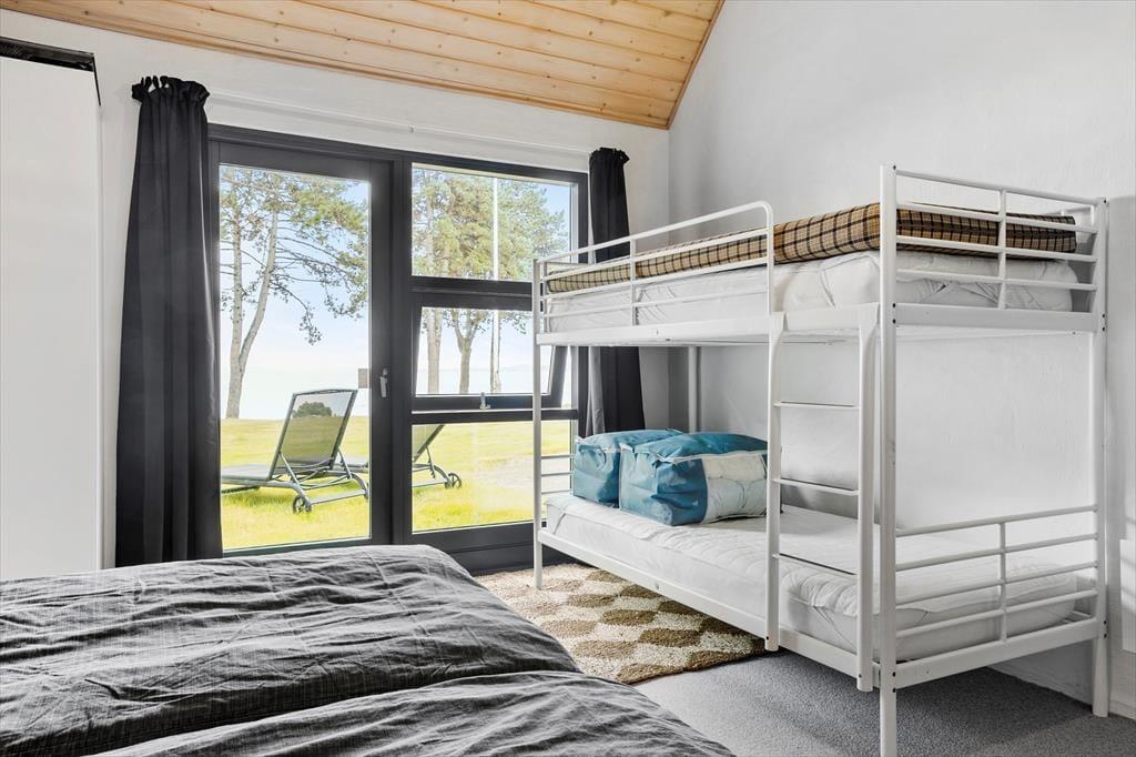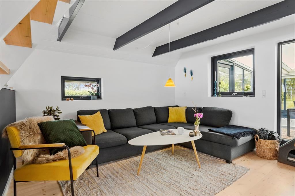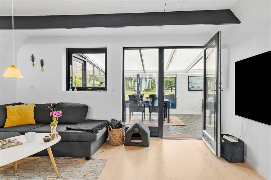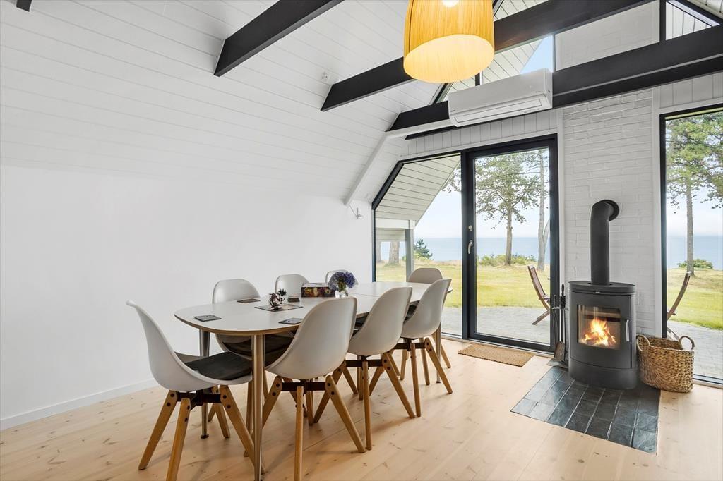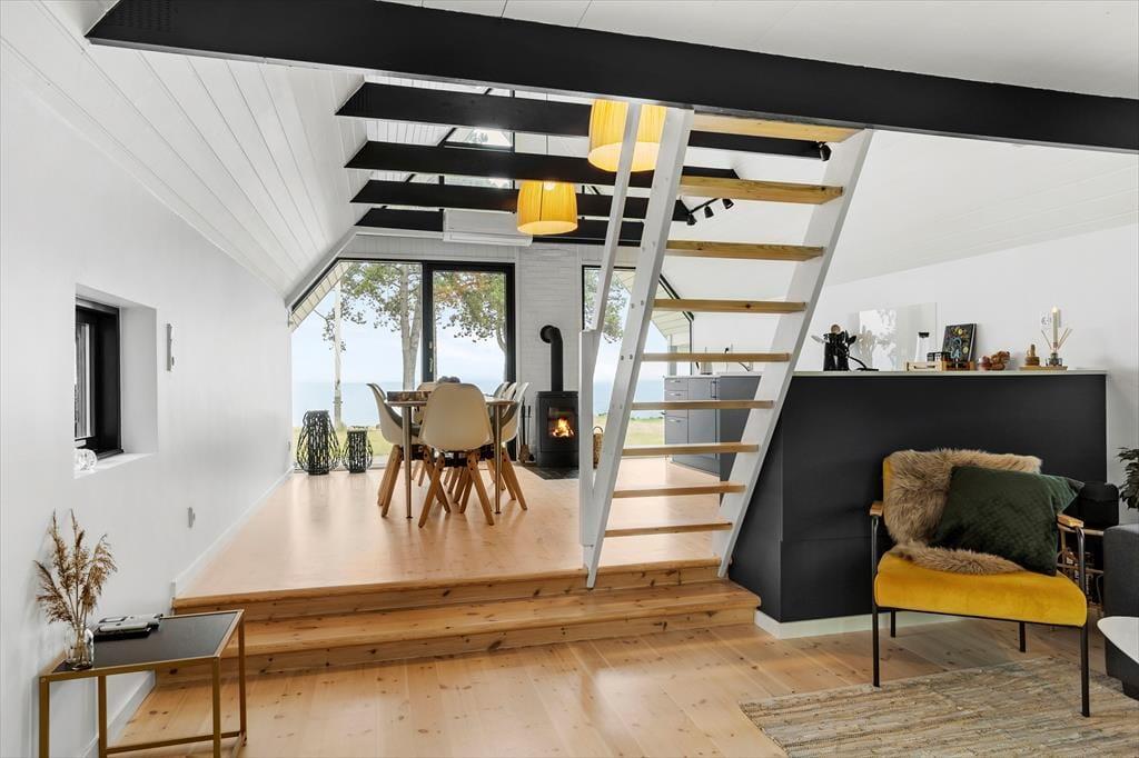 Sommerhuset ligger bare 70 meter fra kysten, så hvis du drømmer om en rigtig strandferie, har du kig på det helt rette sted. Efter en vellykket modernisering i 2024 har alle rum en indbydende indretning og en lys atmosfære. Planløsningen er gennemtænkt, så tre soveværelser og et badeværelse ligger samlet i den ene ende af huset, mens køkken og stue er i åben forbindelse, så både dagslyset og hyggesnakken har fri passage. En havestue forbinder soveafsnittet og opholdsafdelingen, så den er nem at tage i brug, hvis du gerne vil sidde i nærkontakt med haven – og fra køkkenet fører en trappe op til hemsen, der med madrasser, legetøj og spillekonsol hurtigt kan blive børnenes yndlingssted inden døre. Fjordudsigten kan du nyde fra flere af rummene, men den er nu allerskønnest fra køkkenet takket være de store glaspartier i gavlen. Tænk, hvor skønt det bliver at sidde her med en kop morgenkaffe, mens solen slår smut på det blanke vand!