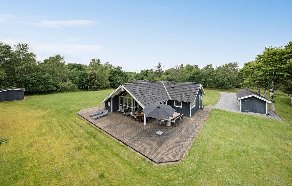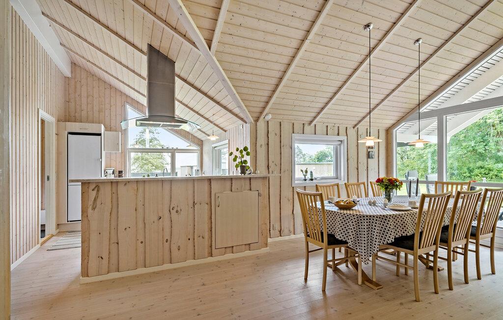 Velkommen til et lyst og klassisk sommerhus med højt til loftet. Her er der også højt til himlen og masser af plads omkring jer på den store grund. Efter en dag med oplevelser kan I vende hjem til husets skønne rammer, gode faciliteter og wellness i form af sauna og spabad. Begynd dagene med morgenmad rundt om det lange spisebord og nyd udsigten til den grønne have. I kan også tage kaffen med udendørs og fylde lungerne med den friske luft. Fyld dagene med hyggestunder i haven, hvor børnene kan løbe og lege eller sæt jer godt til rette og nyd den skønne udsigt ned mod fjorden.