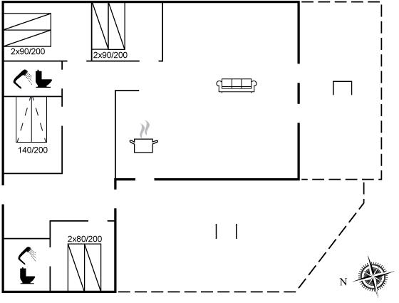 Der er i alt 4 soveværelser. Sovepladserne fordeler sig på: 4 sovepladser i dobbeltsenge. 4 sovepladser i enkeltsenge.