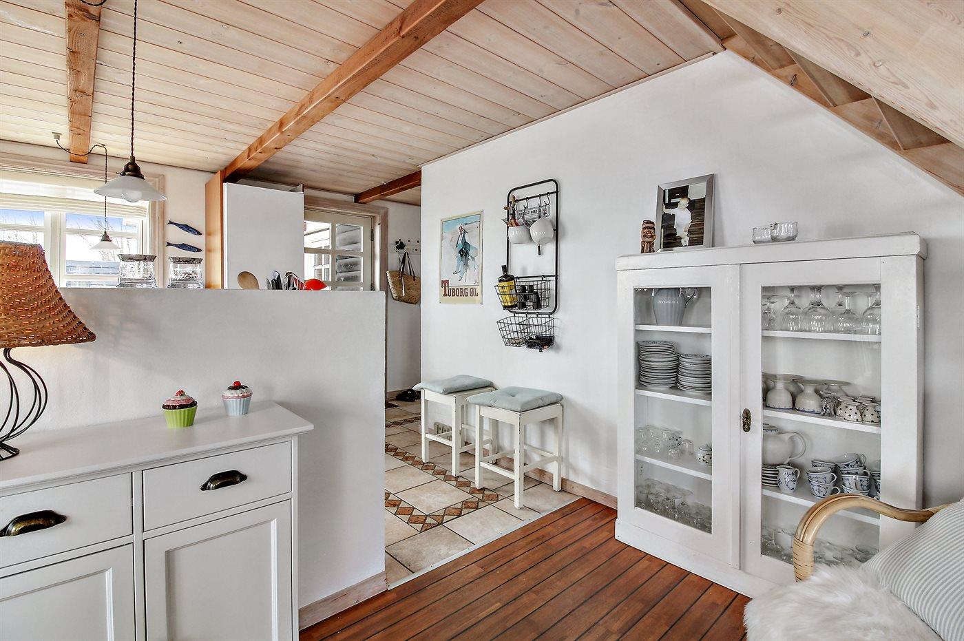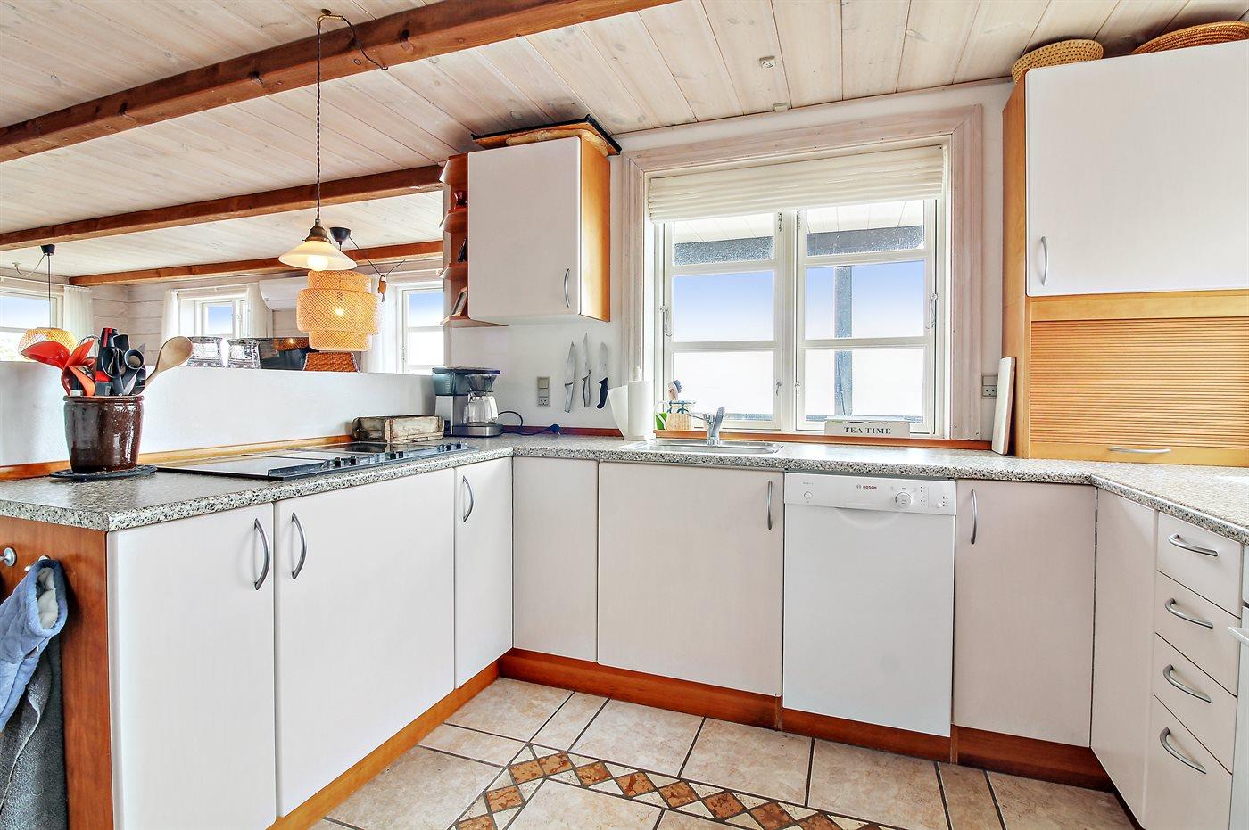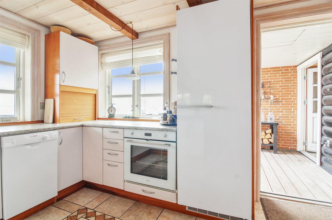 Køkkenet er udstyret med 1 køleskab. Der er 4 keramiske kogeplader, varmluftovn, mikrobølgeovn samt opvaskemaskine Der er gulvvarme i køkkenet.