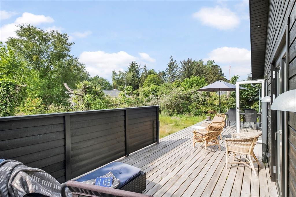 Fra det største soveværelse og stuen har I direkte adgang til den lækre træterrasse, der breder sig rundt om huset. Det betyder, at der er flere gode opholdspladser at vælge imellem – og hvis I trænger til at skylle salt og sandvand af kroppen, når I vender hjem fra strandturen, er der tilmed en udendørs bruser. Til bilen er der carport.