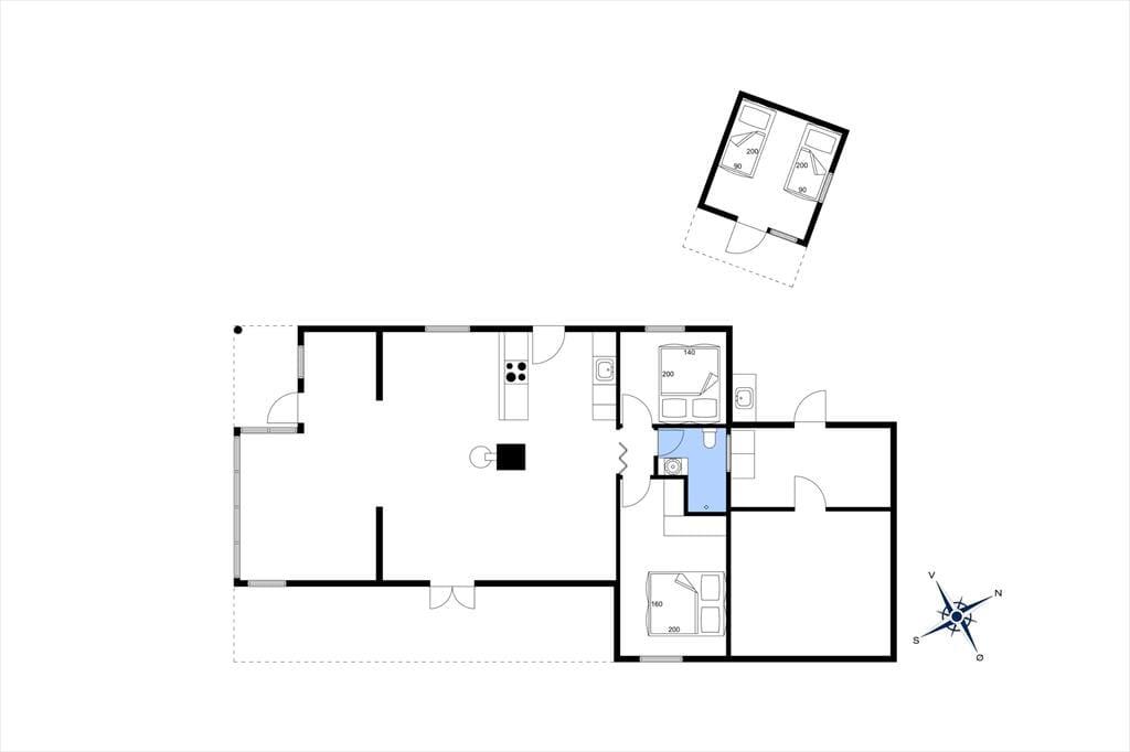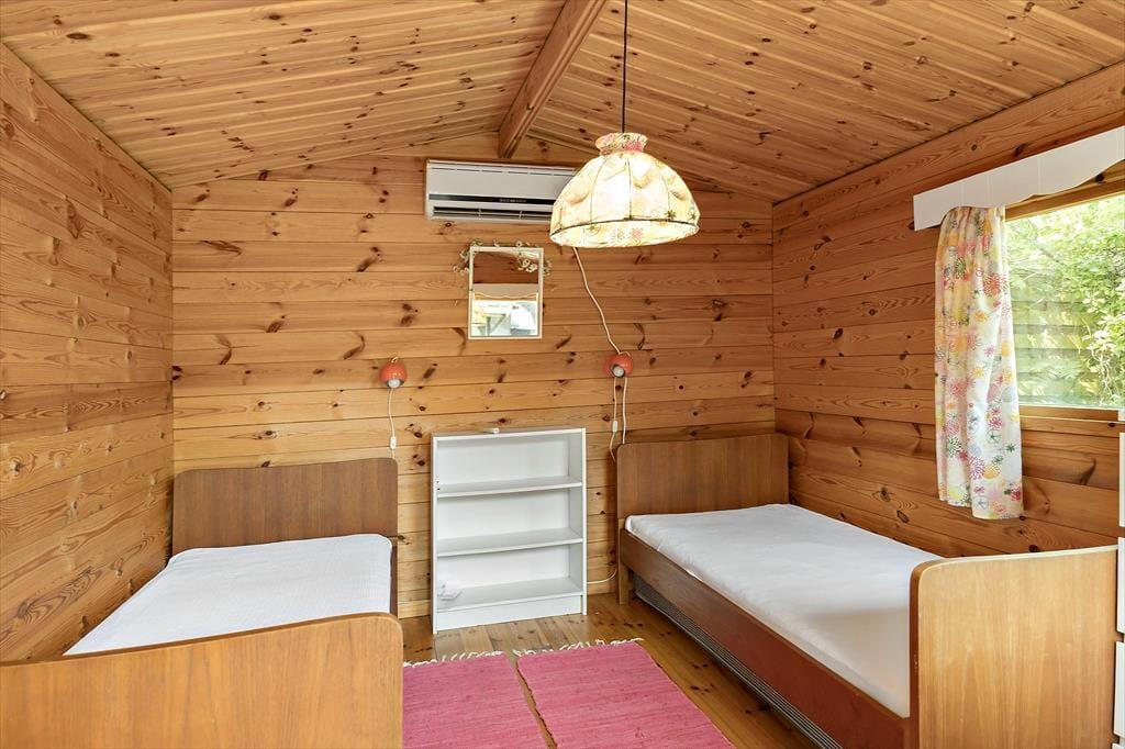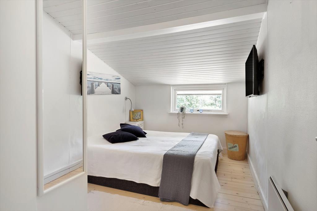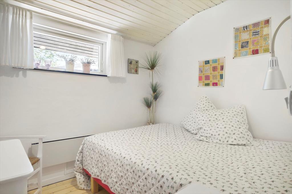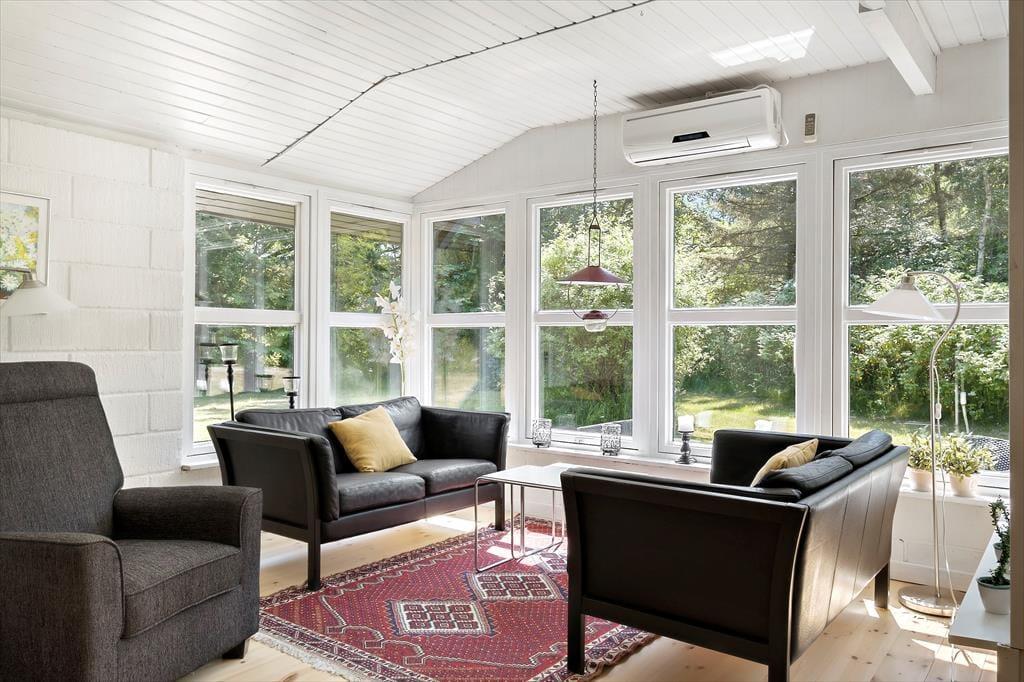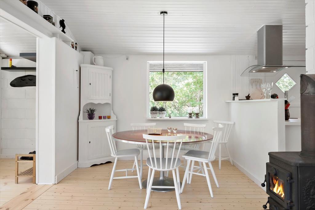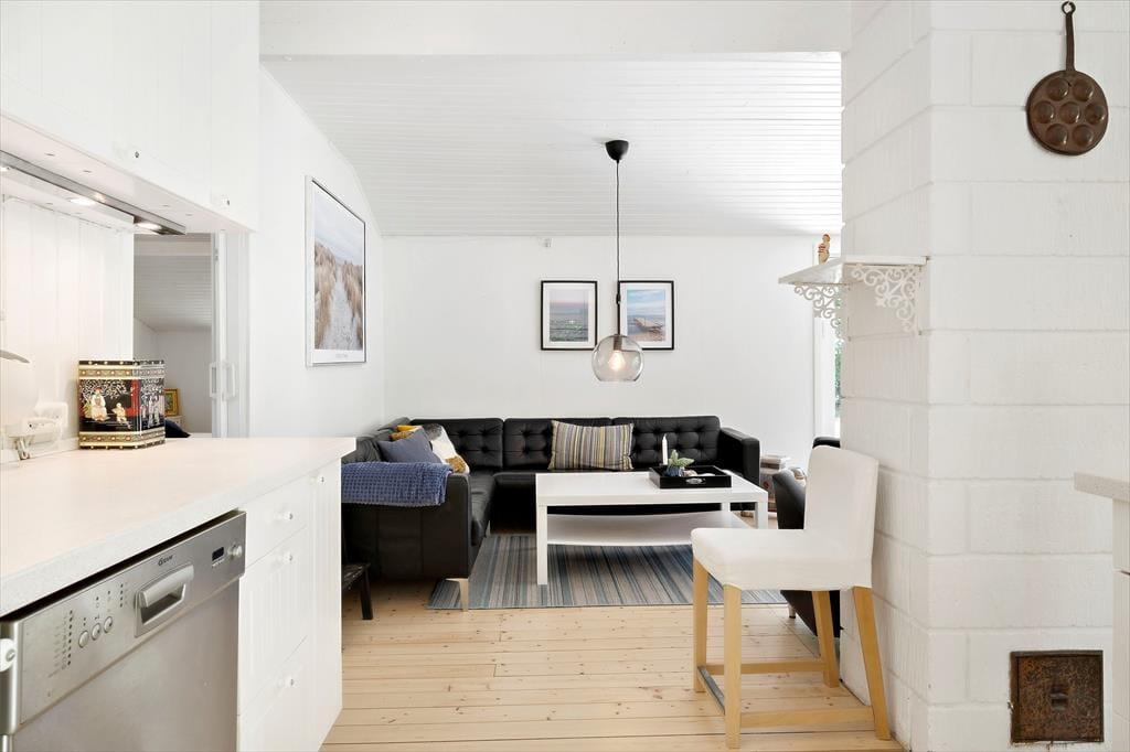 Inde i det 69 m2 store sommerhus er der rart at være. Stuen er rummelig og indrettet med flere gode siddepladser – blandt andet med sofaarrangement nær brændeovnen og en spiseplads ved det integrerede køkken. Endnu en sofakrog er placeret ved et stort sydvendt vindue, så her kan I slappe af i en solstråle og samtidig have fin udsigt til den grønne have. I den anden ende af huset ligger to gode soveværelser og et badeværelse med bruser, og i annekset står der to ekstra senge, så I kan være seks personer i alt. Vaskemaskine og tørretumbler findes i udhuset.