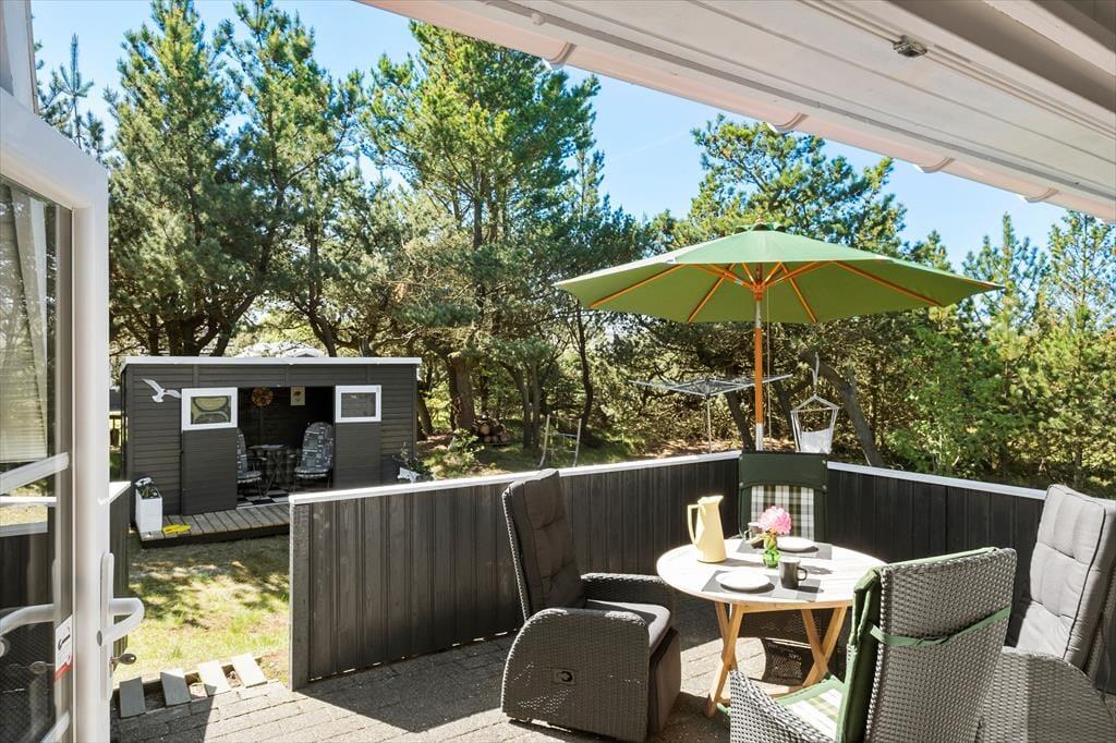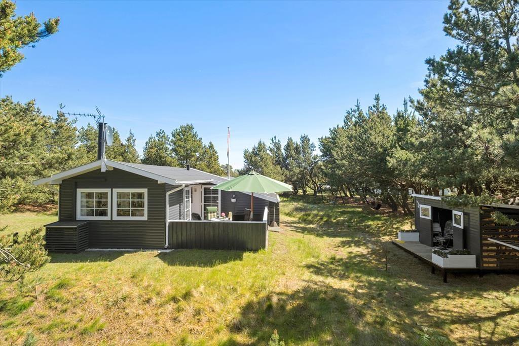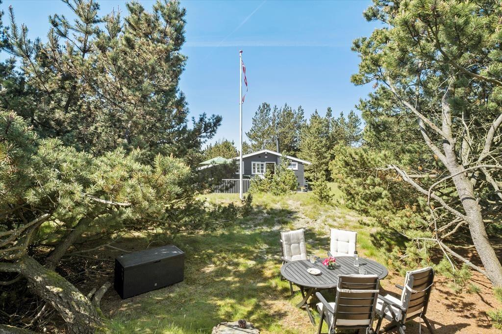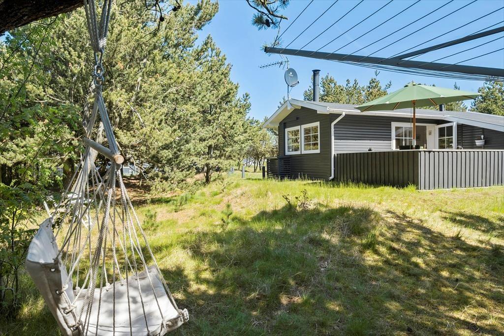 Den 1202 m2 store naturgrund rammes smukt ind af høje fyrretræer, og rundt om sommerhuset er der en god græsplæne at lege på, hvis børnene skal aktiveres. Der er for øvrigt også gynge til de yngste feriegæster, mens alle aldersgrupper kan glæde sig til at sidde og slikke sol på terrasserne i de ugenerede omgivelser. Hvis du har været ude for at udforske lokalområdet, er det herligt at kunne sidde helt roligt, mens du lytter til fuglesang eller hyggesnakker med dine kære – og hvis du har samlet nok energi, kan du overveje, om du også lige skal nå forbi stranden endnu en gang, inden det er tid til at grille aftensmaden i det fri.