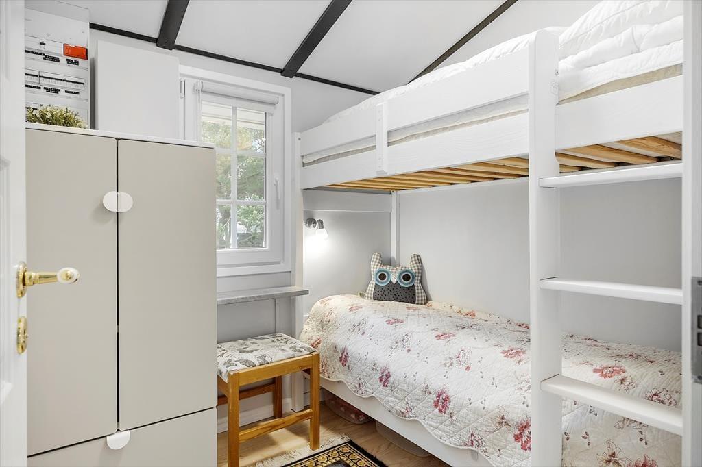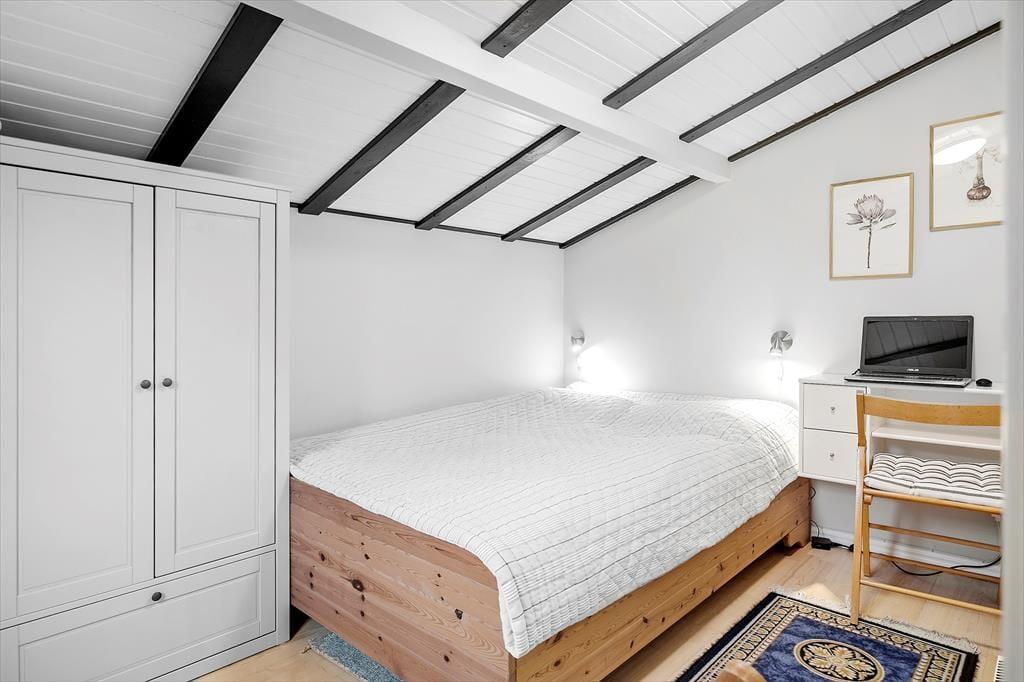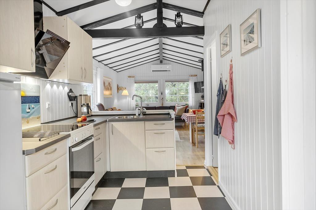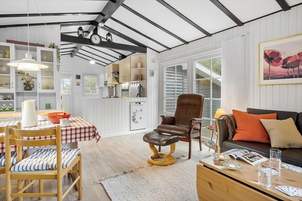 På en rigtig sommerhusferie skal der helst være afsat god tid til at spille terninger, løse krydsogtværser eller slappe af med andre tilbagelænede sysler. Sommerhusets lyse stue fungerer som en skøn ramme til det hele – også hvis du vil hygge dig med at bage boller eller forberede en god brunch i det åbne køkken. Hvis det er køligt udenfor, kan du tænde op i brændeovnen, inden du slænger dig i sofaen med en god film på fladskærms-tv’et. Og når det er ved at være tid til at sige godnat, kan du lige vende forbi badeværelset for at børste tænder, inden du går til ro på et af husets to soveværelser.