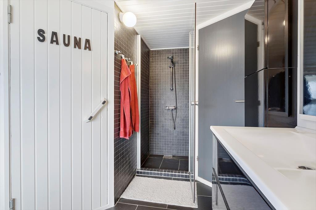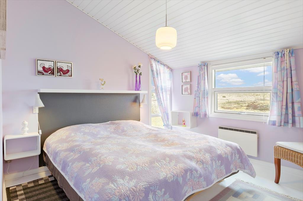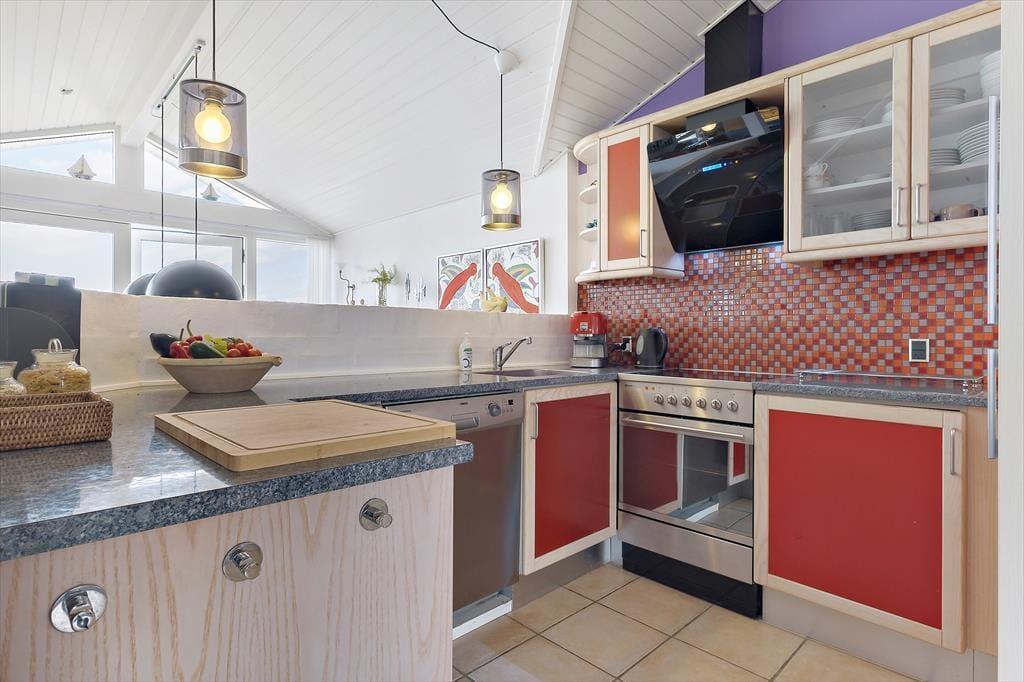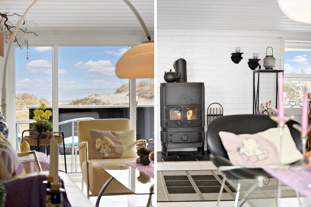Sandsynligvis er det havudsigten, der hurtigt fanger dit blik, men mange indretningsdetaljer inde i sommerhuset er nu også værd at bemærke. Særligt opholdsafdelingen er stor, lys og luftig, og der er flere gode hyggekroge, hvor du kan slænge dig med strikketøjet eller en god bog. En brændeovn står klar til at sprede varme, hvis det skulle blive aktuelt, og i køkkenet har du gode arbejdsforhold, når du vil forkæle dig selv og din familie med et lækkert måltid. På soveværelserne er der sengepladser til seks personer, og i forlængelse af badeværelset venter en sauna, hvis du har brug for at blive varmet igennem, når du vender hjem fra en havfrisk dukkert eller en gåtur på stranden.