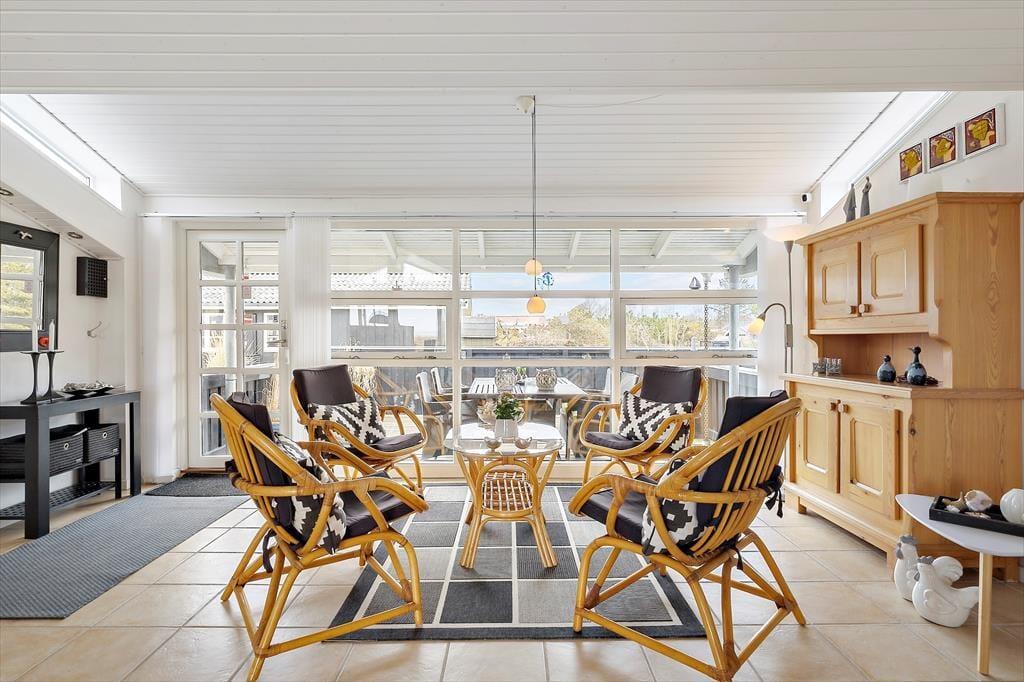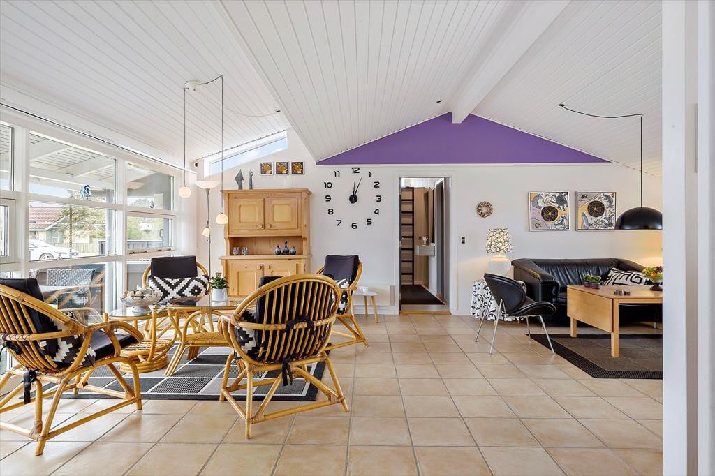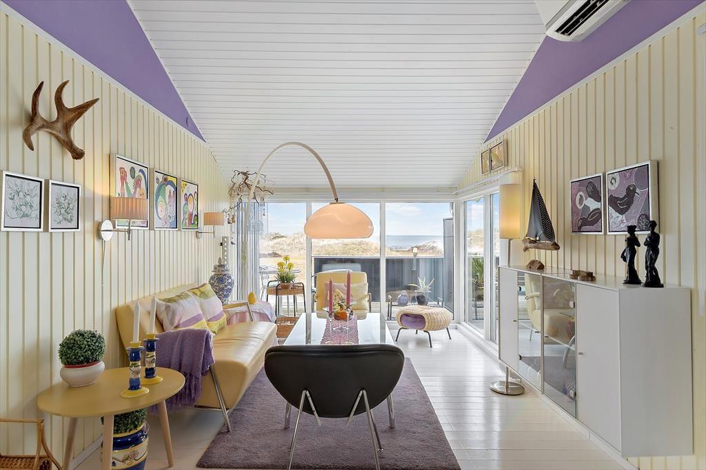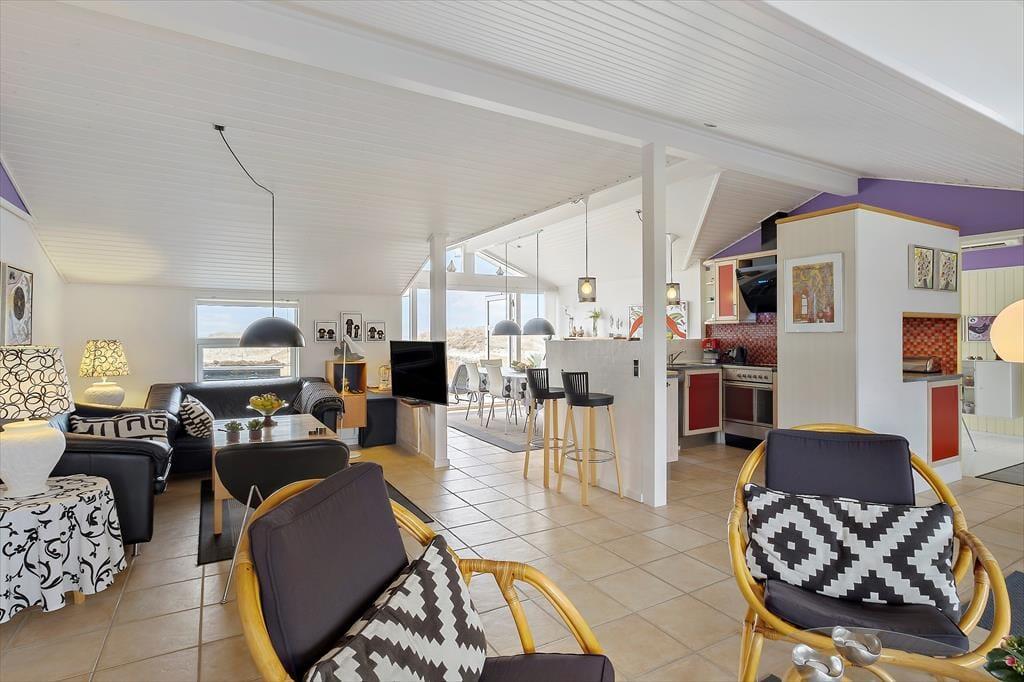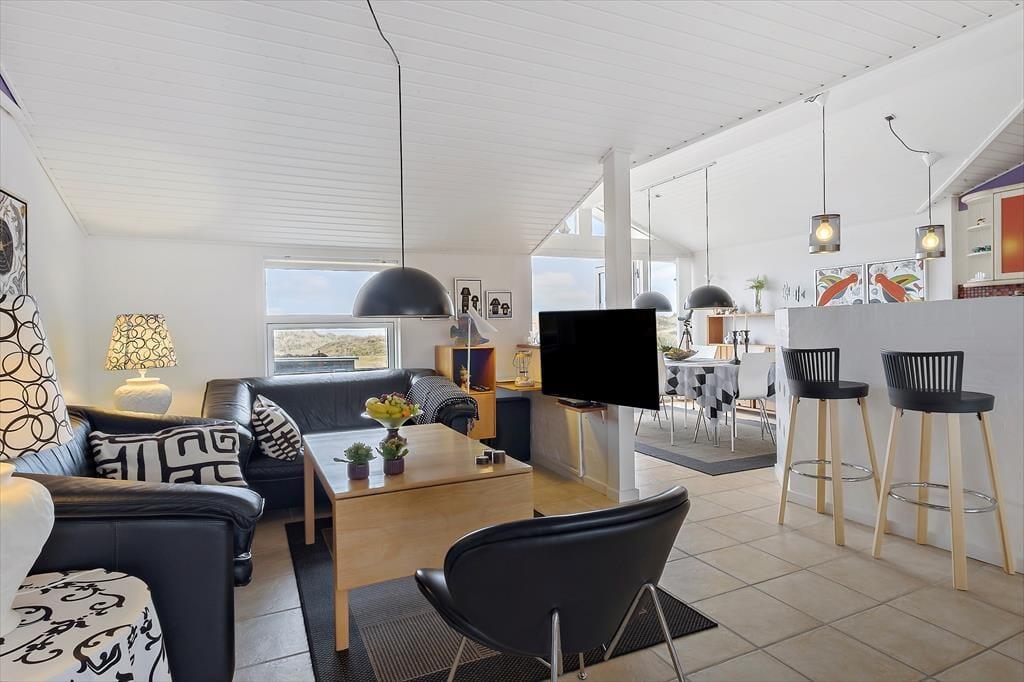 Sandsynligvis er det havudsigten, der hurtigt fanger dit blik, men mange indretningsdetaljer inde i sommerhuset er nu også værd at bemærke. Særligt opholdsafdelingen er stor, lys og luftig, og der er flere gode hyggekroge, hvor du kan slænge dig med strikketøjet eller en god bog. En brændeovn står klar til at sprede varme, hvis det skulle blive aktuelt, og i køkkenet har du gode arbejdsforhold, når du vil forkæle dig selv og din familie med et lækkert måltid. På soveværelserne er der sengepladser til seks personer, og i forlængelse af badeværelset venter en sauna, hvis du har brug for at blive varmet igennem, når du vender hjem fra en havfrisk dukkert eller en gåtur på stranden.