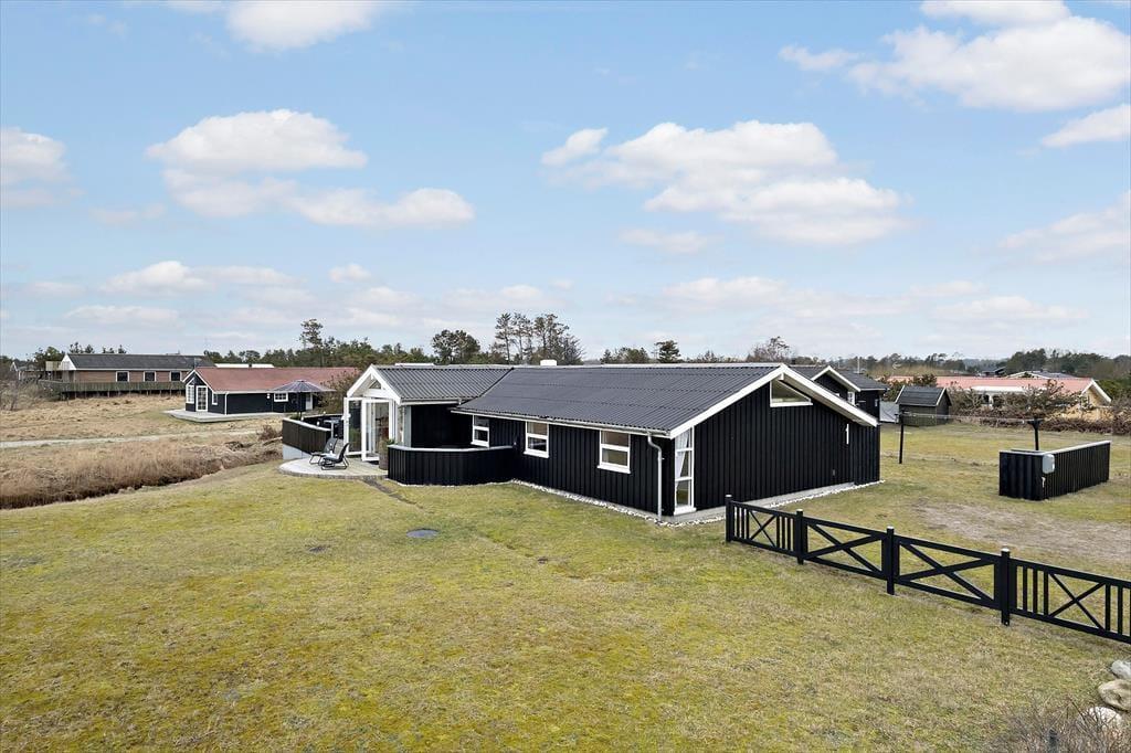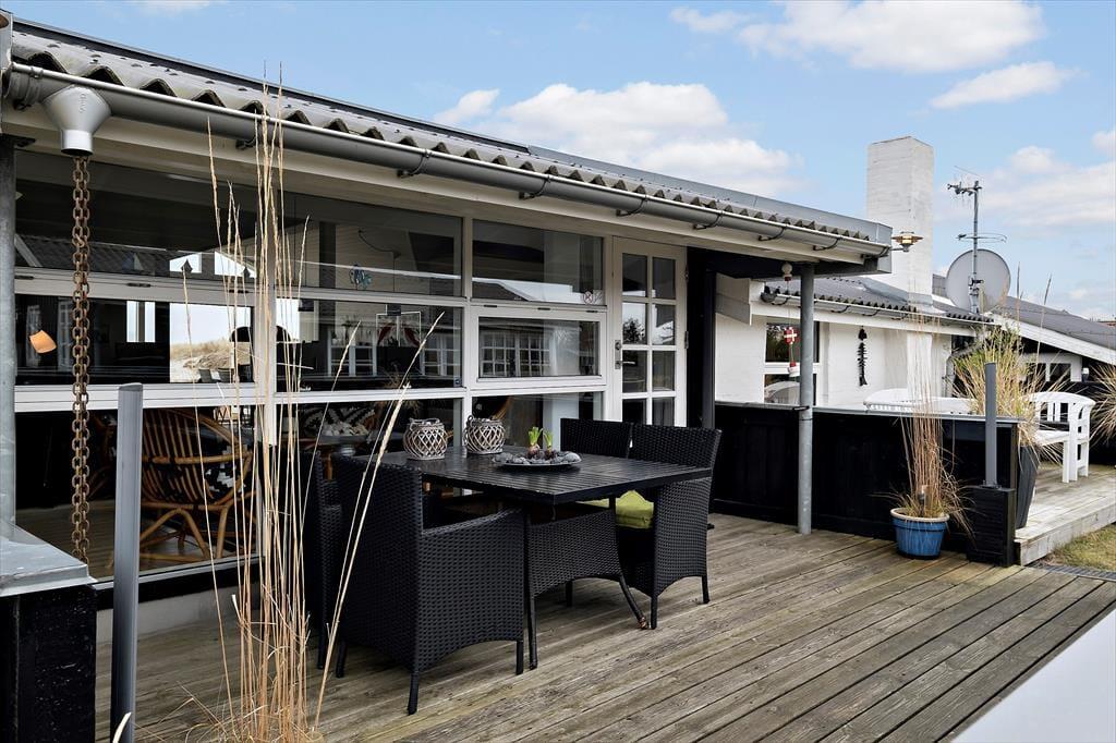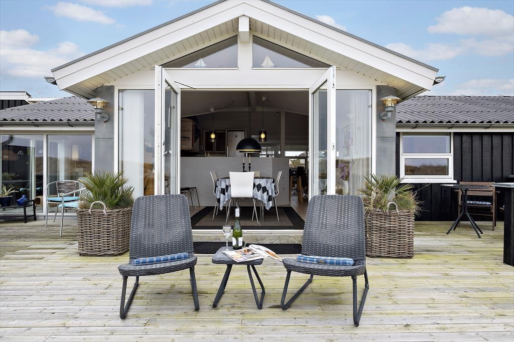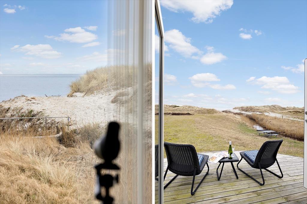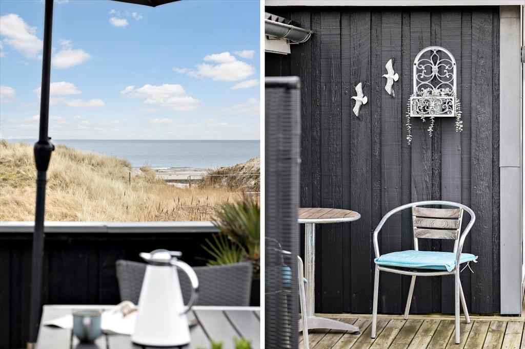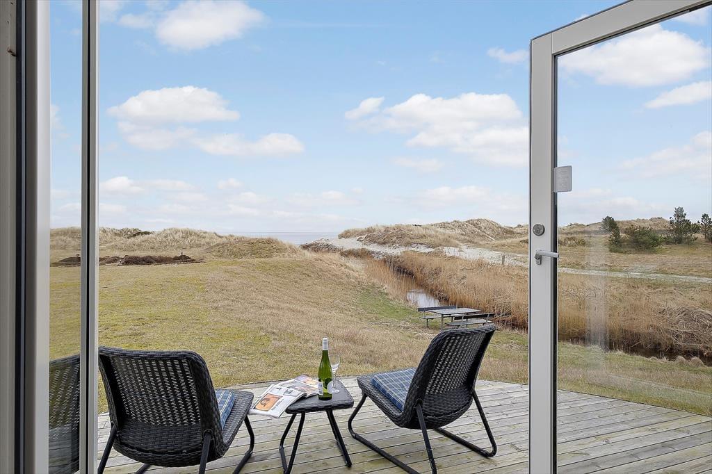 Også ude i det fri er der mange dejlige steder at slå sig ned, og uanset tidspunktet på dagen er der gode chancer for at finde en indbydende solkrog. Hvis du vil sidde med udsigt til havet og klitterne, er det selvfølgelig terrassen på husets østside, du skal gå efter – tænk bare, hvor skønt det bliver at sidde her, når solen er på vej op over himlen, og du har hele feriedagen foran dig. Der er for øvrigt ikke bare vand på den anden side af klitterne, for en lille å passerer forbi grunden, og der står et bord-bænke-sæt lige i nærheden.