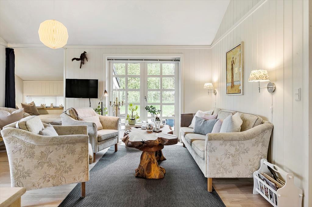 Når du træder indenfor i dette hyggelige sommerhus, bliver du mødt af en indretning, der oser af charme og afslapning. De landlige detaljer, såsom trælofter og klassiske møbler, skaber en varm og indbydende atmosfære. Sommerhuset har flere komfortable siddepladser, hvor du kan slå dig ned med en god bog eller nyde en kop kaffe. Brændeovnen i stuen bidrager til den hyggelige stemning og er perfekt til kølige aftener. Med et åbent køkken, der har alt hvad du behøver for at tilberede lækre måltider, og en rummelig spiseplads, er der god mulighed for at samle familien til fælles madlavning og hyggelige middage. Soveværelserne er komfortable og indbydende, så du kan få en god nats søvn efter en dag fyldt med oplevelser.