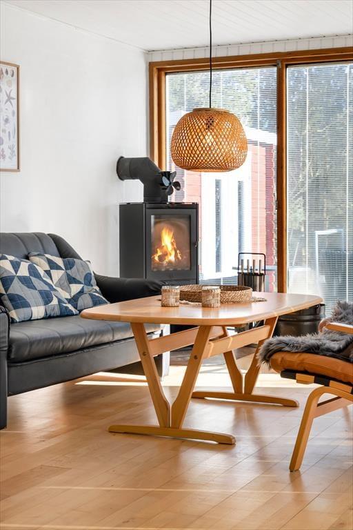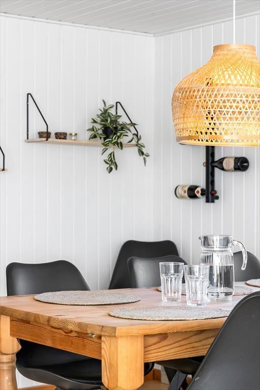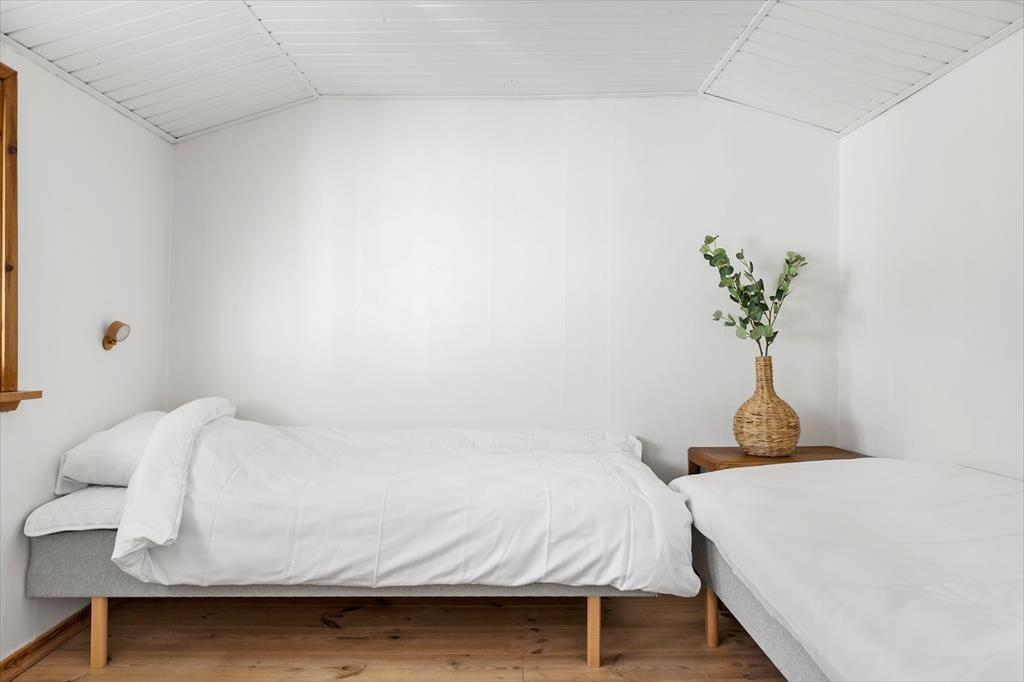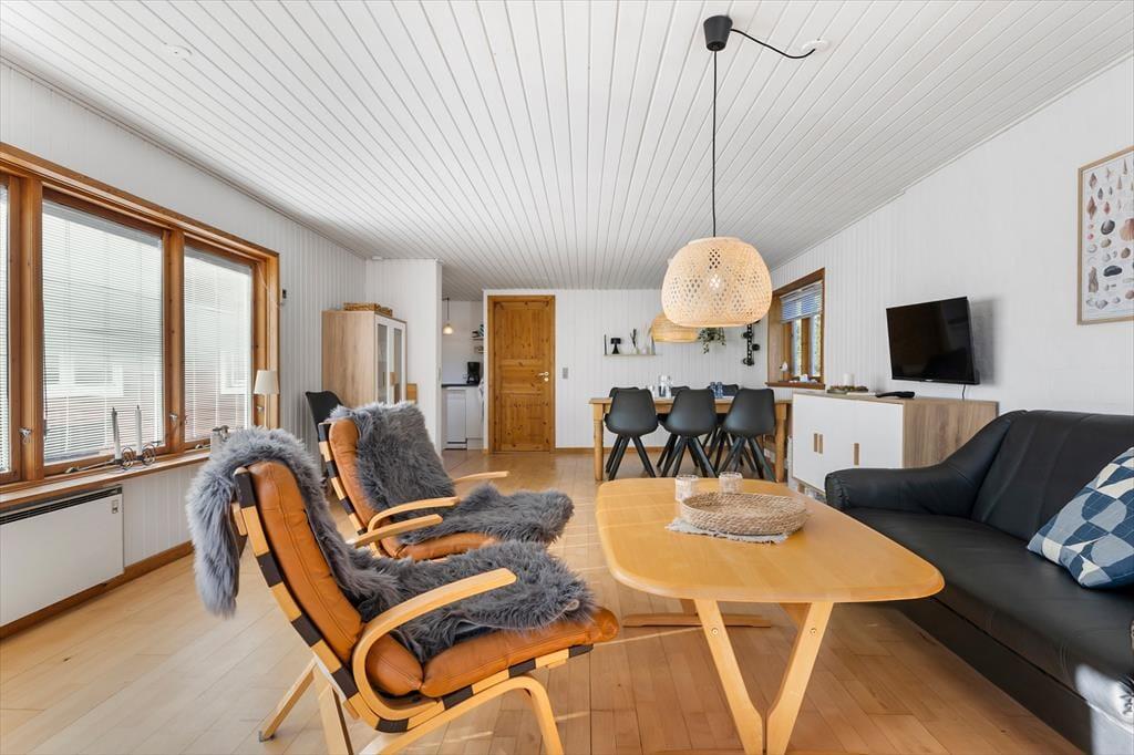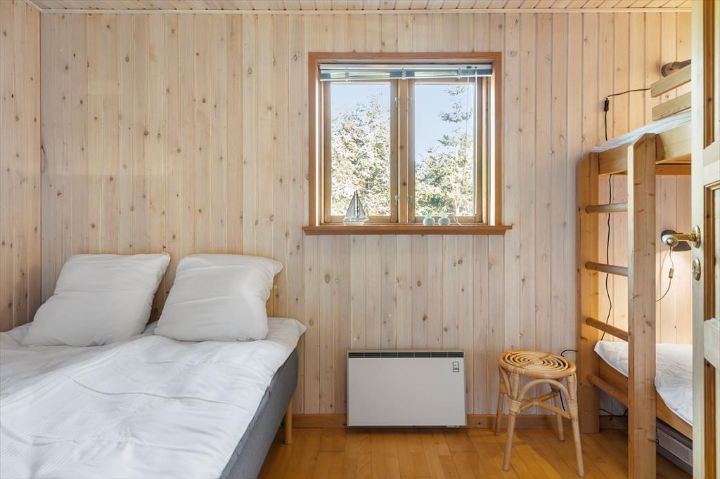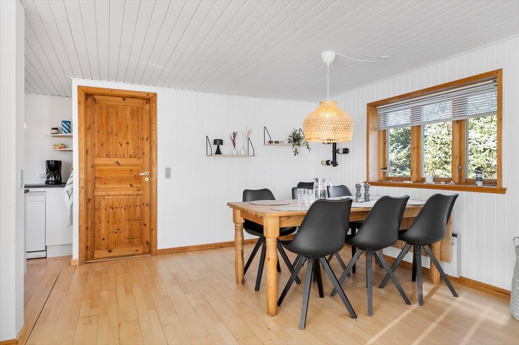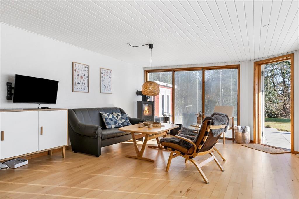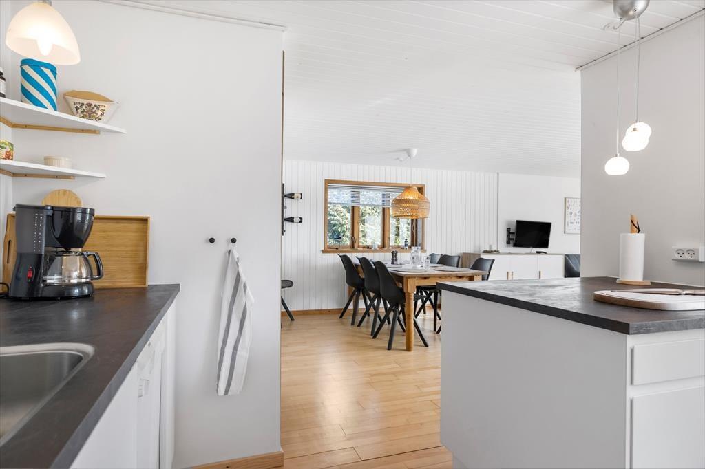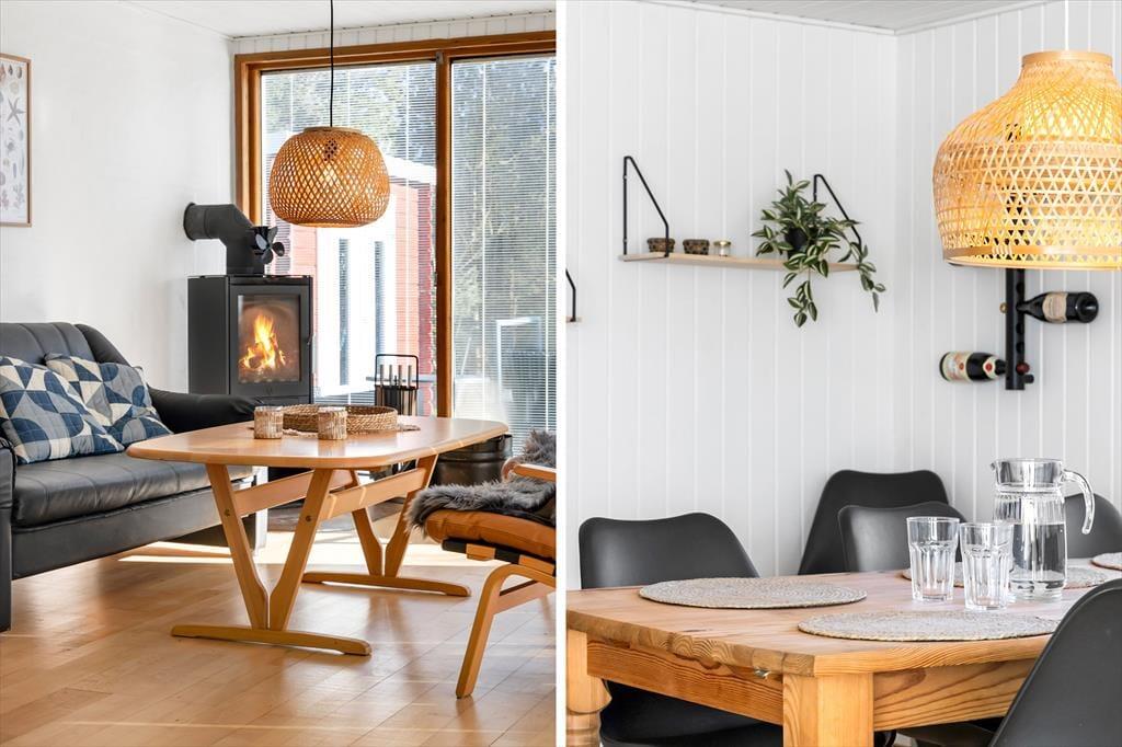 Indenfor i sommerhuset venter en lys og indbydende atmosfære med den helt særlige stemning, som kun et rigtigt sommerhus kan have. Indretningen er både hjemlig og afslappet med varme farver, synlige trædetaljer og komfortable møbler, der straks får dig til at føle dig tilpas. Huset er godt indrettet med en god rumfordeling, der giver plads til både fælles samvær og små pauser, hvor man kan trække sig lidt tilbage med en kop kaffe og en god bog. I opholdsrummet samles I naturligt omkring spisebordet og den åbne stue med brændeovn – et oplagt sted at slænge sig efter en dag ved stranden, mens flammerne knitrer stille i baggrunden. Og uanset om det er morgenmad med friskbrygget kaffe eller et brætspil hen under aften, vil det føles rart at være lige netop her.