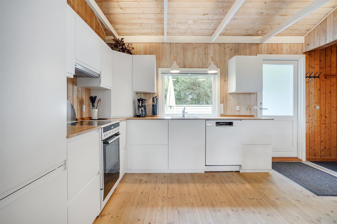 Køkkenet er udstyret med 1 køleskab. Der er 4 keramiske kogeplader, varmluftovn, mikrobølgeovn samt opvaskemaskine.