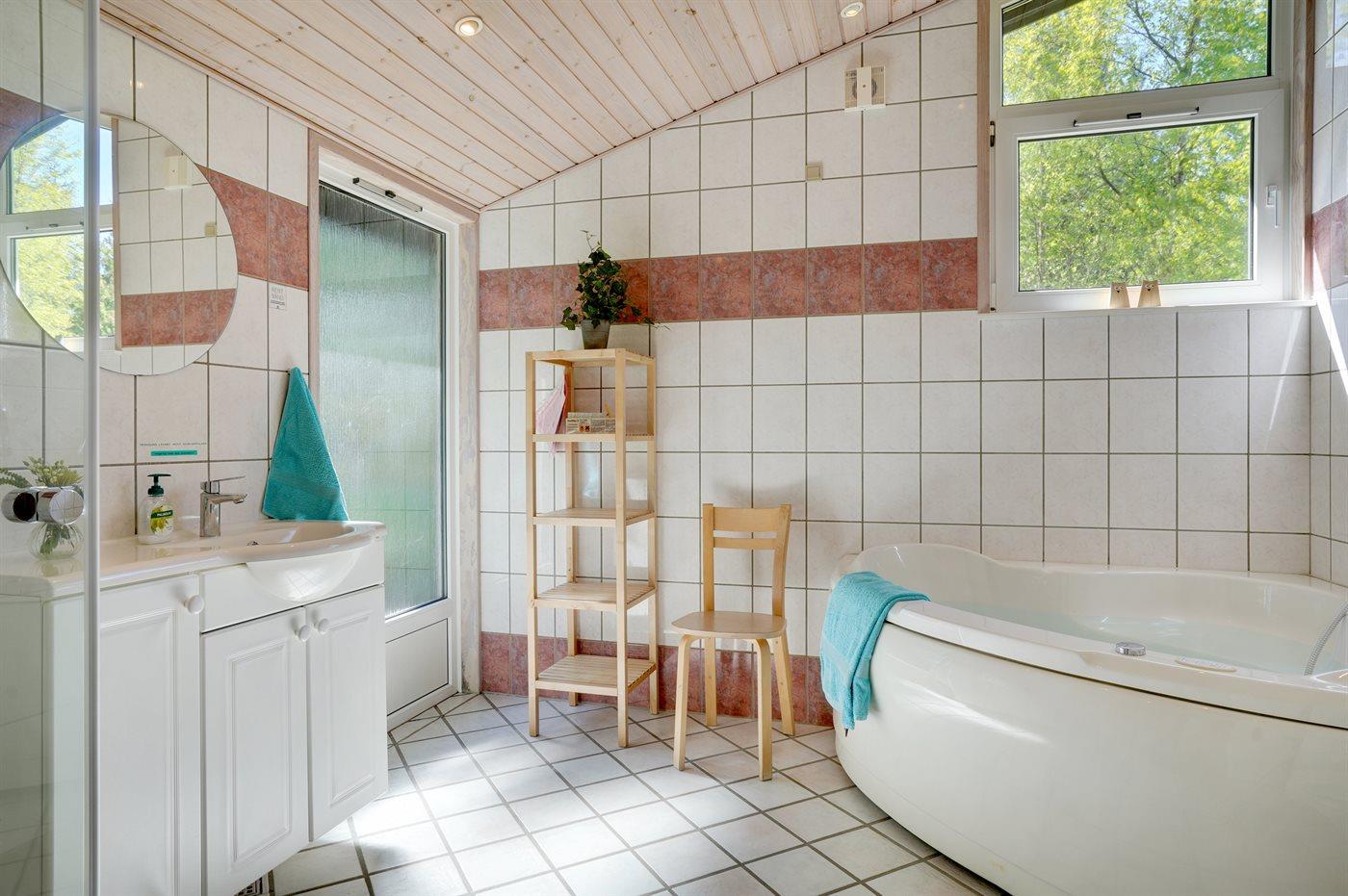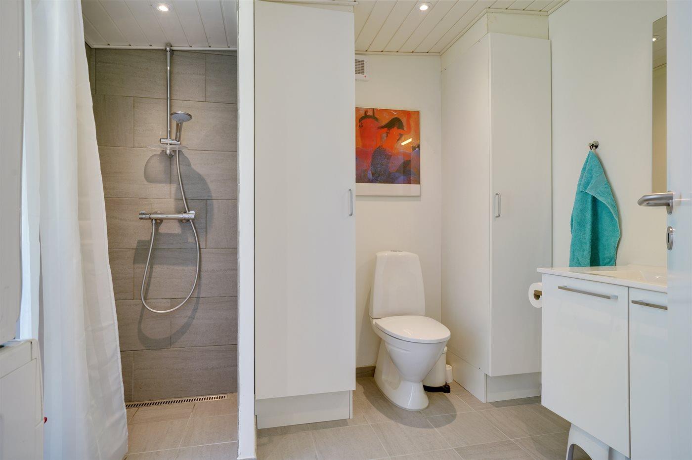Der er 2 badeværelser med bruseniche og 2 toiletter. Der er gulvvarme på 2 badeværelser. I saunaen er der mulighed for afslapning.