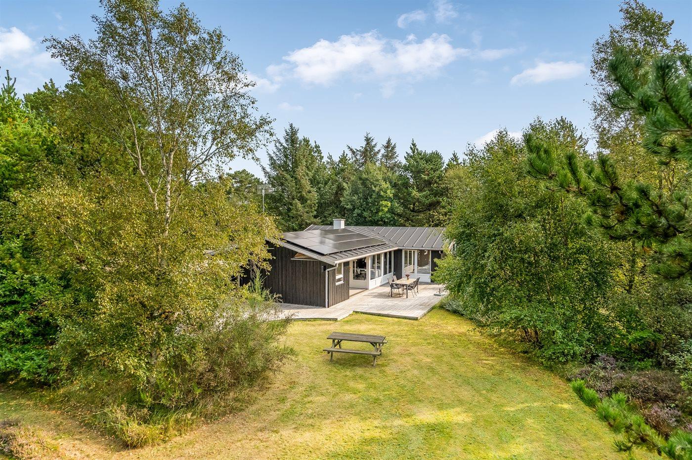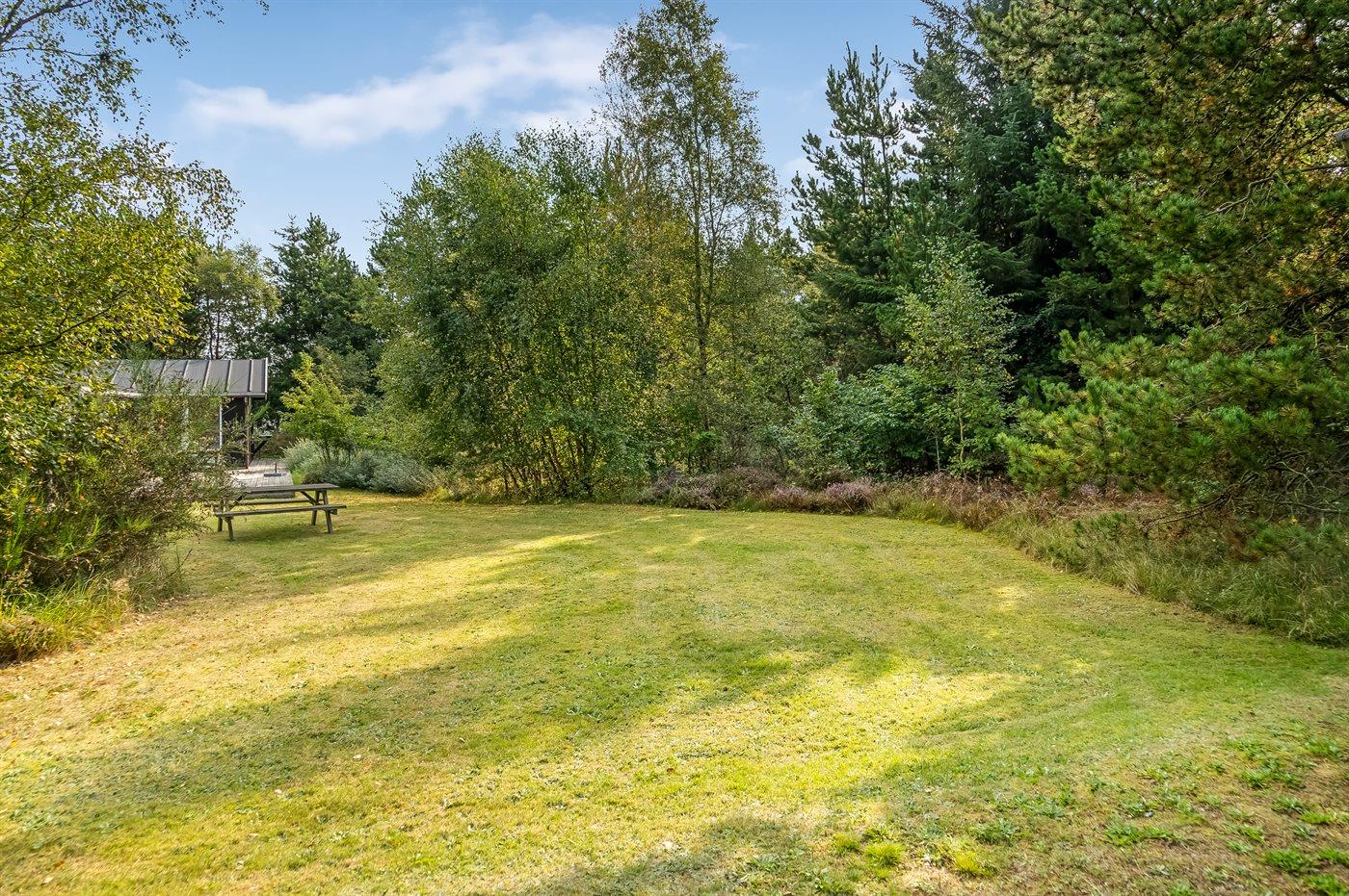 Hyggeligt sommerhus på stor naturgrund tæt på børnevenlig sandstrand med spa og sauna.