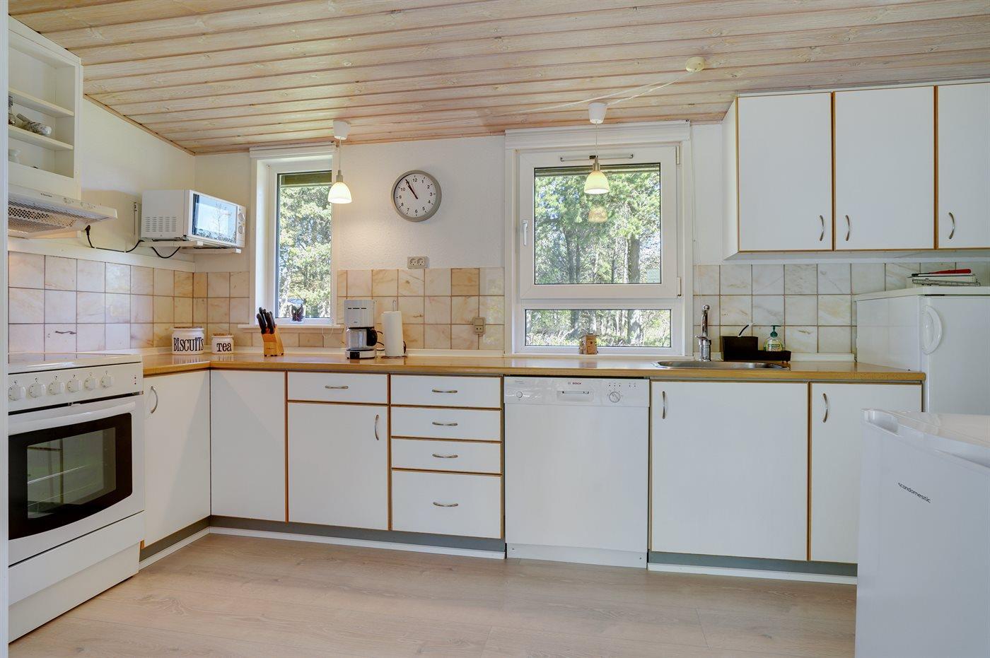Køkkenet er udstyret med 1 køleskab. Der er 4 keramiske kogeplader, varmluftovn, mikrobølgeovn samt opvaskemaskine.