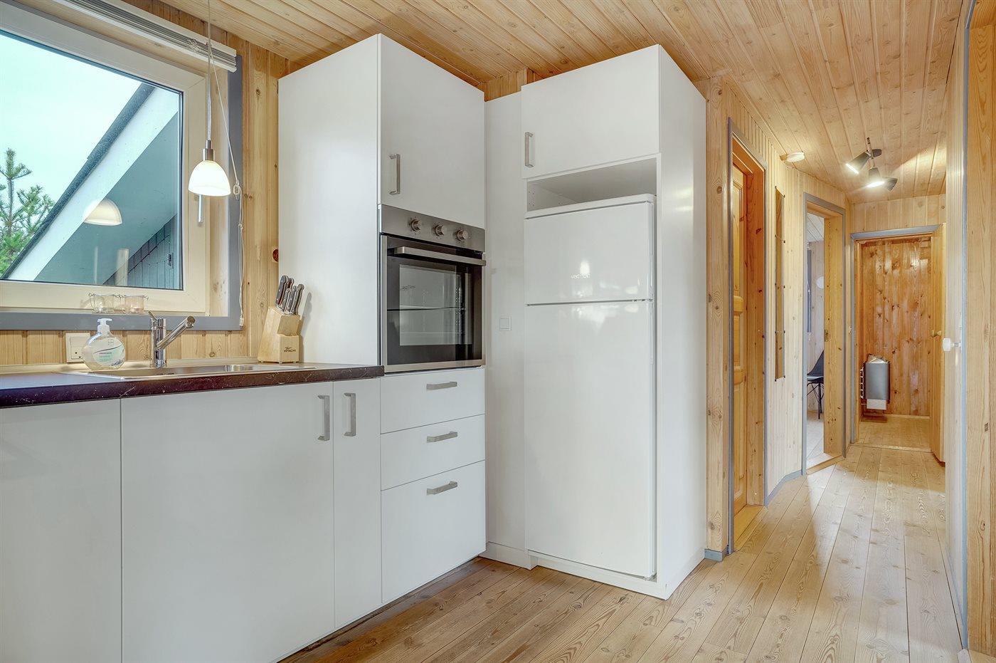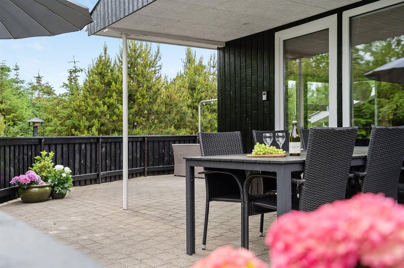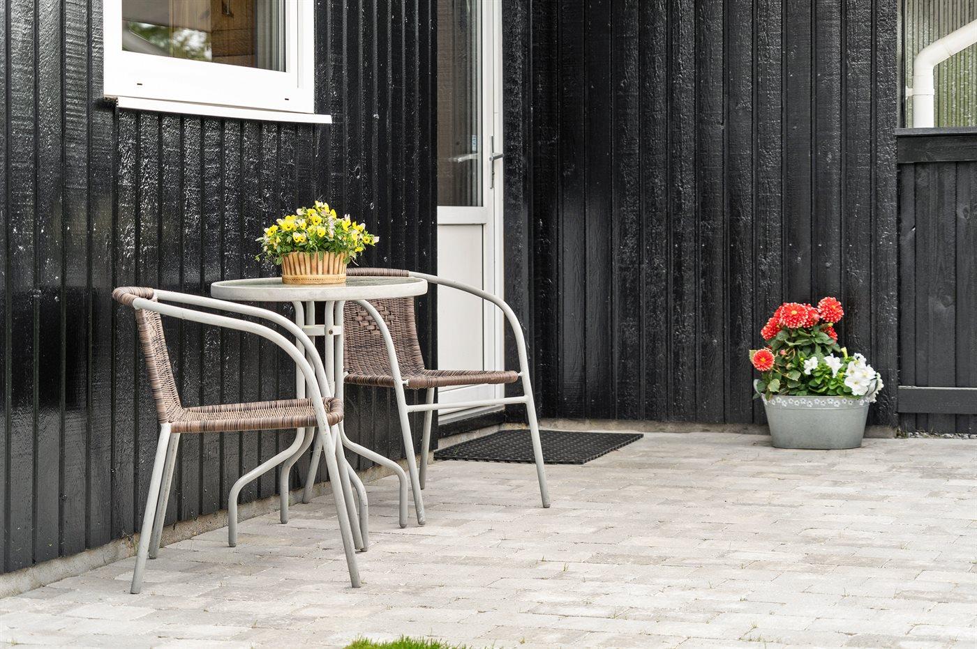 Ferieboligen er beliggende på en 1200 m² stor havegrund. Der er 400 m til havet. Nærmeste forretning er beliggende i en afstand af 5640 m. Der er en golfbane i en afstand af 12000 m. Desuden er der 10 m² overdækket terrasse. Heraf i alt 40 m² lukket terrasse. Der er redskabsrum. Gynge. Der er mulighed for at tilberede maden udendørs i udekøkkenet. Grill til rådighed. Der er installeret stik til opladning af elbil. Parkering ved ferieboligen.