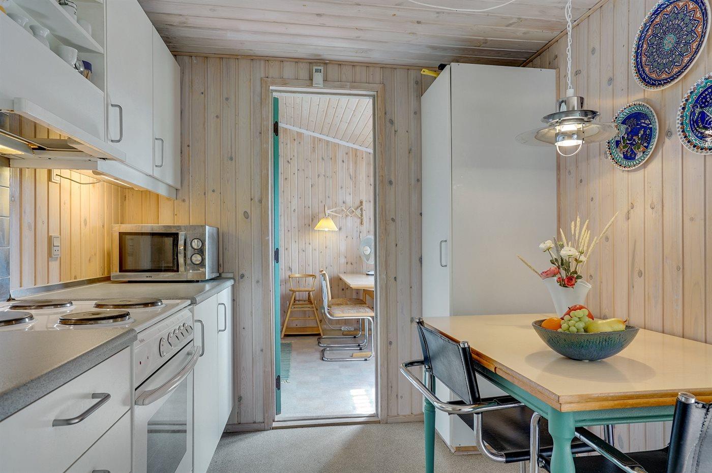 Køkkenet er udstyret med 1 køleskab. Der er 4 elkogeplader, varmluftovn, mikrobølgeovn samt opvaskemaskine.