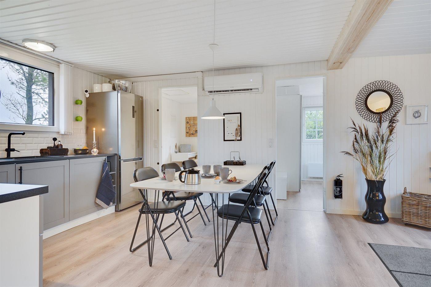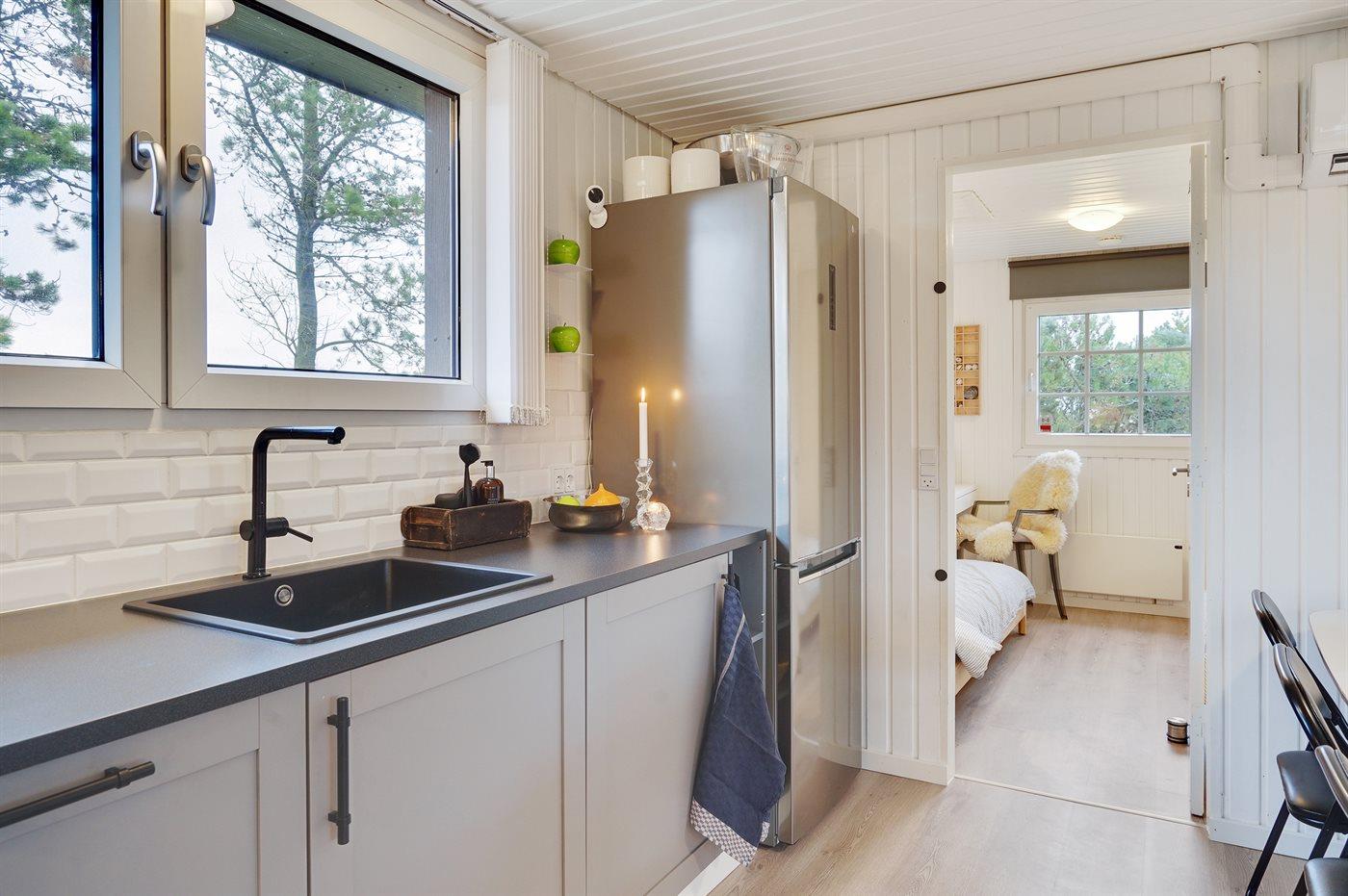 Køkkenet er udstyret med 1 køleskab. Der er 4 induktionskogeplader, varmluftovn, mikrobølgeovn samt opvaskemaskine.