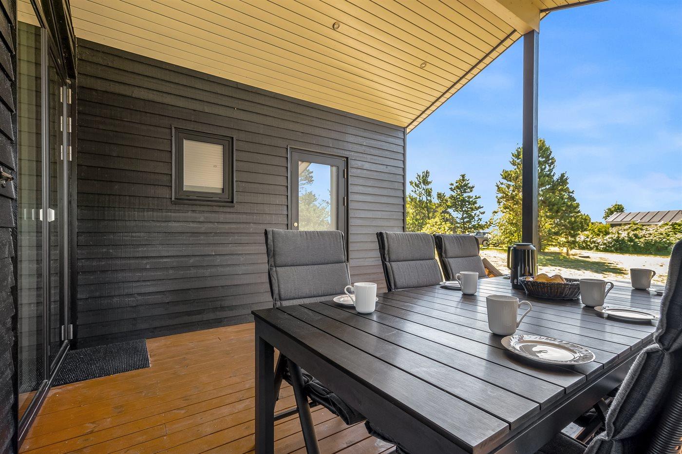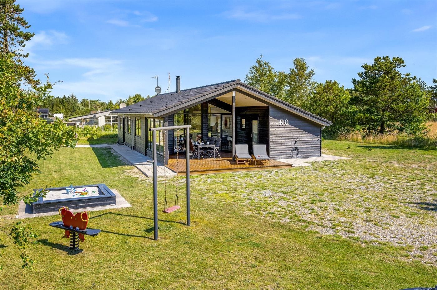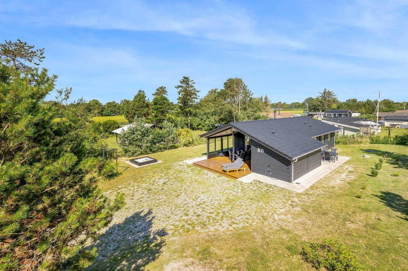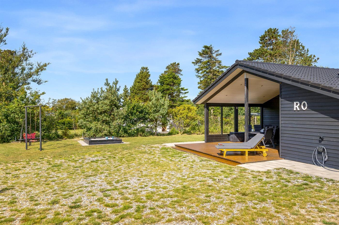 Ferieboligen er beliggende på en 835 m² stor naturgrund. Der er 225 m til havet. Nærmeste forretning er beliggende i en afstand af 5000 m. Desuden er der 24 m² overdækket terrasse. Til ferieboligen hører åbent terrasseareal. Der er redskabsrum. Gynge. Sandkasse. Vippe. Grill til rådighed. Der er installeret stik til opladning af elbil. Parkering ved ferieboligen.
