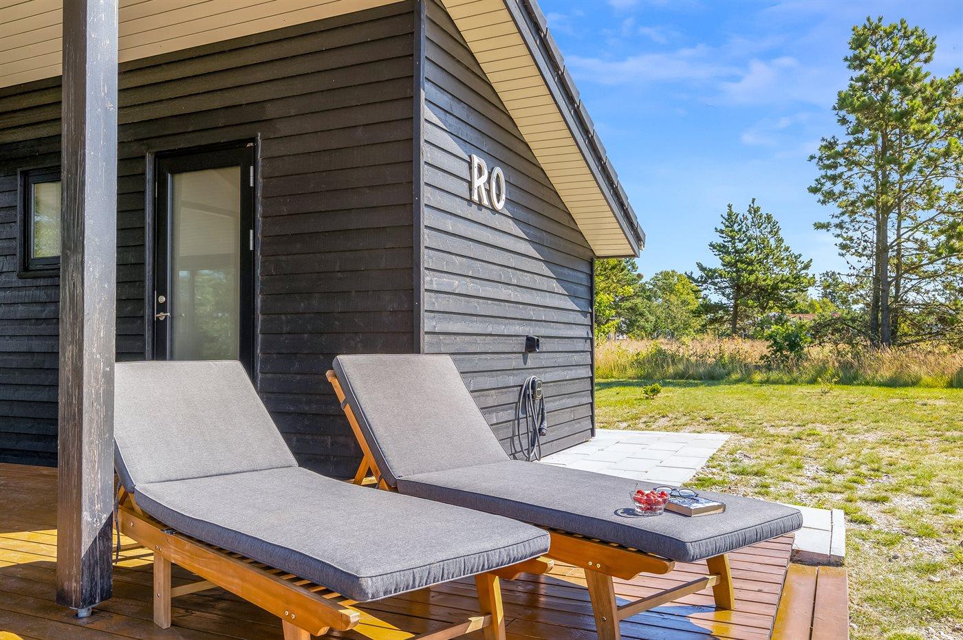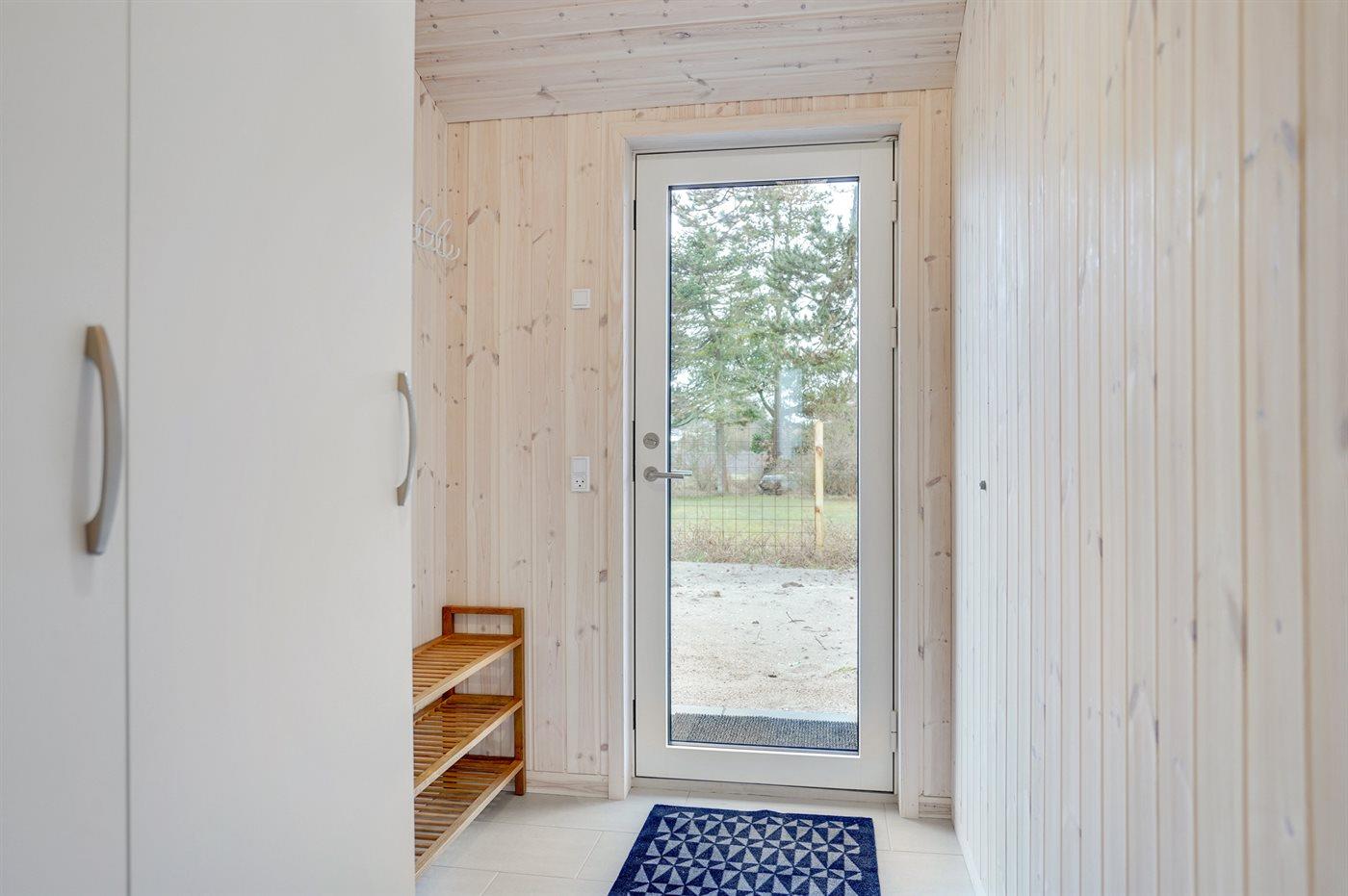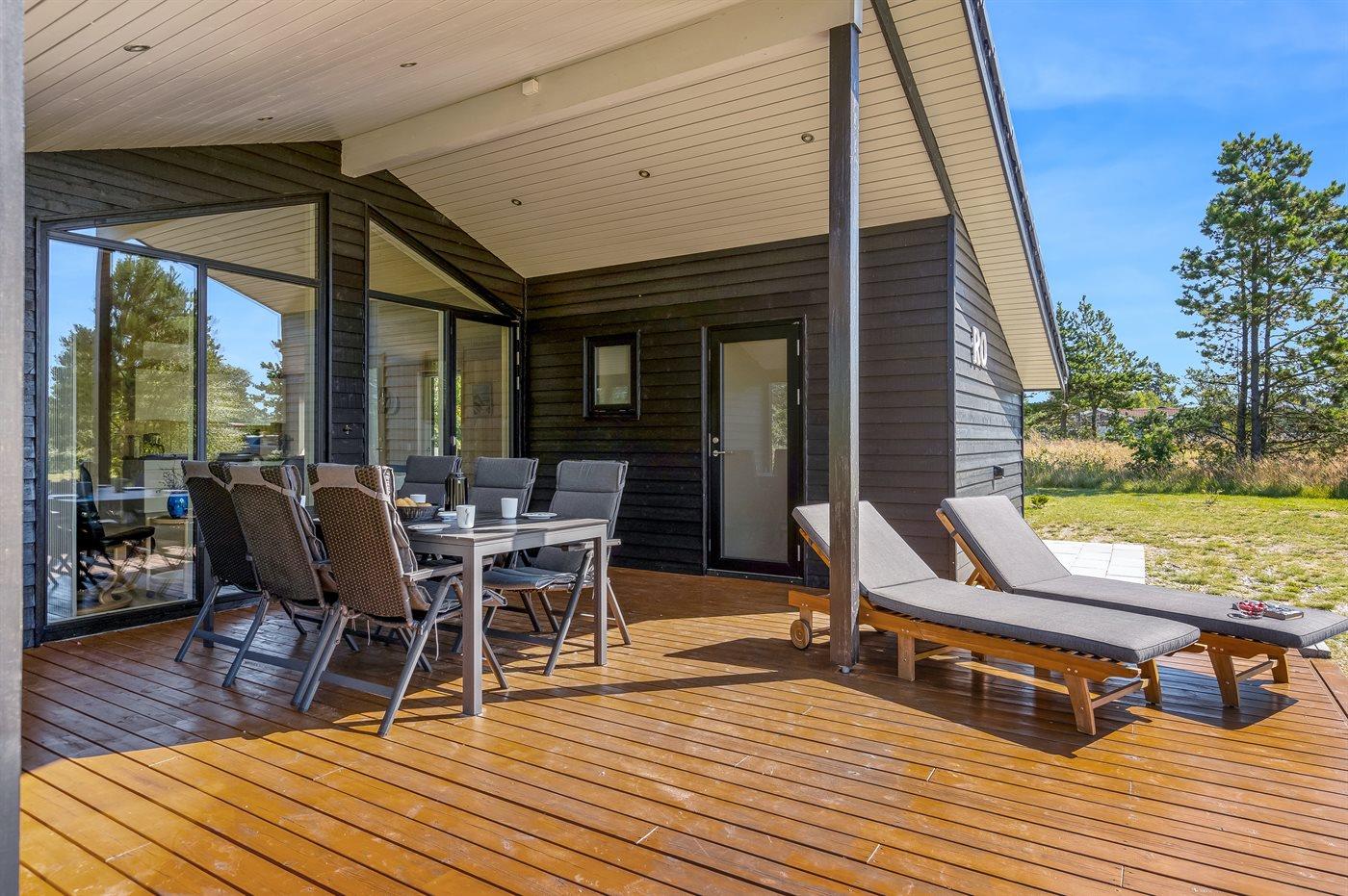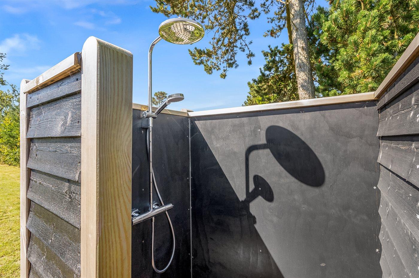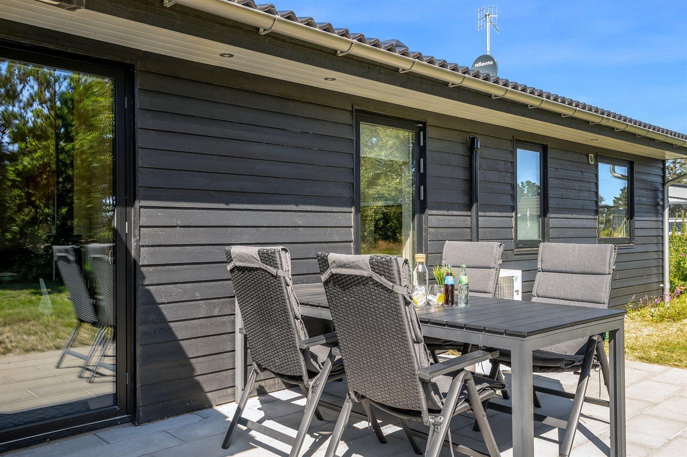 Ferieboligen er beliggende på en 835 m² stor naturgrund. Der er 225 m til havet. Nærmeste forretning er beliggende i en afstand af 5000 m. Desuden er der 24 m² overdækket terrasse. Til ferieboligen hører åbent terrasseareal. Der er redskabsrum. Gynge. Sandkasse. Vippe. Grill til rådighed. Der er installeret stik til opladning af elbil. Parkering ved ferieboligen.