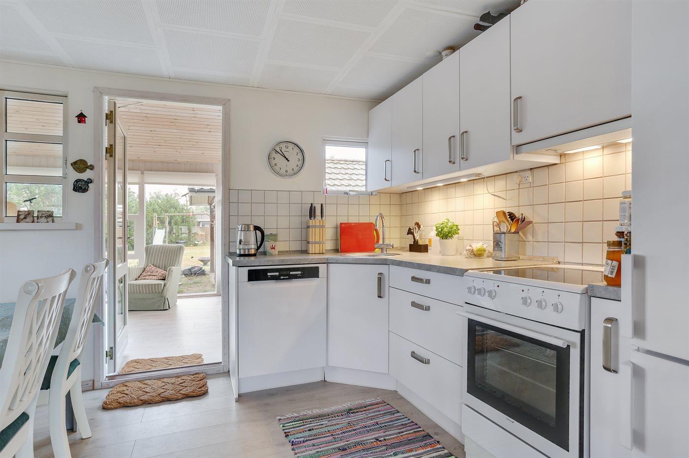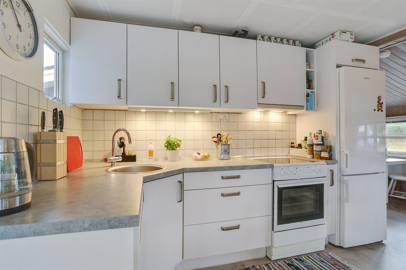 Køkkenet er udstyret med 1 køleskab. Der er 4 keramiske kogeplader, varmluftovn samt opvaskemaskine.