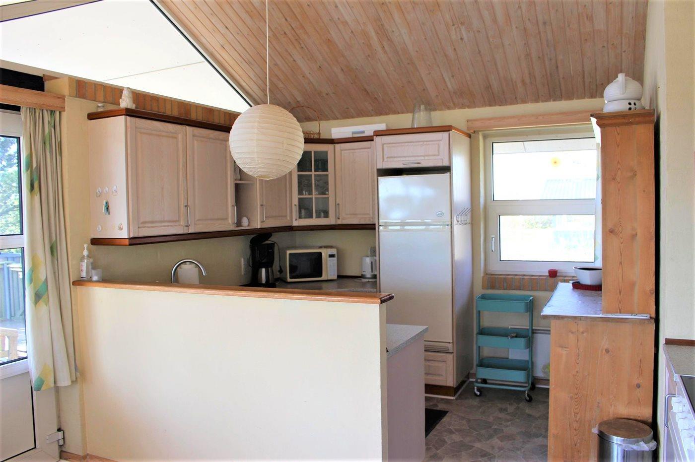 Køkkenet er udstyret med 1 køleskab. Der er 4 keramiske kogeplader, varmluftovn, mikrobølgeovn samt opvaskemaskine.