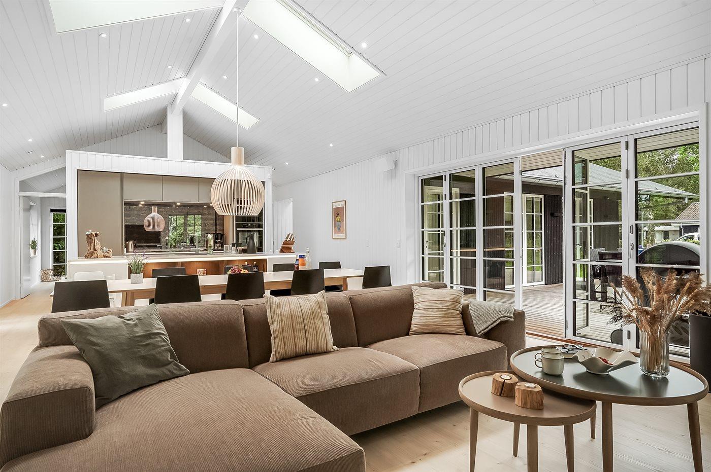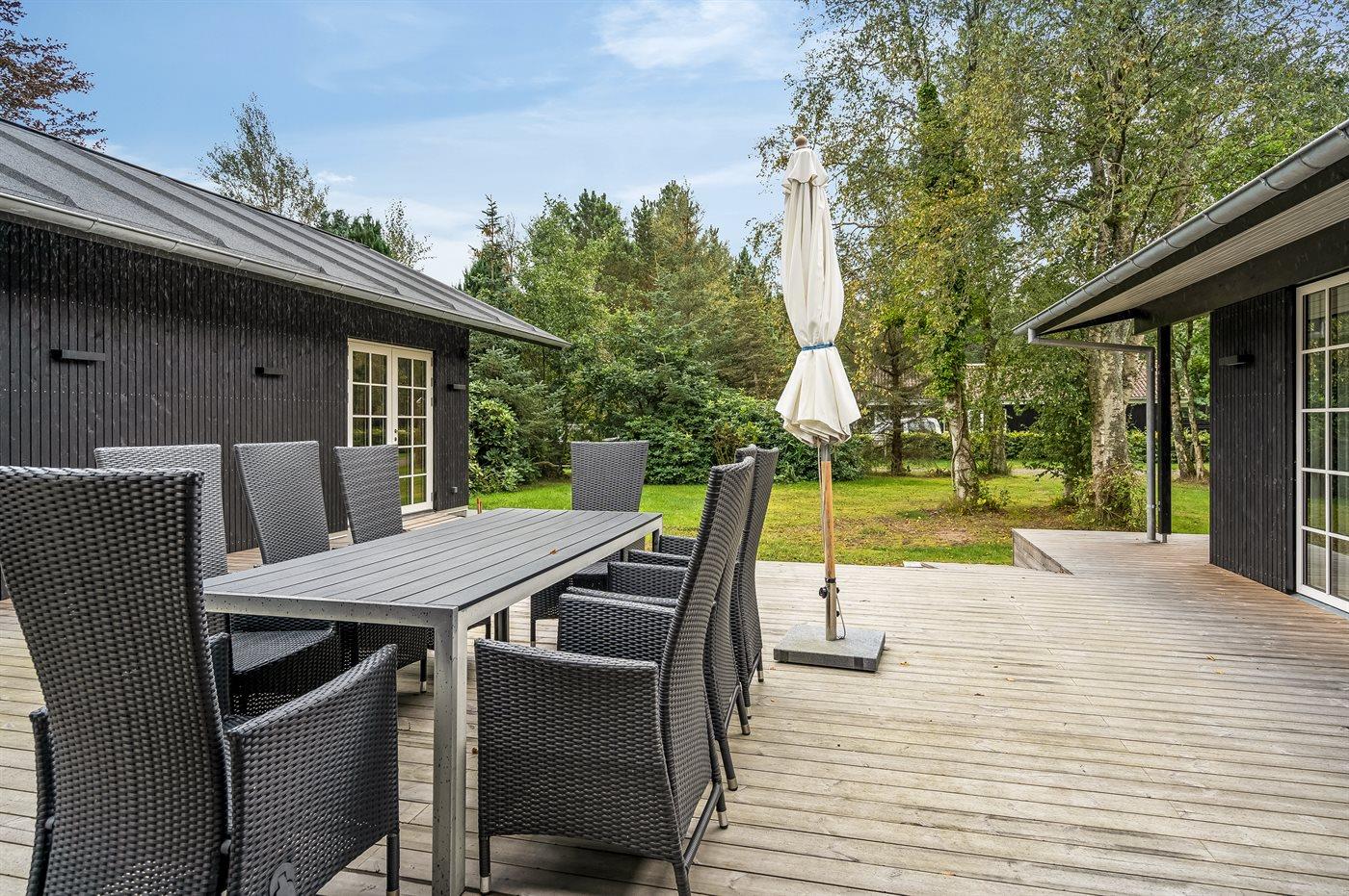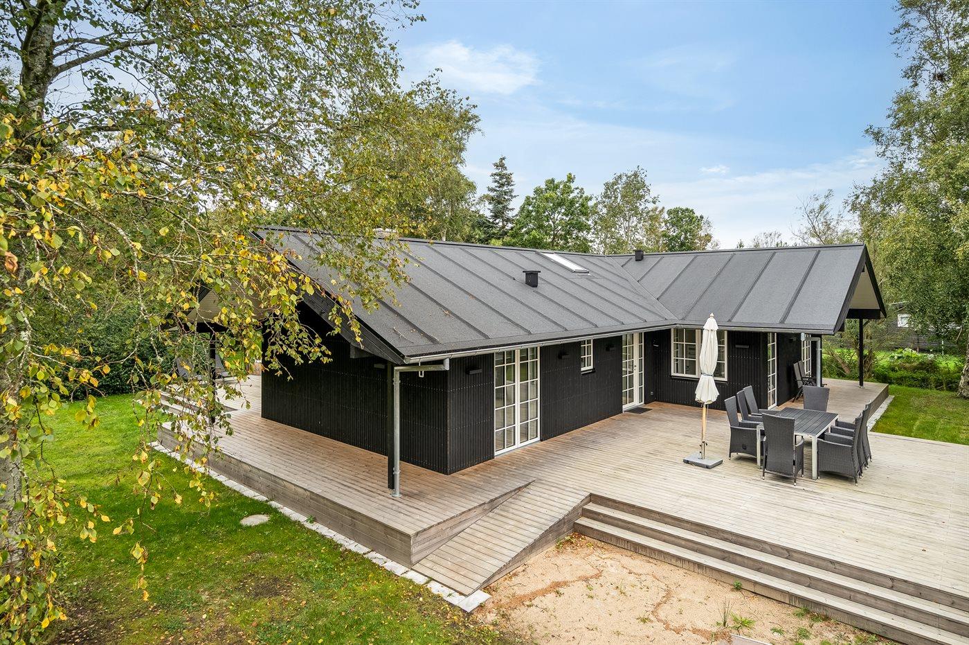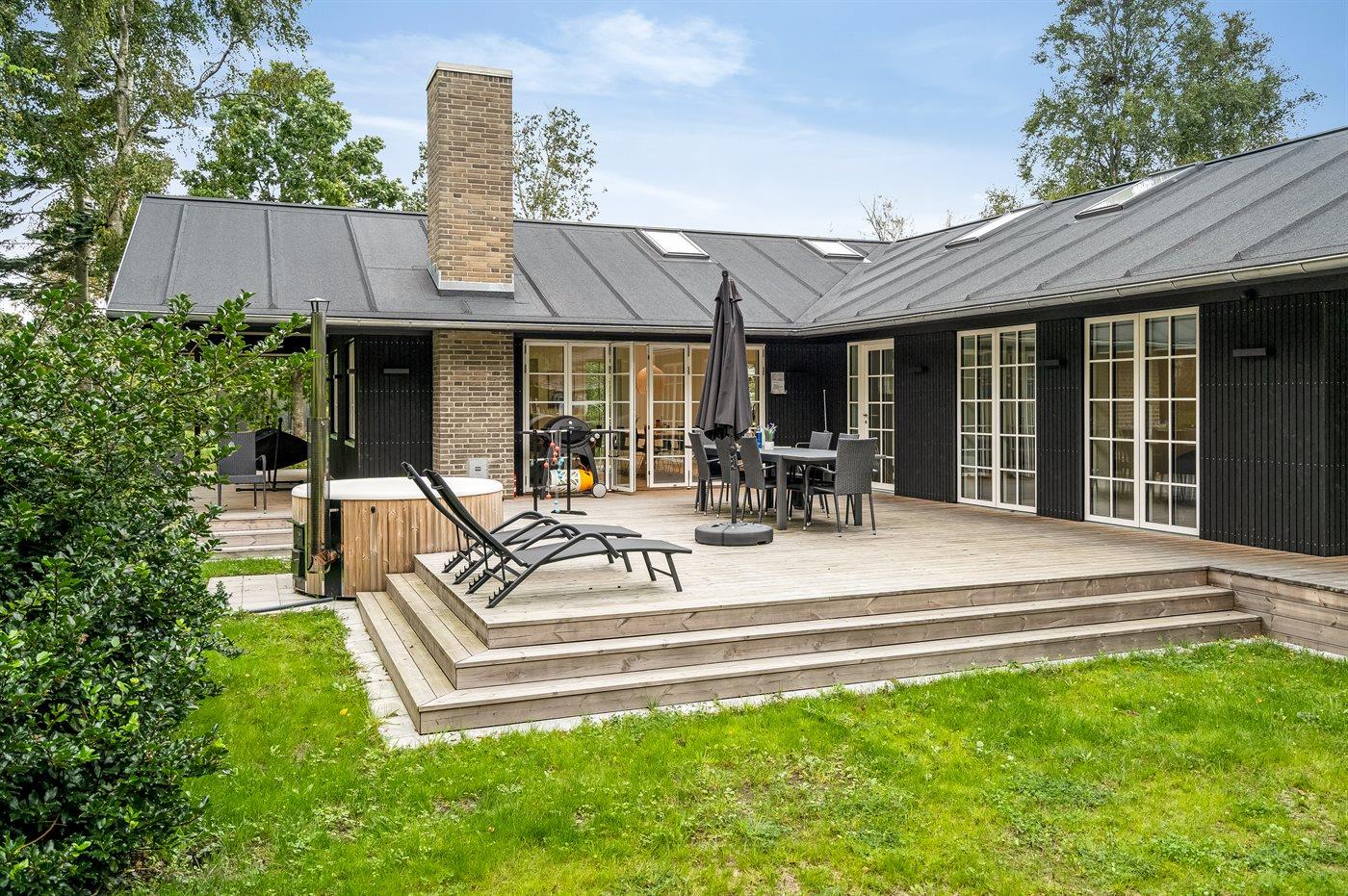 Sommerhuset er opført med materialer af høj kvalitet og har en virkelig god planløsning, som passer til både en familie med flere børn eller sågar to familier - mulighederne er mange i dette dejlige sommerhus. Her findes fantastiske terrassearealer, som også delvist er overdækket, og her er altid mulighed for at finde en lækrog, og tilmed ligger huset helt ugenert. På terrassen står et vildmarksbad, som kan rumme op til 6 personer og er en fornøjelse af benytte året rundt. Ved siden af sommerhuset er opført et stort og indbydende aktivitetsrum, som børn og voksne i alle aldre kan hygge sig med.