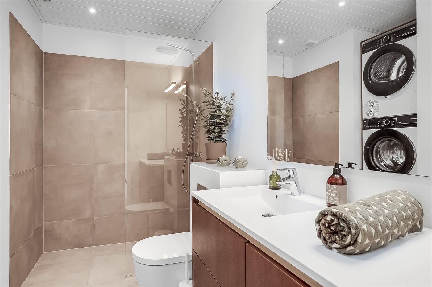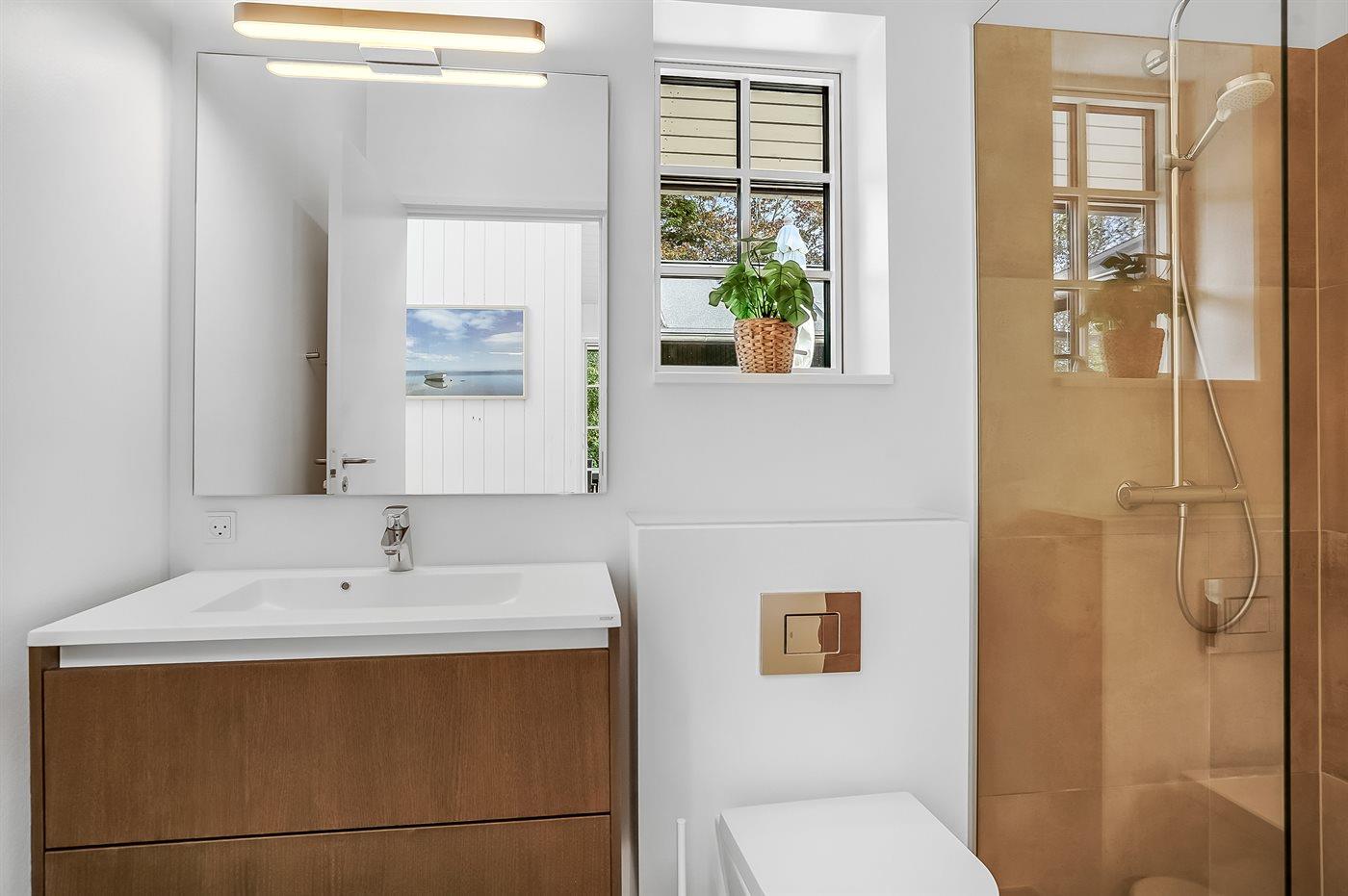 Der er 2 badeværelser med bruseniche og 2 toiletter. Der er gulvvarme på 2 badeværelser.