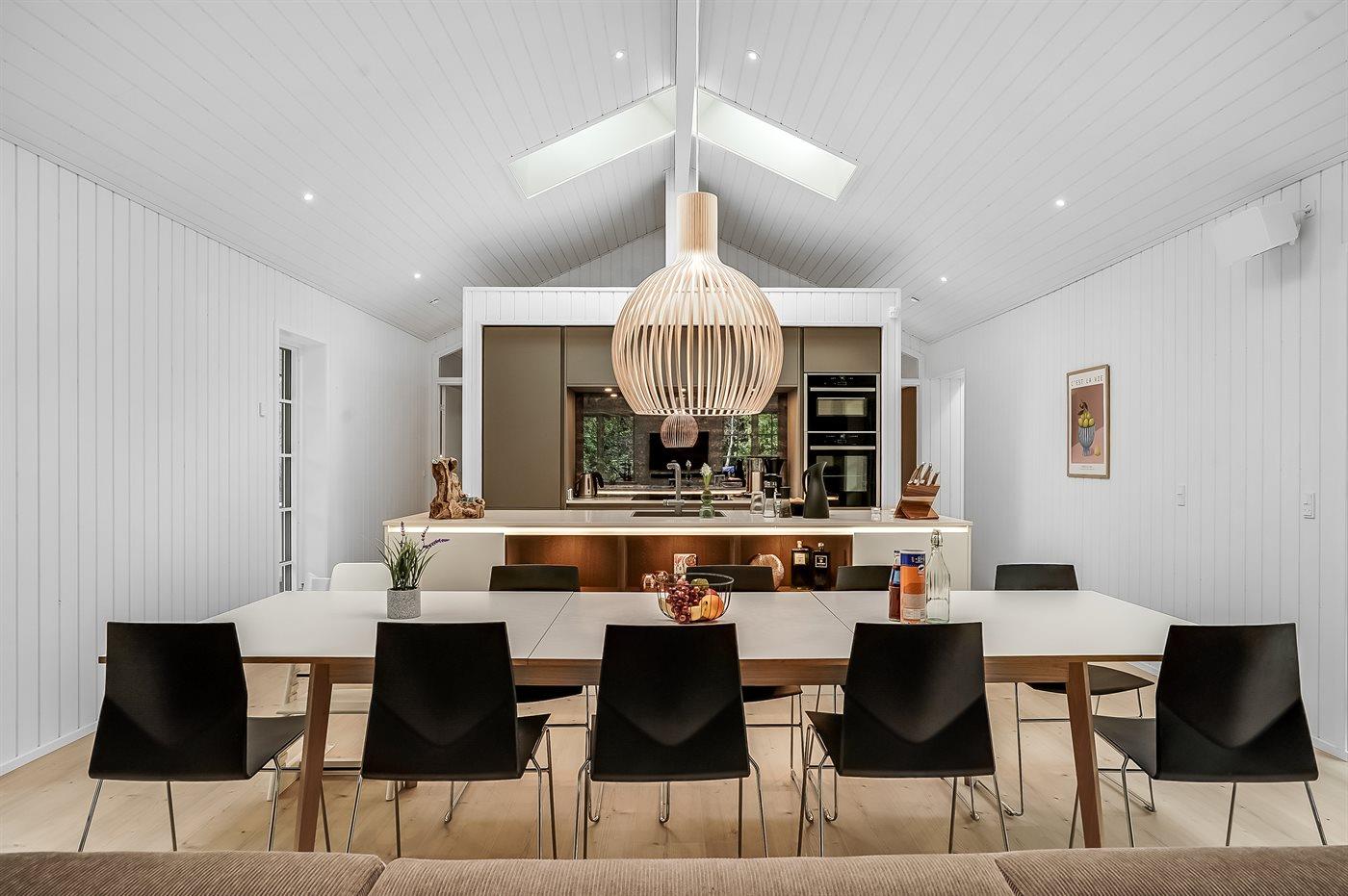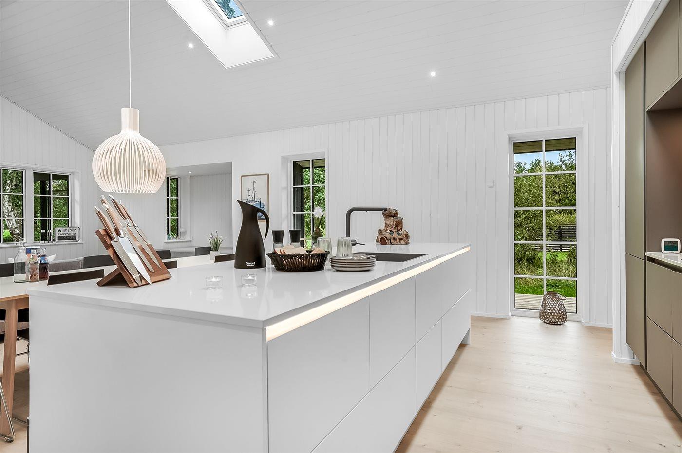 Køkkenet er udstyret med 1 køleskab. Der er 4 induktionskogeplader, varmluftovn, mikrobølgeovn samt opvaskemaskine.