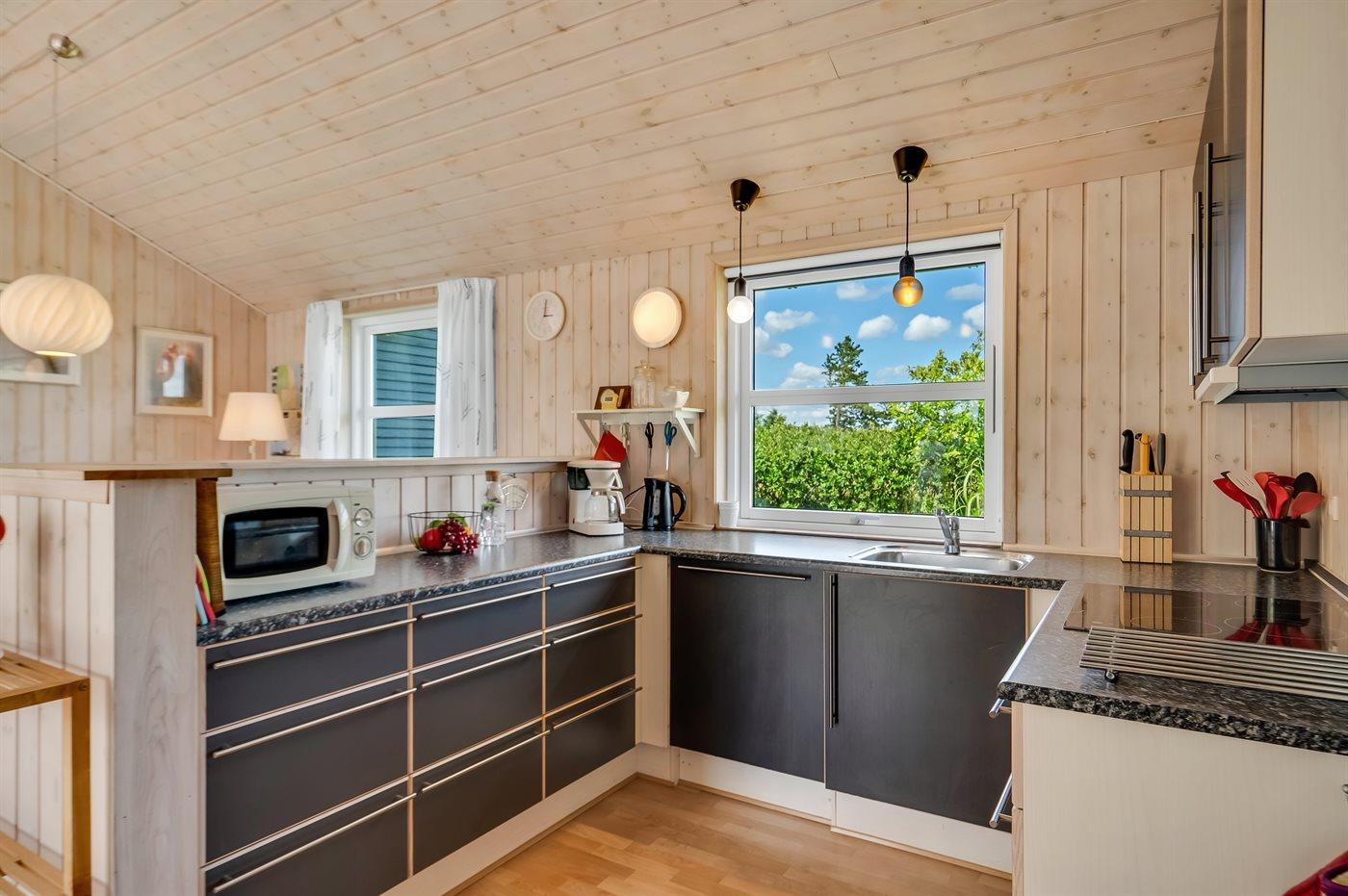 Køkkenet er udstyret med 1 køleskab. Der er 4 keramiske kogeplader, varmluftovn, mikrobølgeovn samt opvaskemaskine.