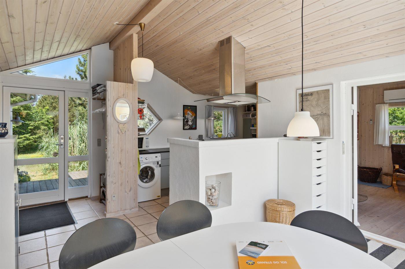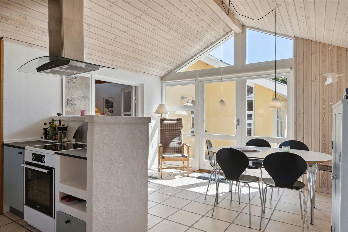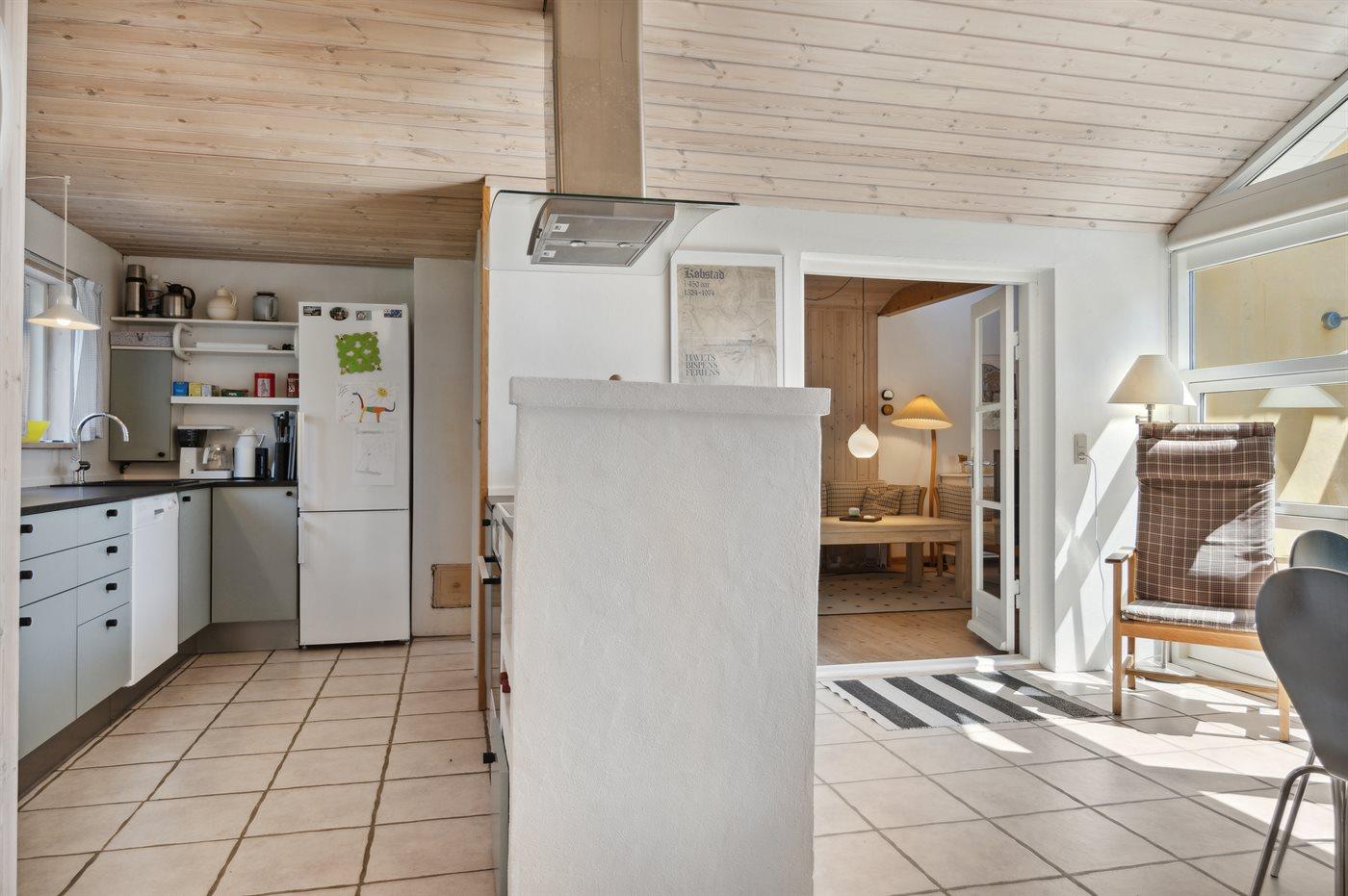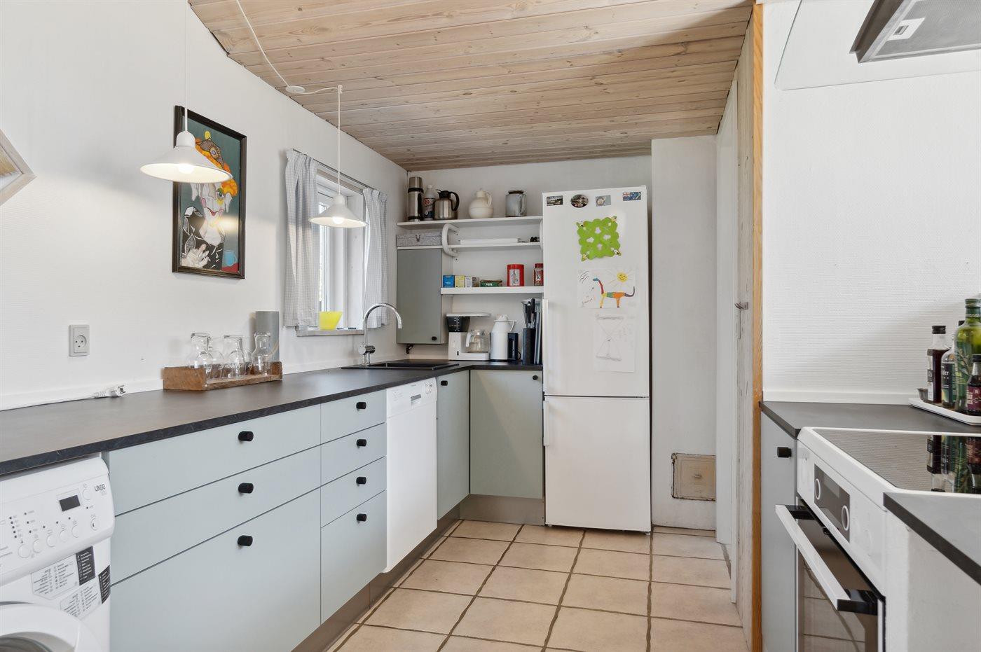 Køkkenet er udstyret med 1 køleskab. Der er 4 keramiske kogeplader, varmluftovn, mikrobølgeovn samt opvaskemaskine.