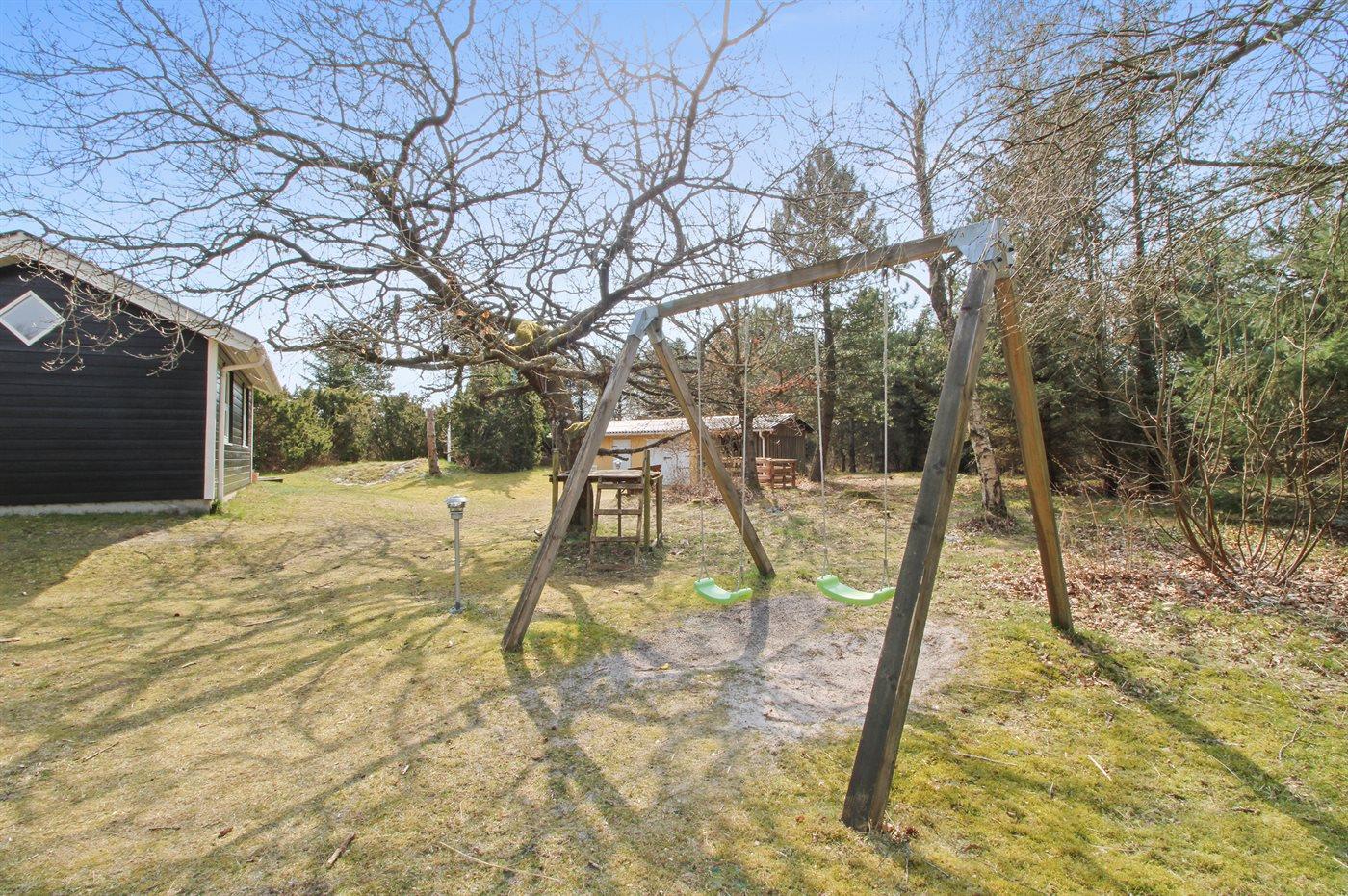 med havemøbler, solvogne, grill, gynge og sandkasse til børnene.