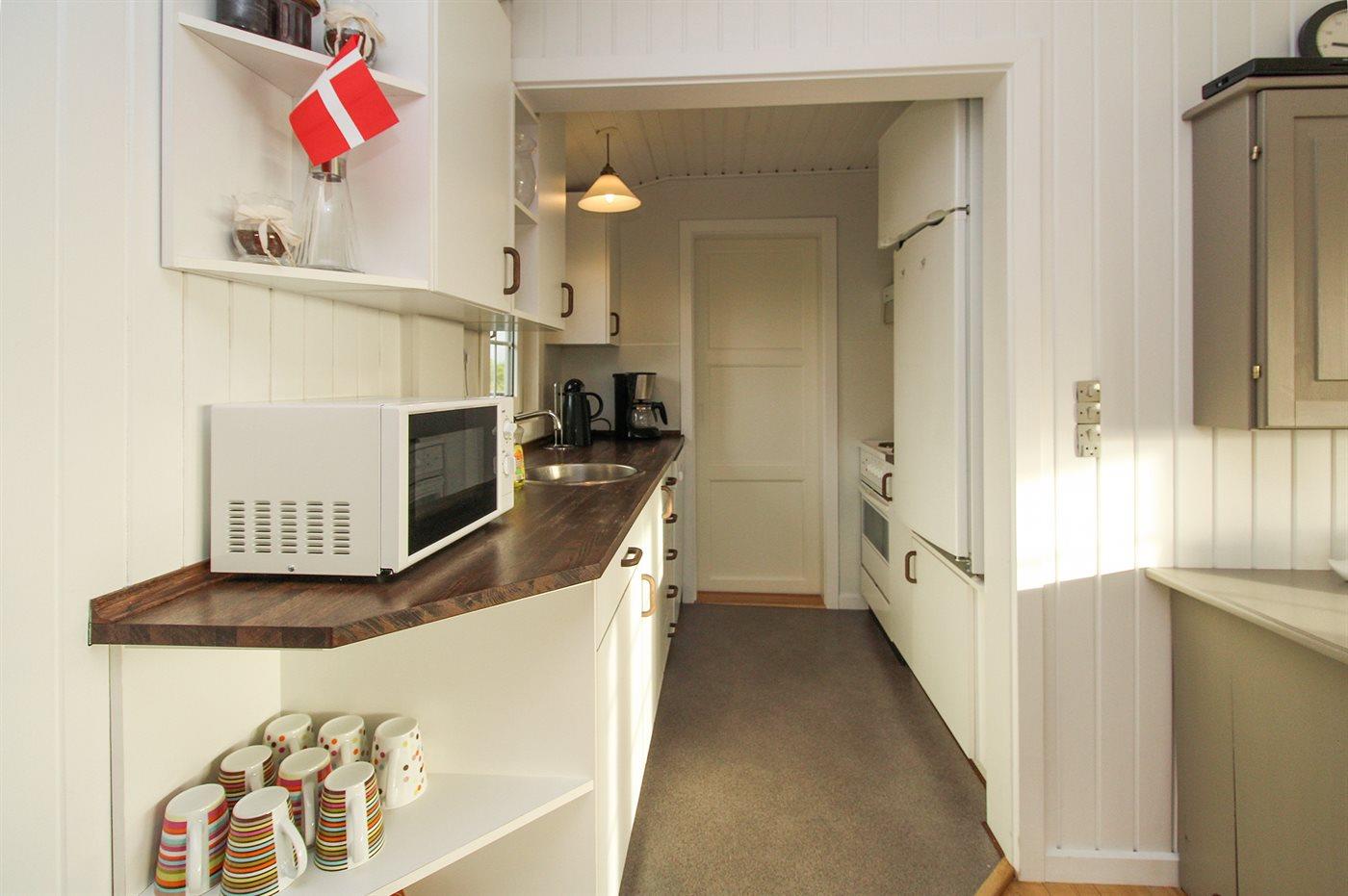 Køkkenet er udstyret med 1 køleskab. Der er 4 elkogeplader, bageovn, mikrobølgeovn samt opvaskemaskine.