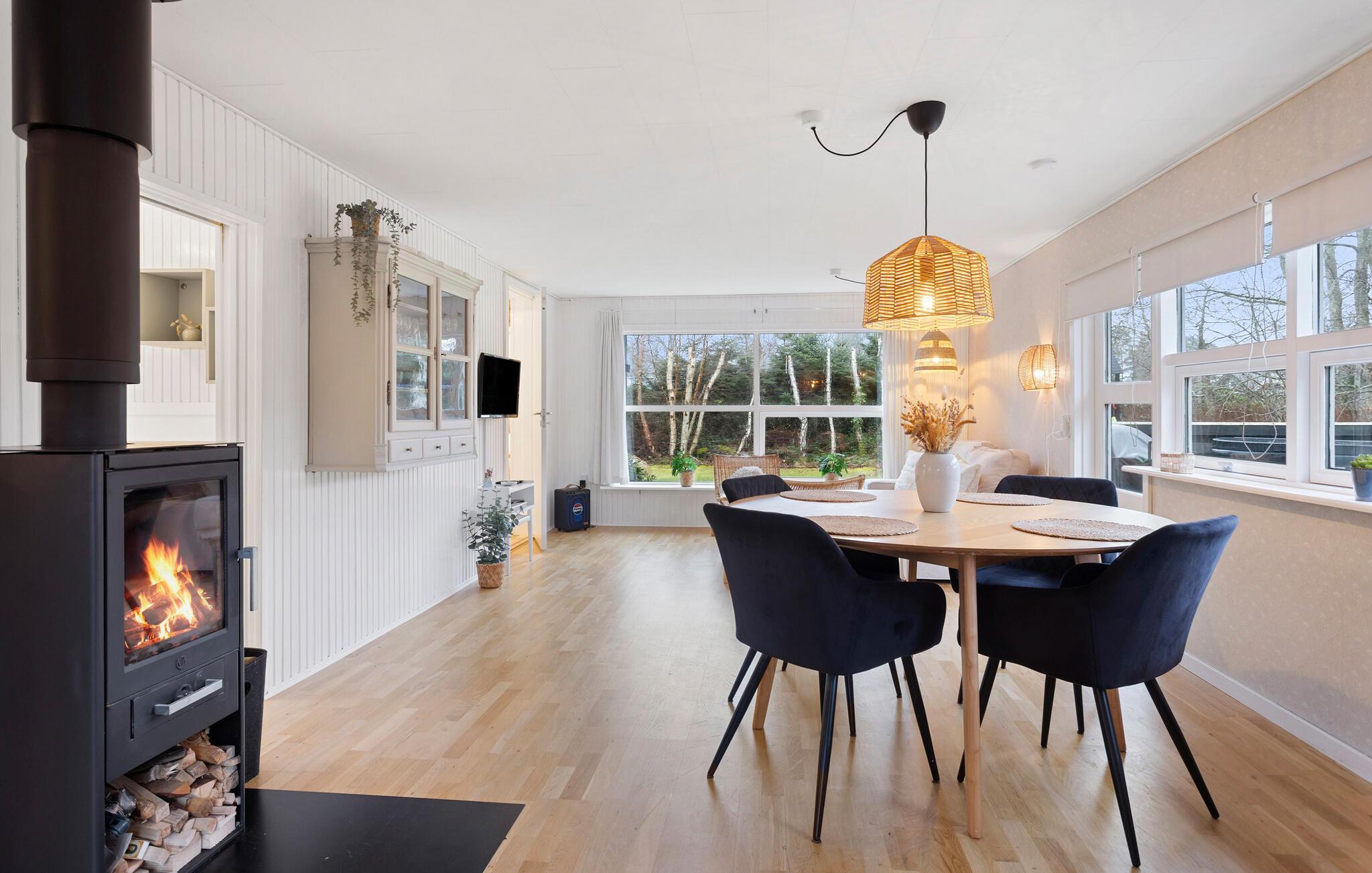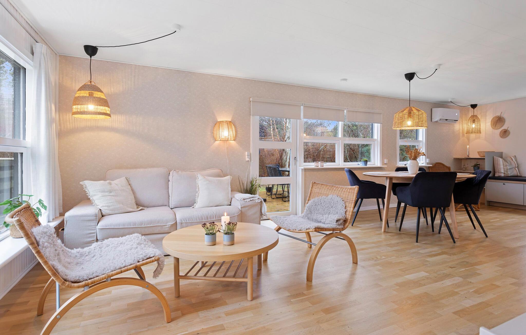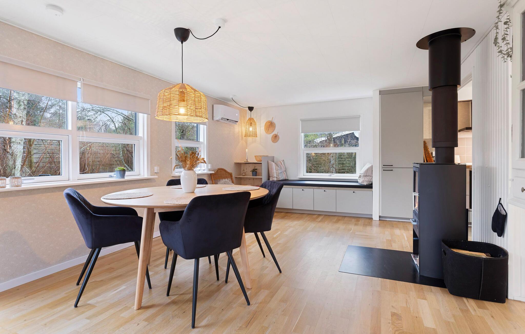 Tag den lille familie under armen og rejs til Lyngså, hvor der venter jer en fantastisk base i dette moderne træhus kun få minutters gang fra stranden. Huset er virkelig flot indrettet med materialer af høj kvalitet, komfortable møbler og hyggelige kroge og hjørner, hvor man kan nyde roen og læse en god bog. Skulle vejret bide lidt fra sig, kan I tænde op i brændeovnen og nyde dens varme knitren til madlavningen i det veludstyrede køkken og måltiderne ved spisebordet med udsigt til det grønne. Rund en skøn indendørsdag af i sofaen med snacks og en god film, mens I lægger planer for de kommende dage.