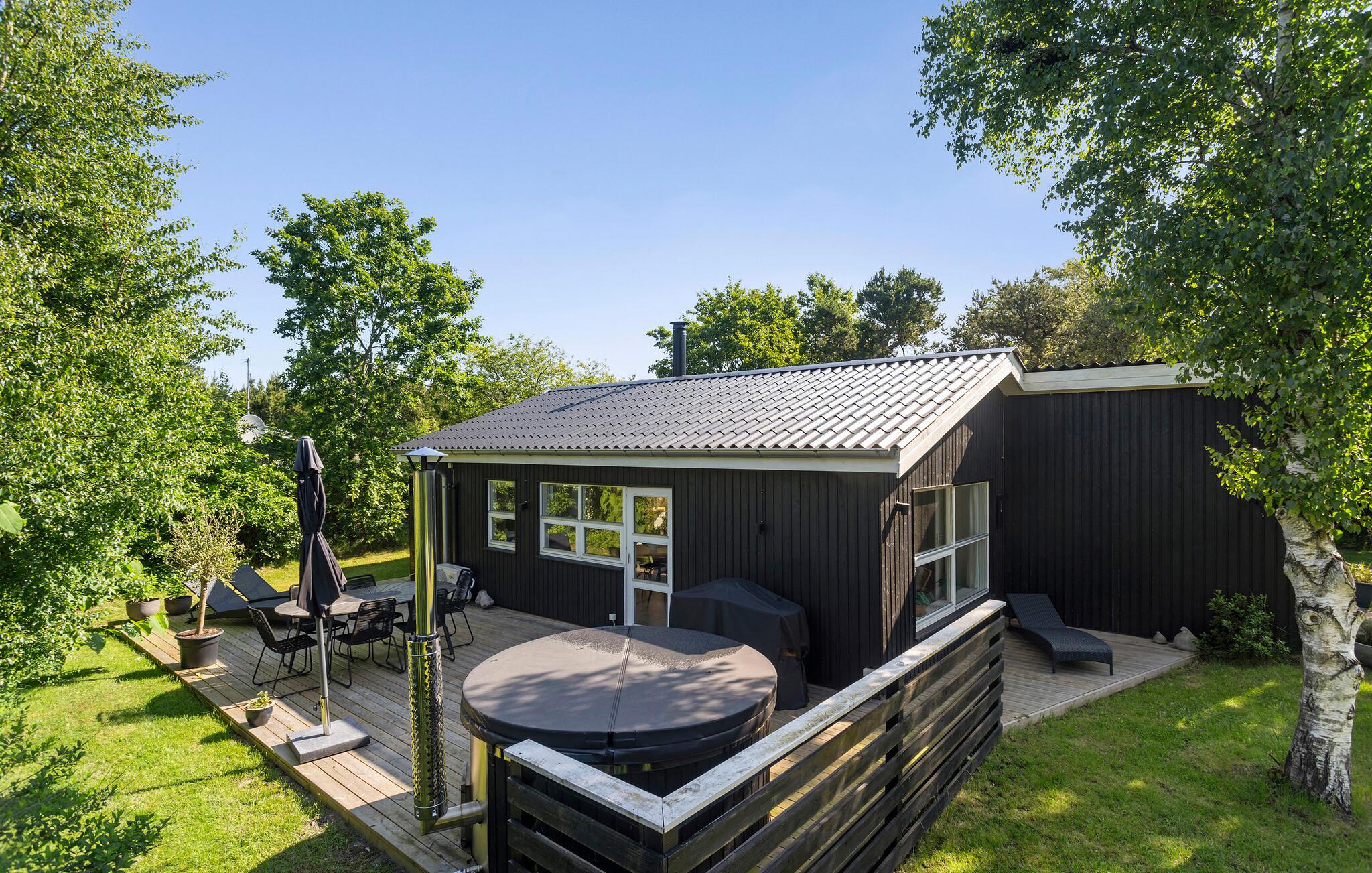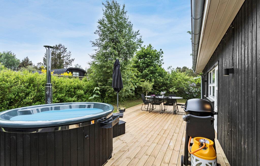 På de varme dage kan I starte roligt ud med en god kop kaffe på den skønne træterrasse. Lad børnene lege frit og gå på opdagelse på den store, ugenerede grund, inden I tager på udflugt. Køb lidt lækkert hjem til grillen og tilbered en hyggelig aftensmad i det fri, inden I runder af med en velfortjent tur i spabadet efter en herlig feriedag.