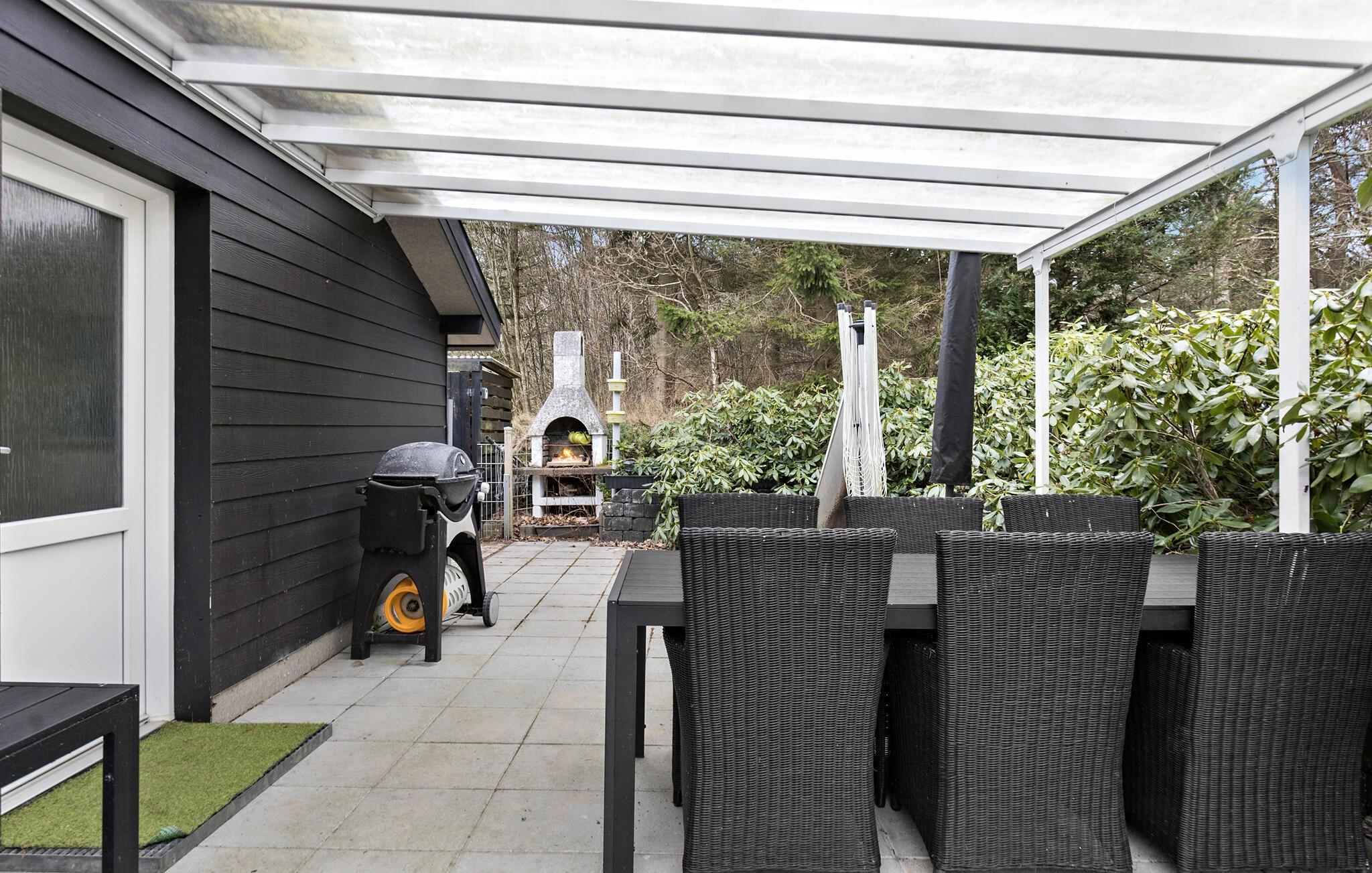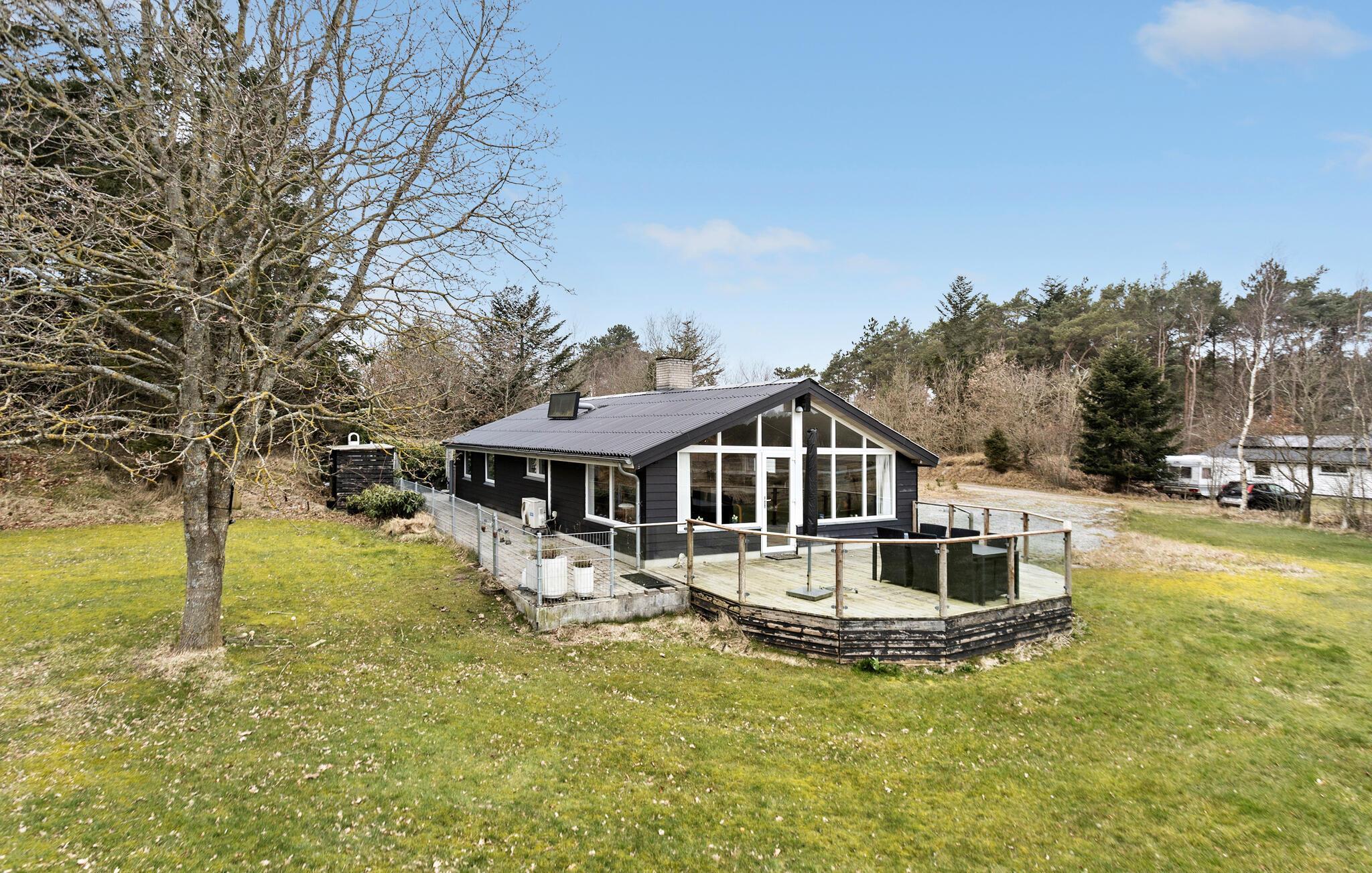 Hyggeligt feriehus nær Lyngsås strand med stor terrasse, roligt landskab og plads til aktiviteter.