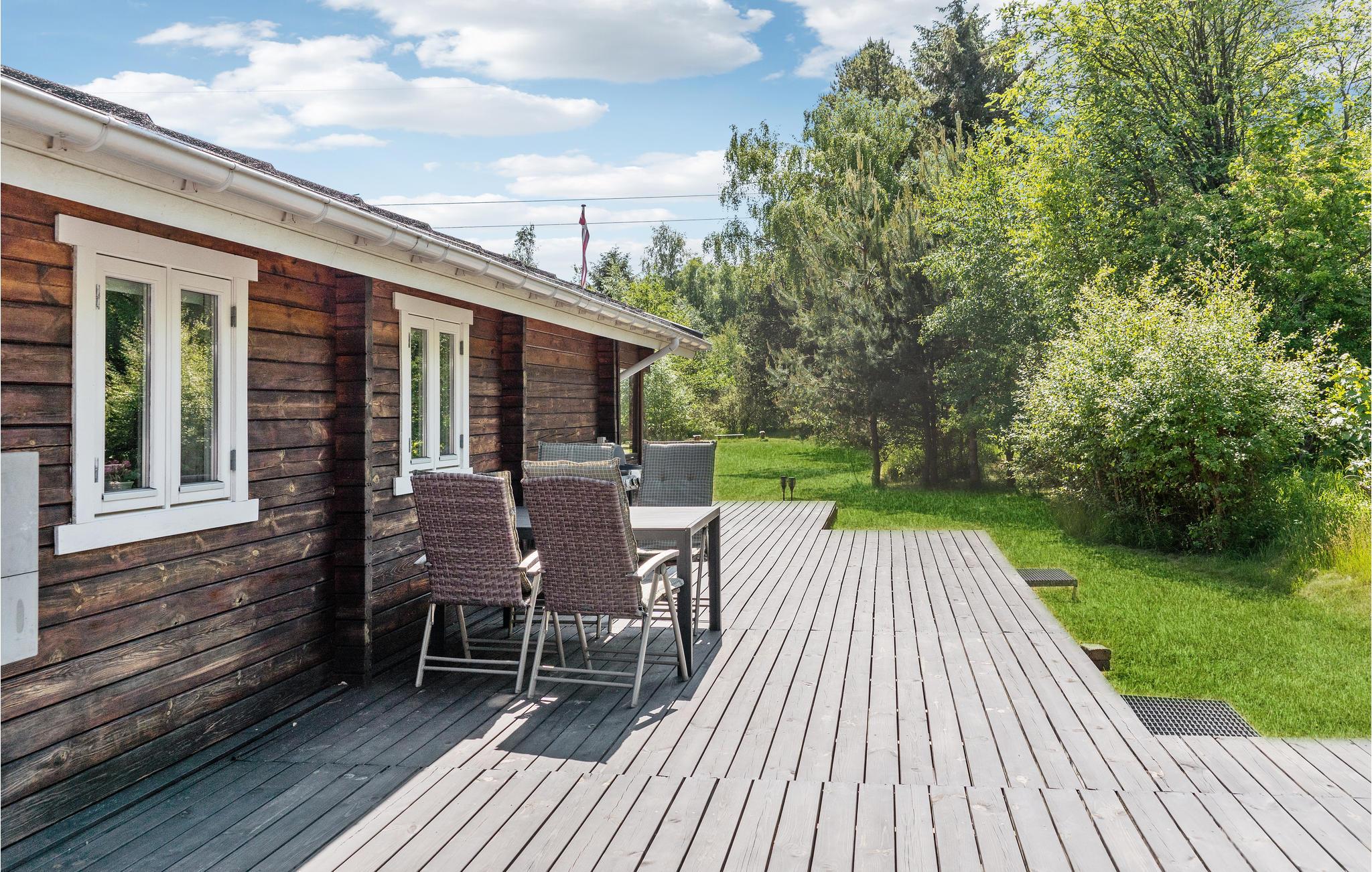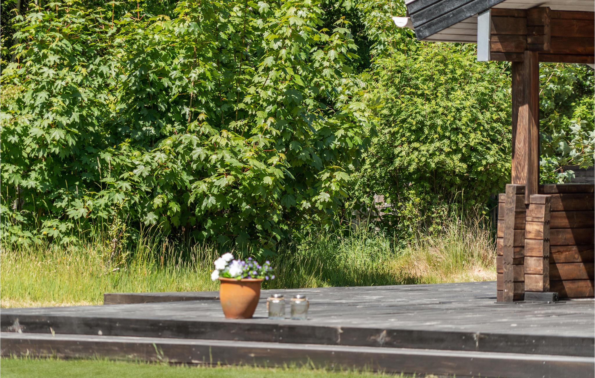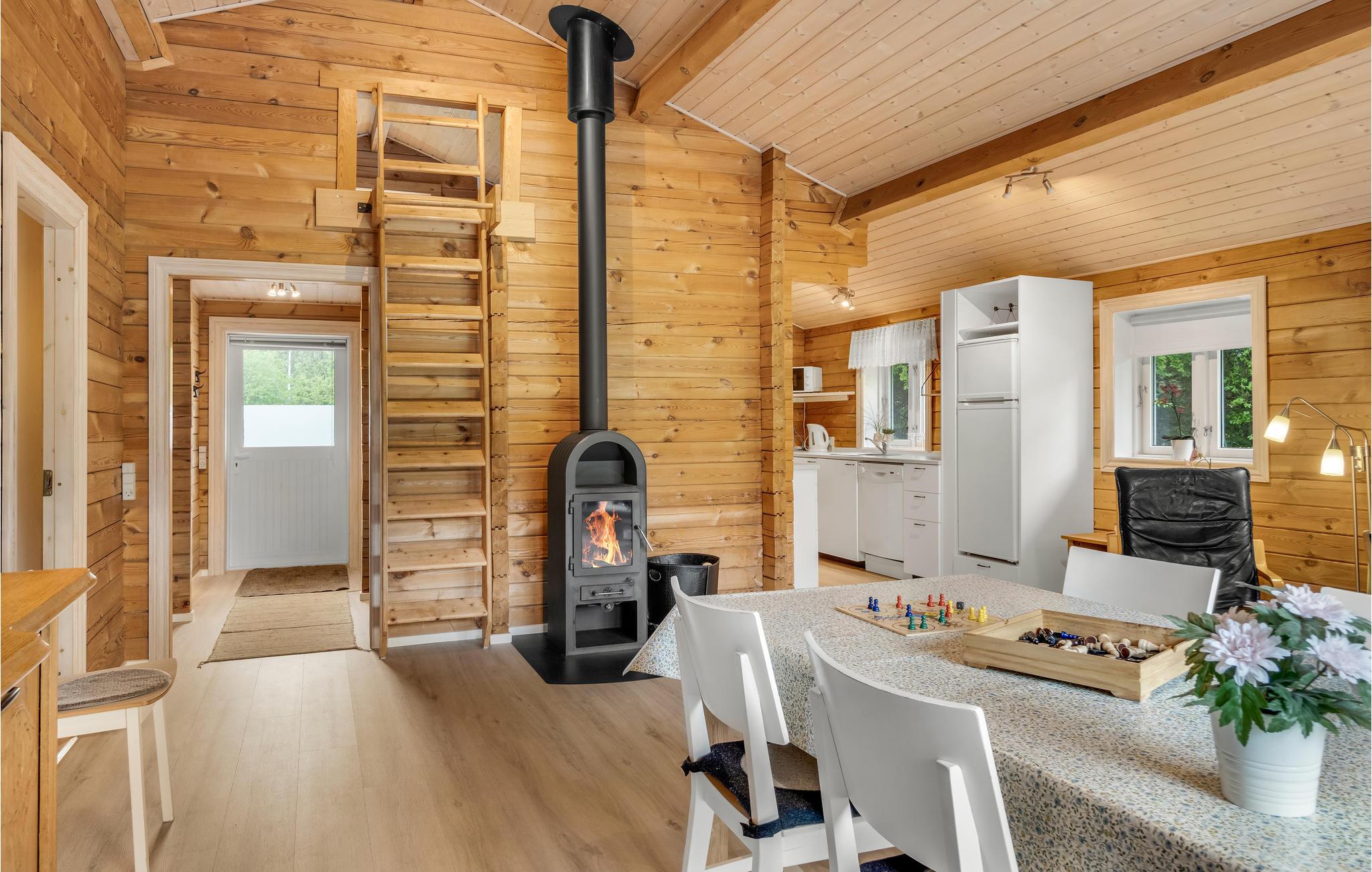 Velkommen til dette indbydende feriehus med rustik charme på en dejlig ugeneret grund omgivet af frodig natur. De rustikke materialer tilfører huset et varmt udtryk, og den åbne planløsning giver mulighed for ekstra nærvær. Her kan I tale sammen, uanset hvad I hver især laver. Måske tegner jeres børn ved spisebordet eller spiller kort på sofaen, mens I tryller yndlingsretterne frem i køkkenet? Efter en aktiv dag kan I tænde op i brændeovnen og læne jer tilbage på sofaen. Udenfor tilbyder huset masser af plads til leg for hele familien. Mens I nyder solen på terrassen, kan jeres børn boltre sig på trampolinen eller måske gynge? Leg picnic i skyggen af træerne.