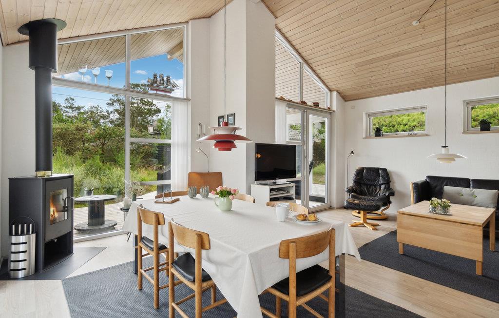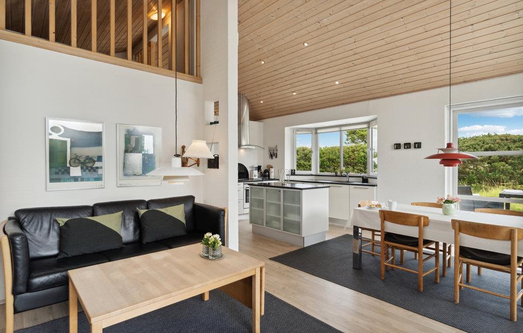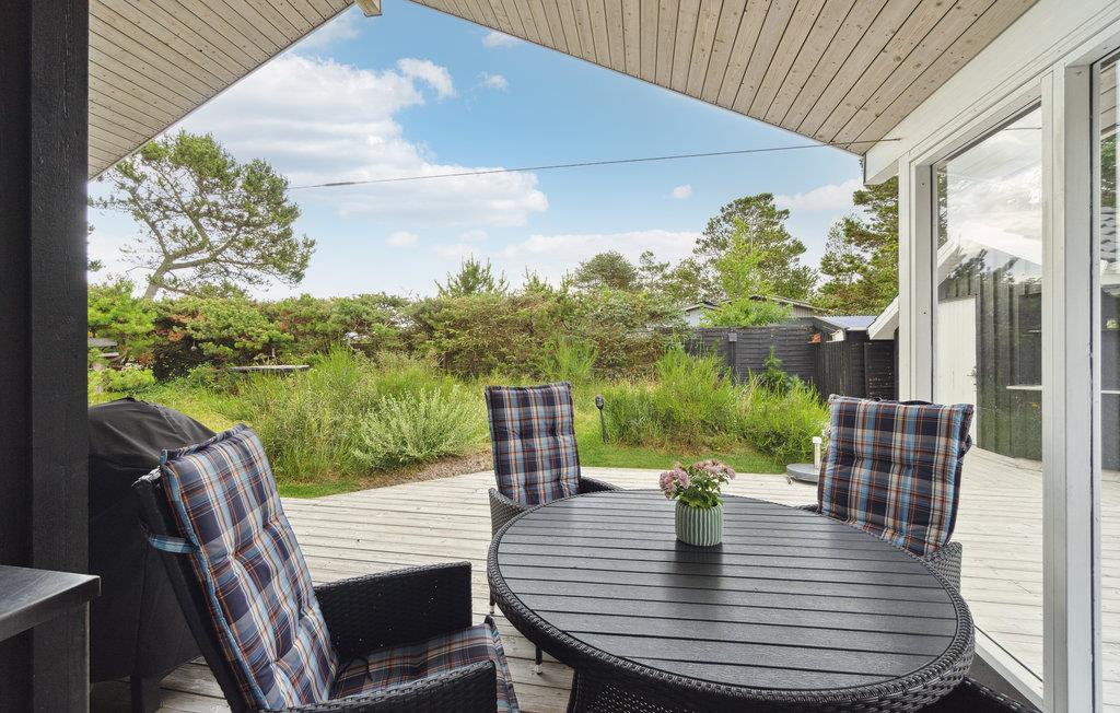 Med en attraktiv beliggenhed, kun få skridt fra klitterne og sandstranden, finder I dette fantastiske feriehus. Det er smagfuldt indrettet og danner de ideelle rammer for en ubekymret ferie med fred, komfort og velvære. Tilbered jeres yndlingsretter sammen i det store køkken, mens I nyder udsigten over omgivelserne. I den store, lyse stue vil I tilbringe mange hyggelige timer med dem, I holder af, hvad enten I spiller brætspil eller læser den udvalgte feriebog. Efter en dag i den friske luft kan I finde hyggelig varme i saunaen og få masseret musklerne i boblebadet. Den rummelige træterrasse går næsten rundt om hele huset og giver ideelle muligheder for at slappe af og solbade i løbet af dagen. De små kan lege på naturgrunden, og der er også et shelter, hvis man vil overnatte udenfor med kig til stjernerne.