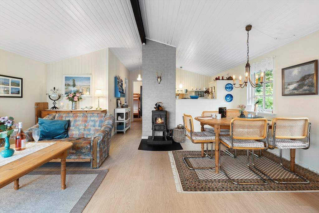 Det røde træsommerhus har en velgennemtænkt planløsning på 50 m2, og rummene fremstår pæne og velholdte med mange moderne detaljer. For eksempel er der wi-fi og fladskærms-tv med Chromecast inden døre – men hvis du vil surfe på internettet eller streame serier, er du dog nødt til at kunne fjerne blikket fra de betagende fjordomgivelser, der breder sig lige udenfor vinduerne. Udsigten til vandet og den kønne kyststrækning kan nydes fra både opholdsstuen og den tilstødende udestue, og et meget smukkere bagtæppe om ferielivet er svært at finde. Stuens brændeovn er med til at skrue op for hyggestemningen på kølige dage, mens køkkenet står klar, uanset om du vil skære vandmelon og lave is kaffe eller diske op med noget mere nærende. Soveværelser er der to af, så huset kan passende rumme en familie på fire.