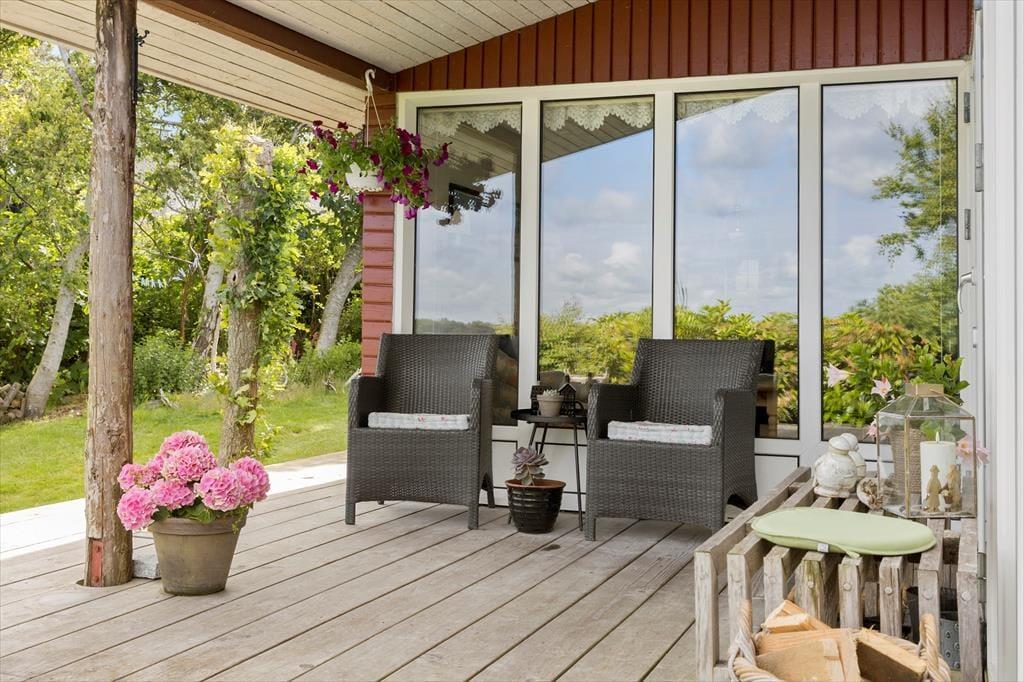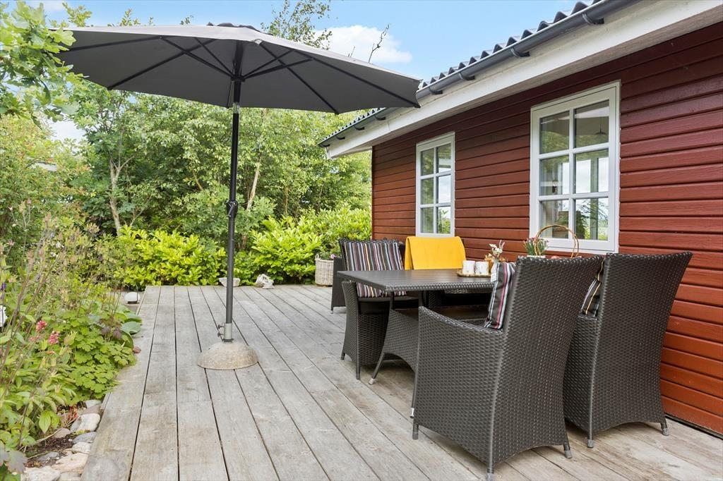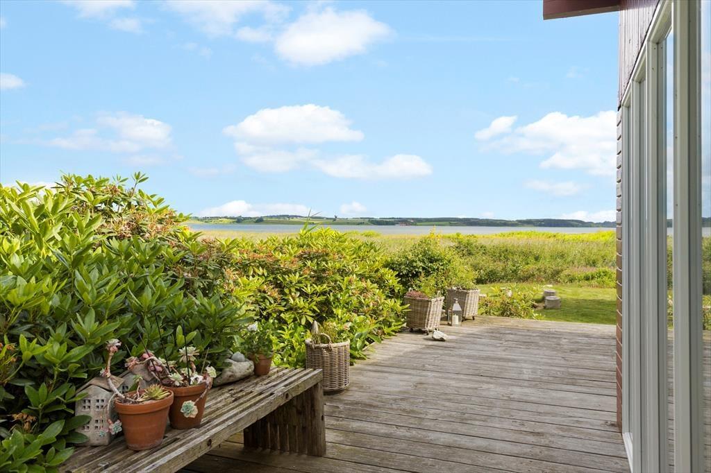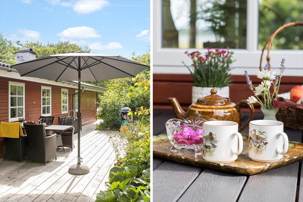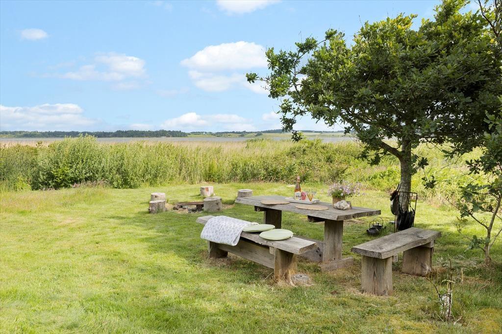 På en solbeskinnet sommerdag har du sikkert ikke lyst til at sidde inde nær brændeovnen, og måske er det for varmt selv at være i udestuen. I så fald kan træterrassen være din redning, for den breder sig hele vejen rundt om sommerhuset, så der er flere dejlige opholdspladser at vælge imellem. Terrassen er delvist overdækket og godt afskærmet af naturgrundens buske og træer – men ud mod vandet er der naturligvis mere åbent, så du får rig mulighed for at sidde og falde i staver over fjord-idyllen. På grunden er der en god græsplæne at lege på, og alle outdoor-typer vil sikkert blive begejstrede over bålpladsen, hvor I kan tilberede hele aftensmaden over åben ild, hvis I lyster.