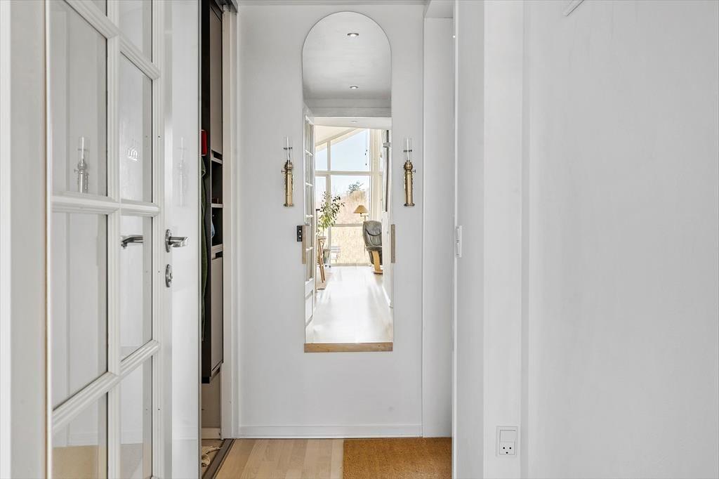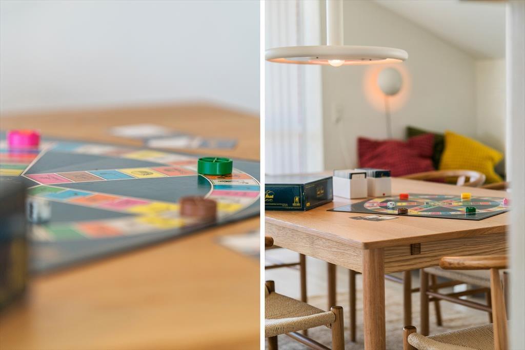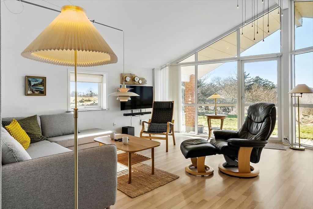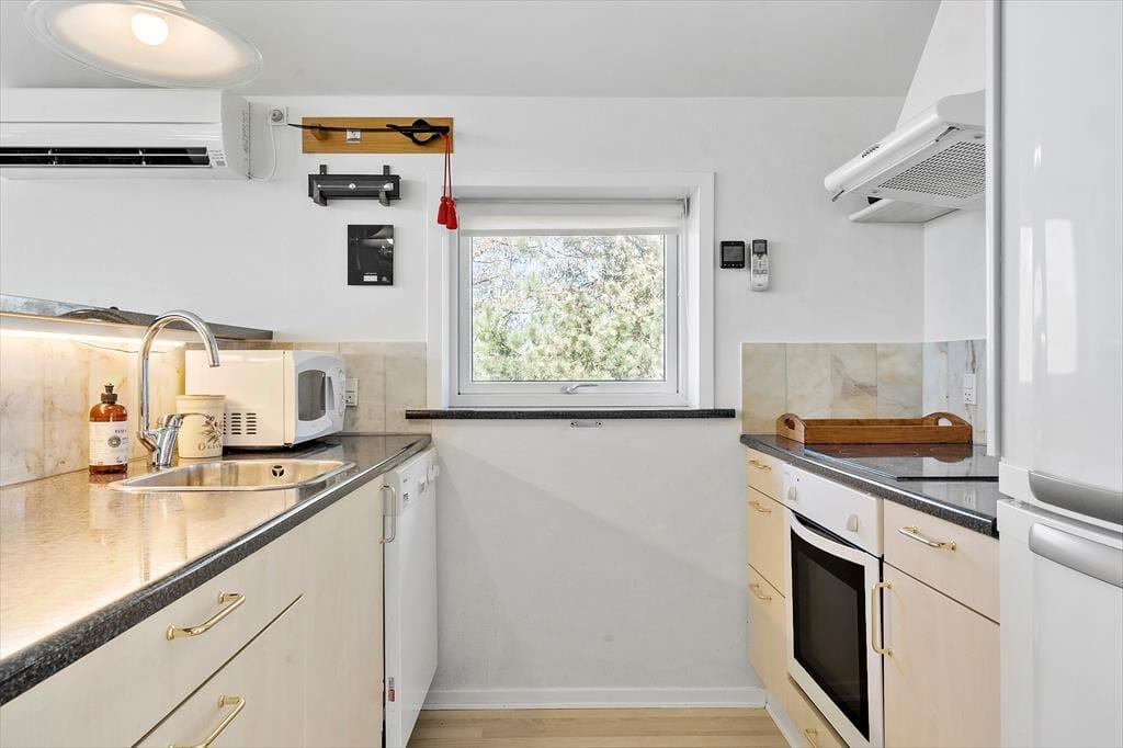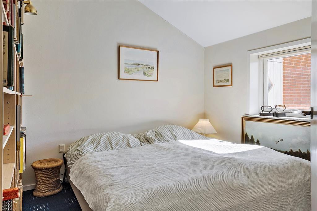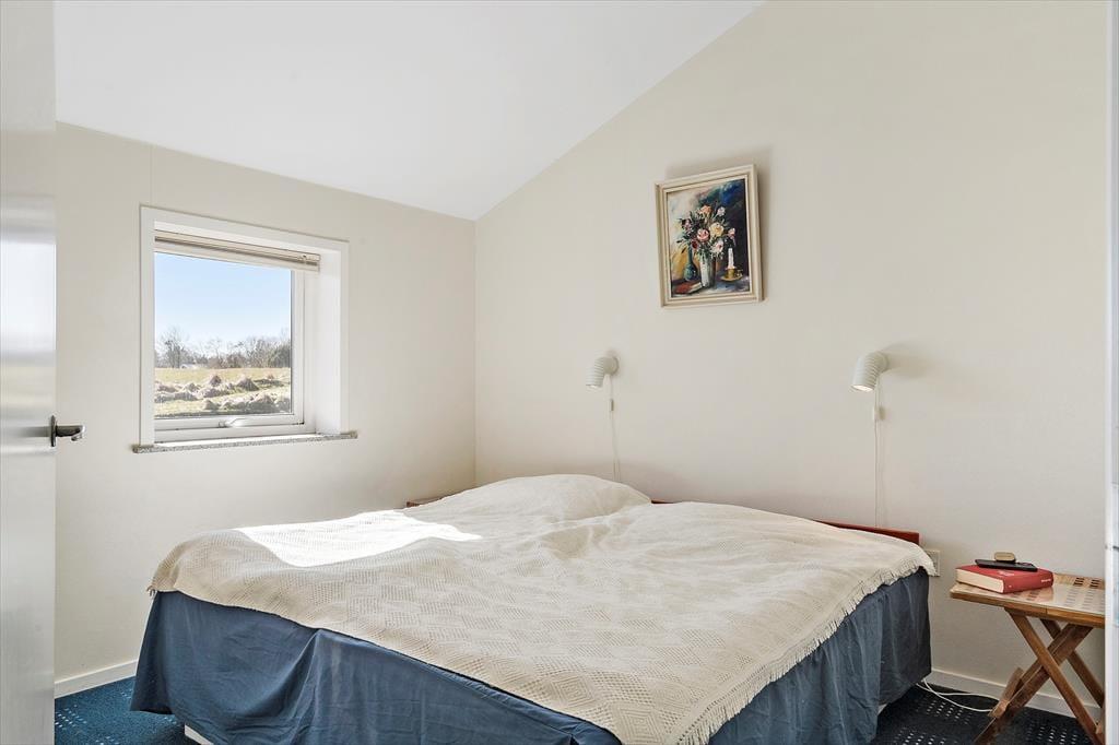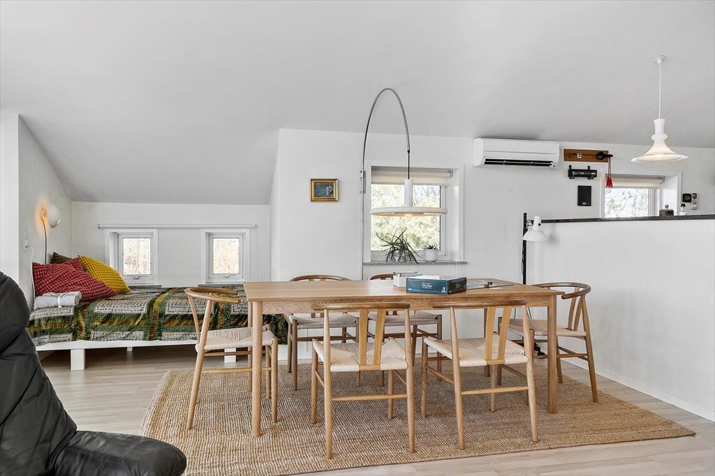 Det charmerende sommerhus har en lys og indbydende indretning, der skaber en varm og hjemlig stemning. Stuen og køkkenet ligger i åben forbindelse, så familien kan samles til hyggelige stunder, hvad enten det er til en god middag eller en aften med brætspil og snak. Store vinduer lader lyset strømme ind, og den hyggelige atmosfære understreges af de venlige farvetoner og den enkle, men indbydende møblering. Der er god plads til seks personer, så uanset om du rejser med familie eller venner, er der rum til alle.