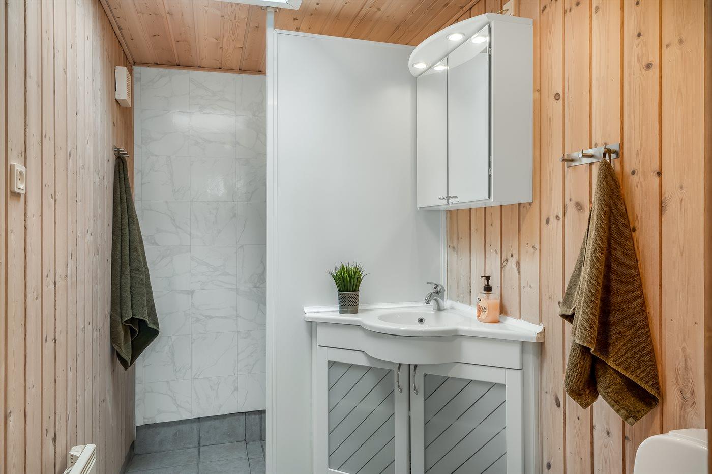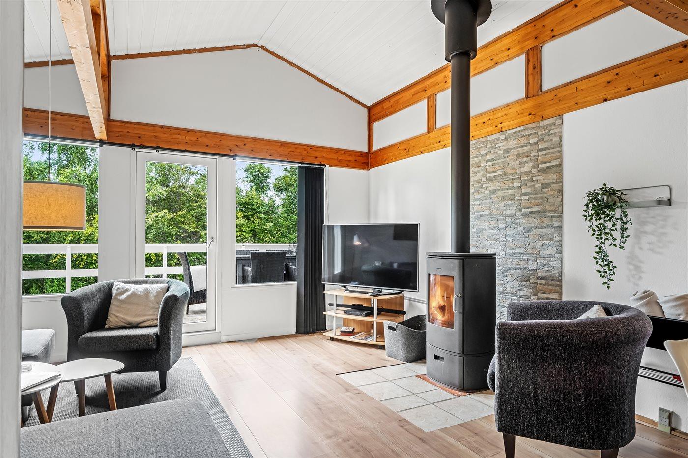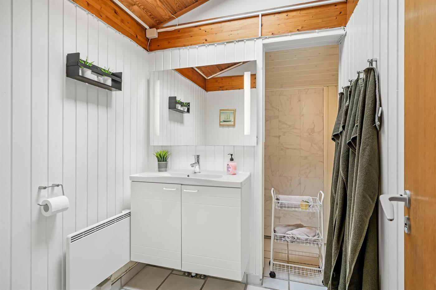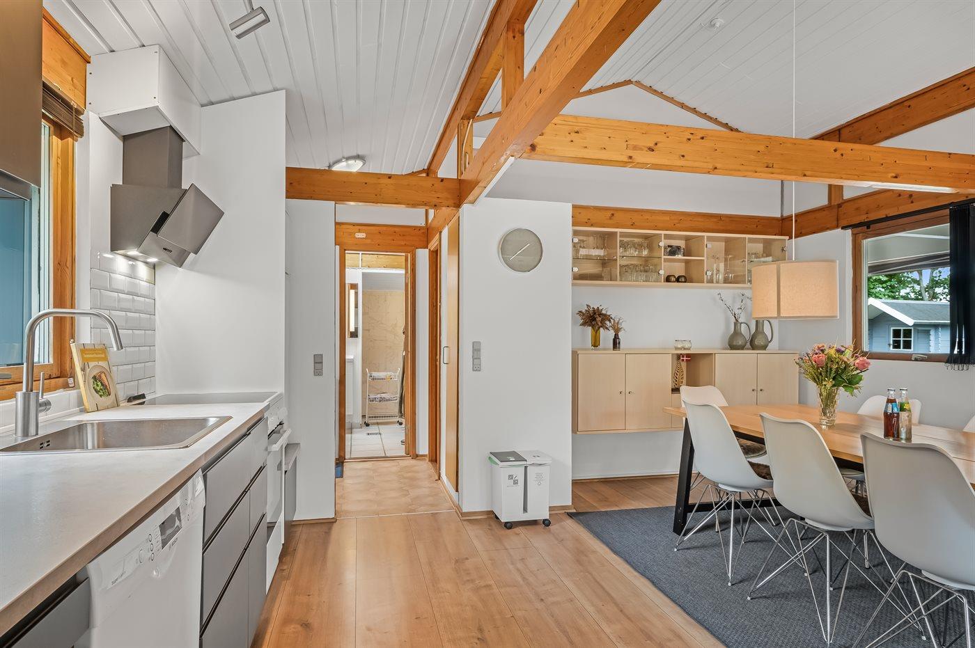 Et flot, nyrenoveret sommerhus med 4 soveværelser og 2 badeværelser beliggende i et dejligt, roligt sommerhusområde. Huset ligger højt på en lille skråning og er totalrenoveret i 2020/2021. Renoveringen omfatter bl.a. lækkert køkken-alrum med energibesparende varmepumpe, loft til kip, synlige bjælker, udgang til overdækket terrasse. Smuk opholdsstue med brændeovn med smuk stenvæg bagved, udgang til stor udsigtsterrasse med udsigt over området. Der er 2 dejlige badeværelser, begge med stor bruseniche, klinkegulv med gulvvarme og skabsmiljø. I det ene badeværelse er der ligeledes vaskesøjle med vaskemaskine og tørretumbler. Sovepladserne fordeler sig på 4 skønne soveværelser; 1 værelse med 1 køjeseng, 1 værelse med 2 enkeltsenge, 1 værelse med dobbeltseng, hvorfra der er udgang til den overdækkede terrasse samt 1 ekstraordinært stort værelse med 1 dobbeltseng og ovenlysvindue. Pæn entrè og gang. Hurtigt internet på hele 150 Mbit. Flot aktivitetsrum på 70 m2 med billardbord, bordtennis, bordfodbold og hjemmebiograf i husets kælderetage.